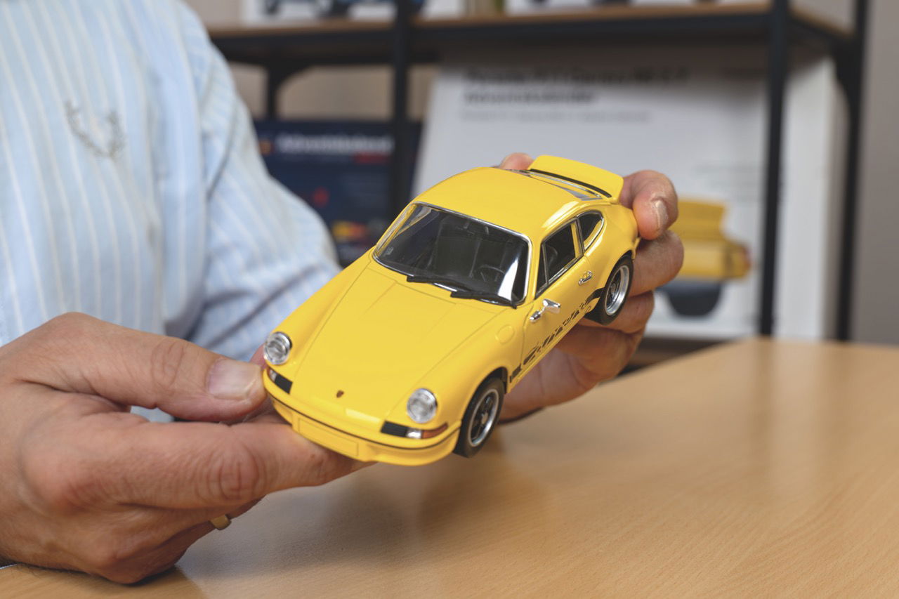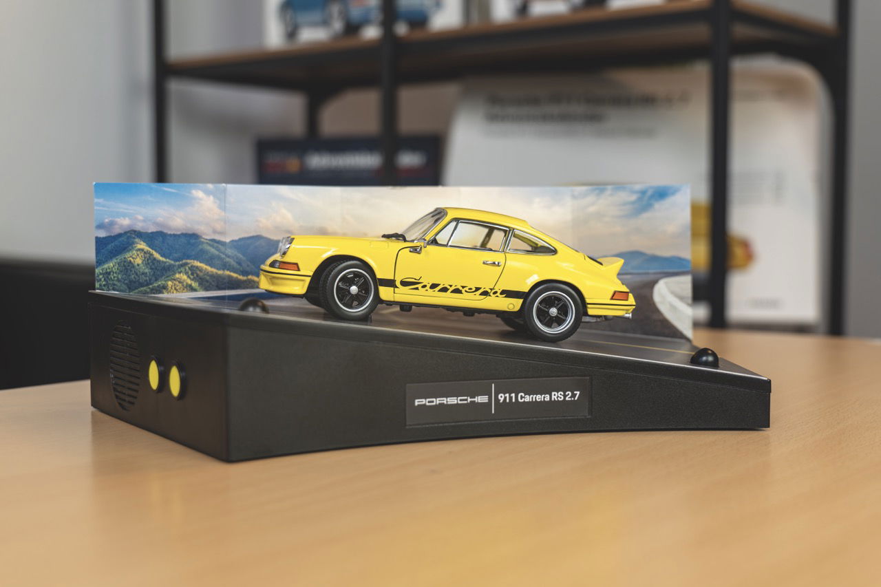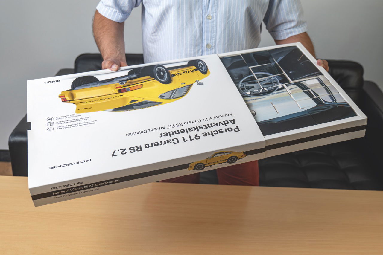 - ein detailgetreues Modell des Porsche 911 Carrera RS 2.7 als zehnteiliger Bausatz im Maßstab 1:24 – exklusiv für diesen Adventskalender in Hellgelb