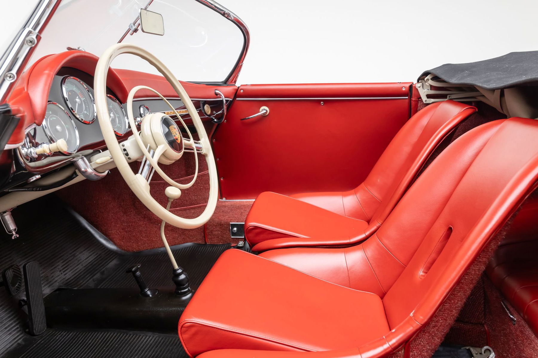 The paintwork is in superb condition, repainted by European Collectibles in 2017, complemented by the brightwork and aluminum trim. The gaps and panel fit are excellent throughout. The interior is finished in Red vinyl with Speedster seats, Red German square-weave carpets, a black canvas soft top, a black boot cover, VDO instrumentation, and an original VDM steering wheel with a deluxe horn ring. Date-coded Lemmerz 4½” x 15″ chrome-slotted wheels are mounted on Pirelli Cinturato CN36 tires (dated 2022), further enhancing authenticity. The undercarriage is solid and rust-free, and the suspension components and undercarriage have been beautifully detailed.
