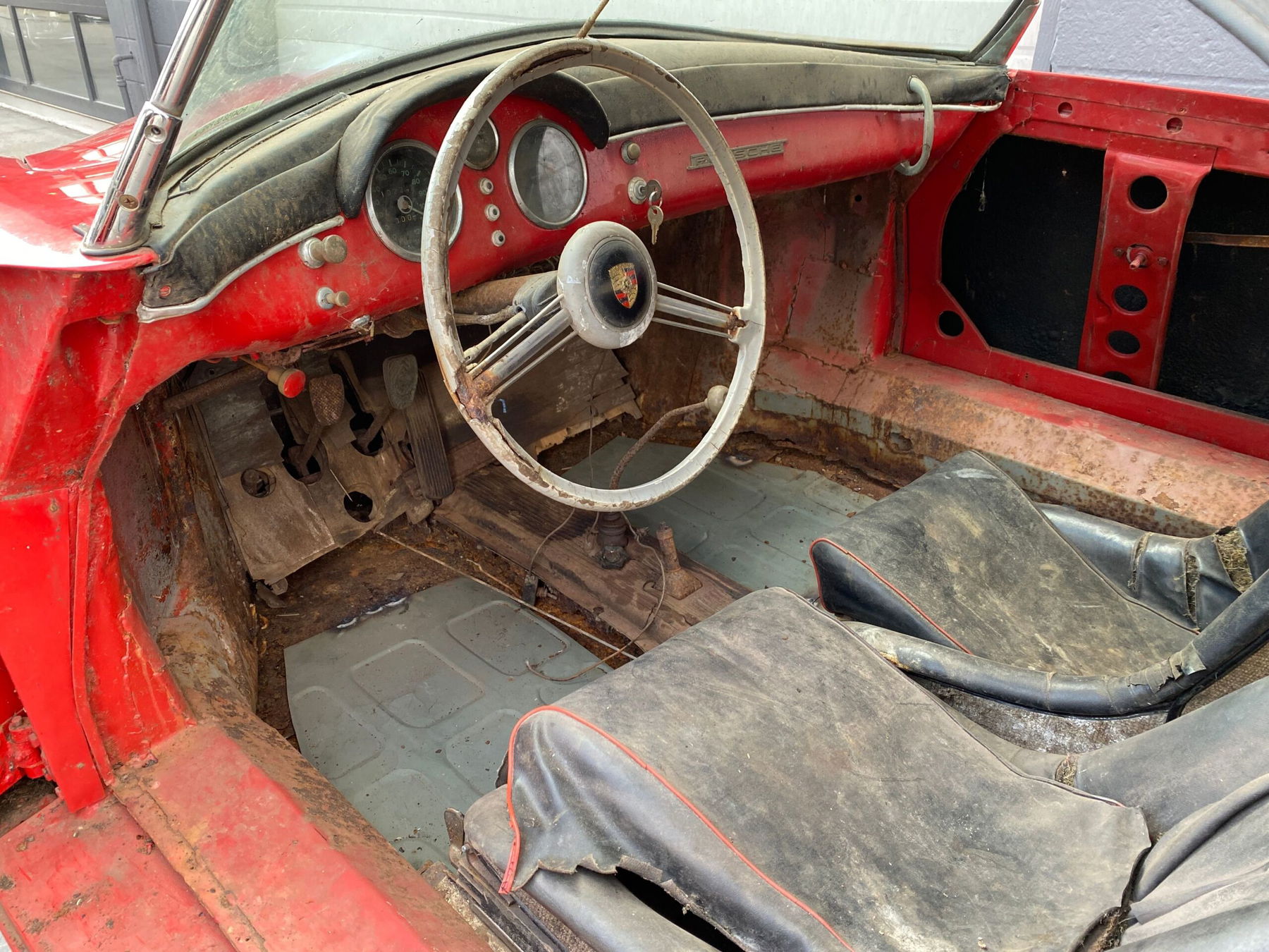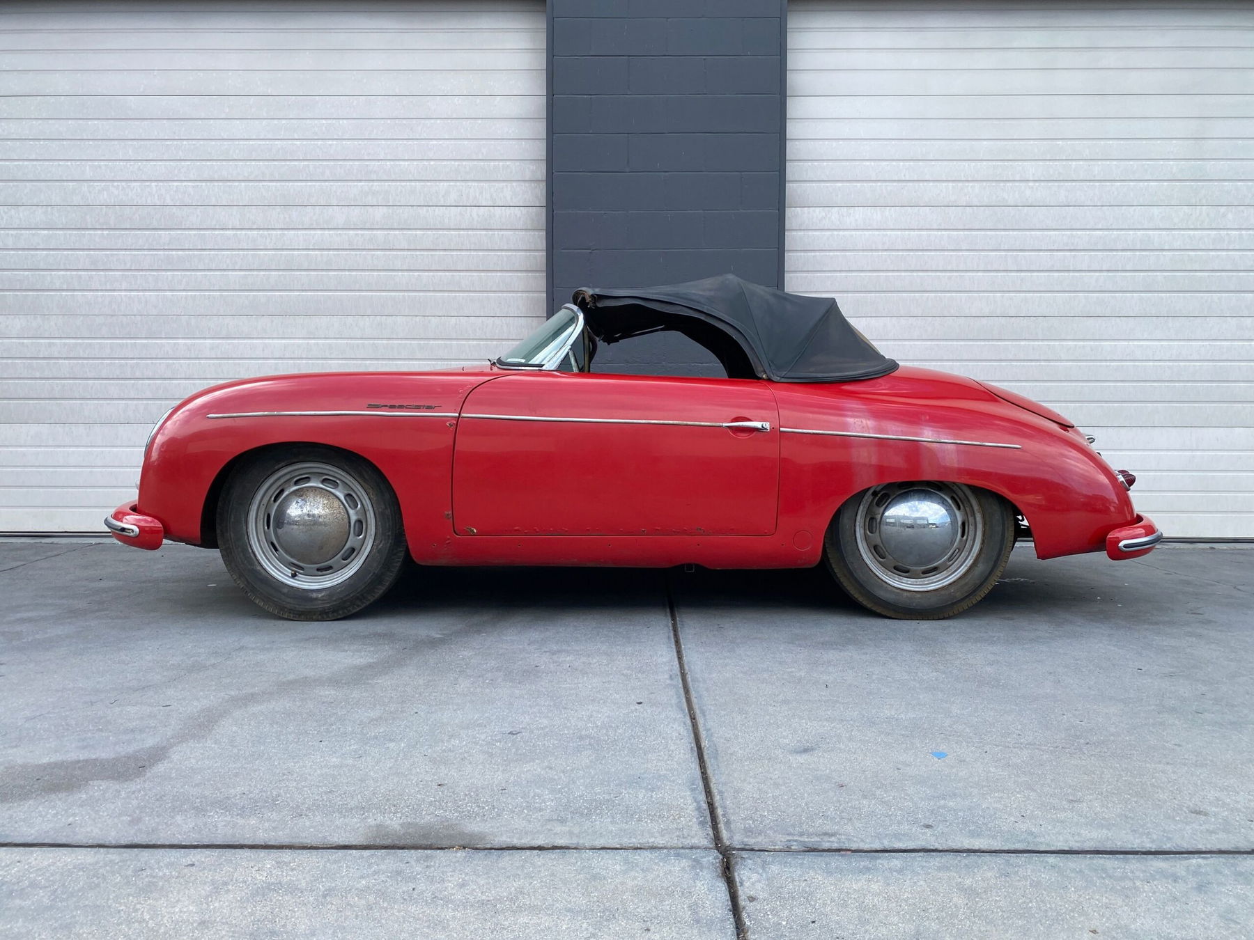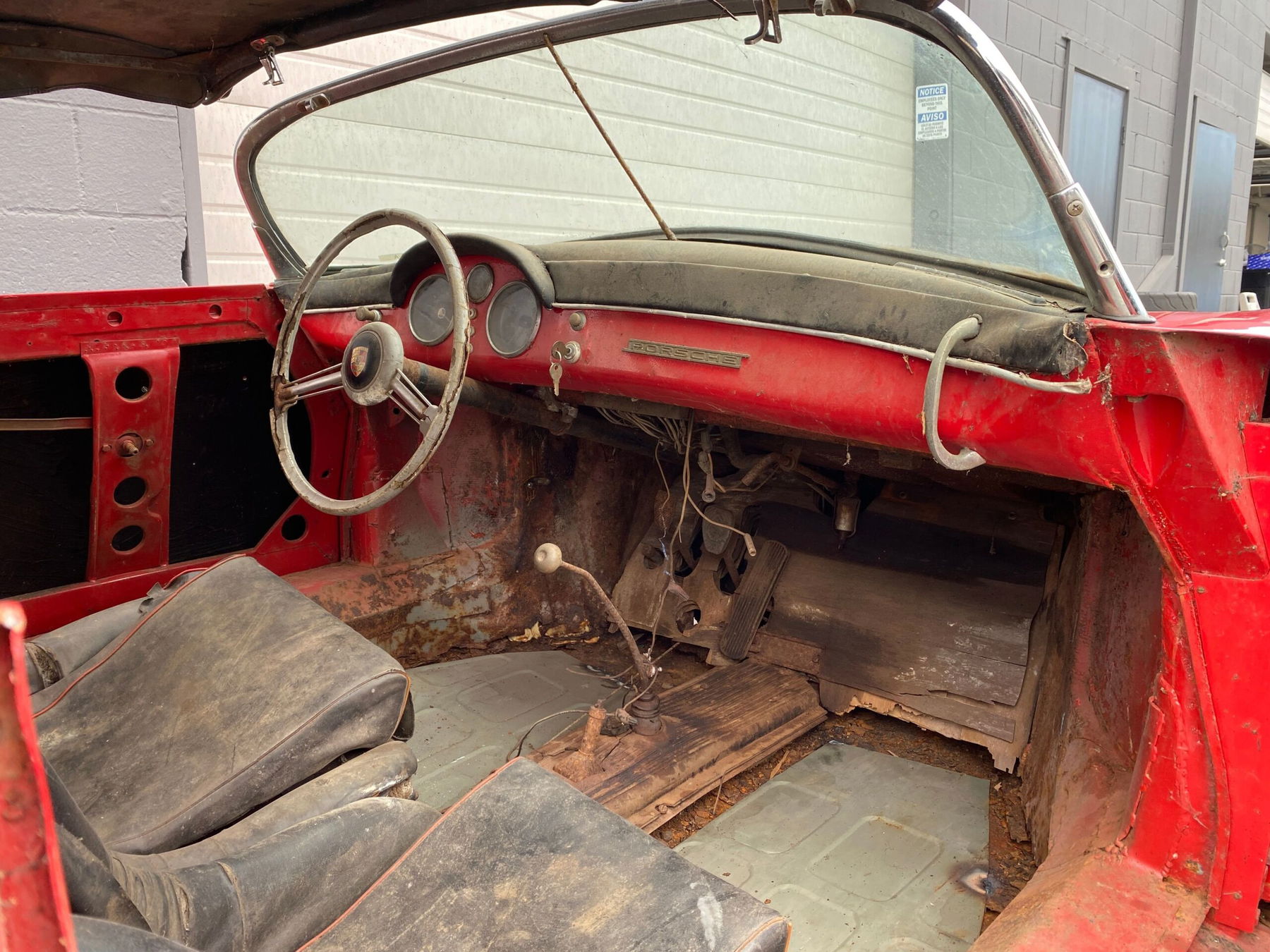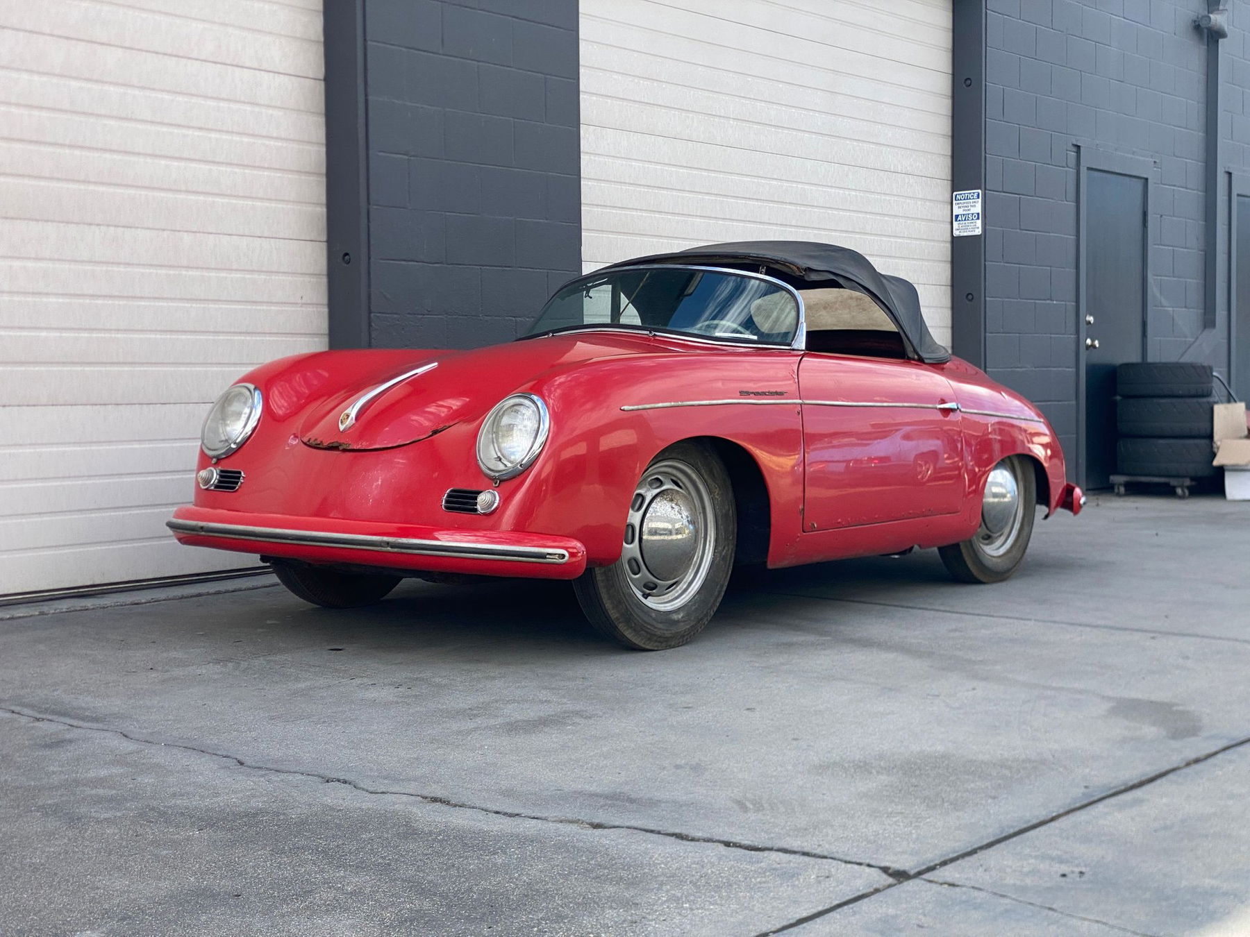 Long-term single-family ownership for the past 54 years. According to the Porsche Kardex, this Pre-A Speedster was delivered by Hoffman Motors in New York, New York, and finished in Signal Red (color code 601) with Black upholstery. Factory options include sealed beam headlights and a Speedometer in miles. According to the previous owner, this Speedster was last driven in the late 1970s before going into long-term storage for the next four decades. The interior features VDO instrumentation, Speedster seats, door panels, Speedster door caps, and a VDM steering wheel. The exterior is basically complete, including the chrome windshield frame, soft-top frame, bumpers, bumperettes, and 3.25” x 16” painted steel slotted wheels (dater coded 9/55). The undercarriage will need rust repair, including the battery box floor, floor pans, longitudinals, and closing panels. Mechanically, this Speedster is not running or driving. It does have the matching 1600cc engine (Type 616/1), a manual 4-speed transmission (Type 519), and four-wheel drum braking system. Complete with the Porsche Kardex and soft top. Speedster projects are getting harder and harder to find. This is an incredible opportunity to acquire a 356 Pre-A Speedster project needing restoration.