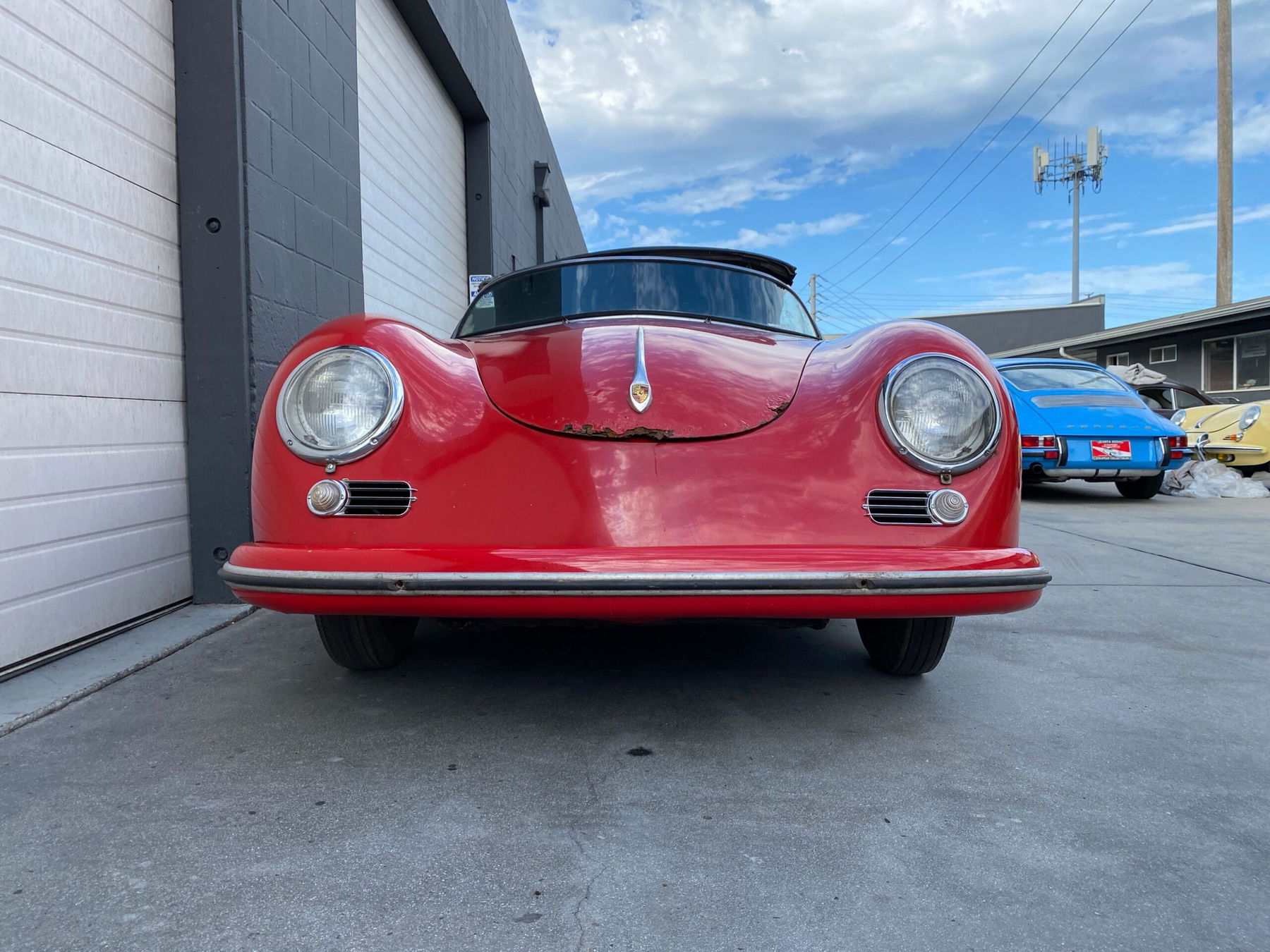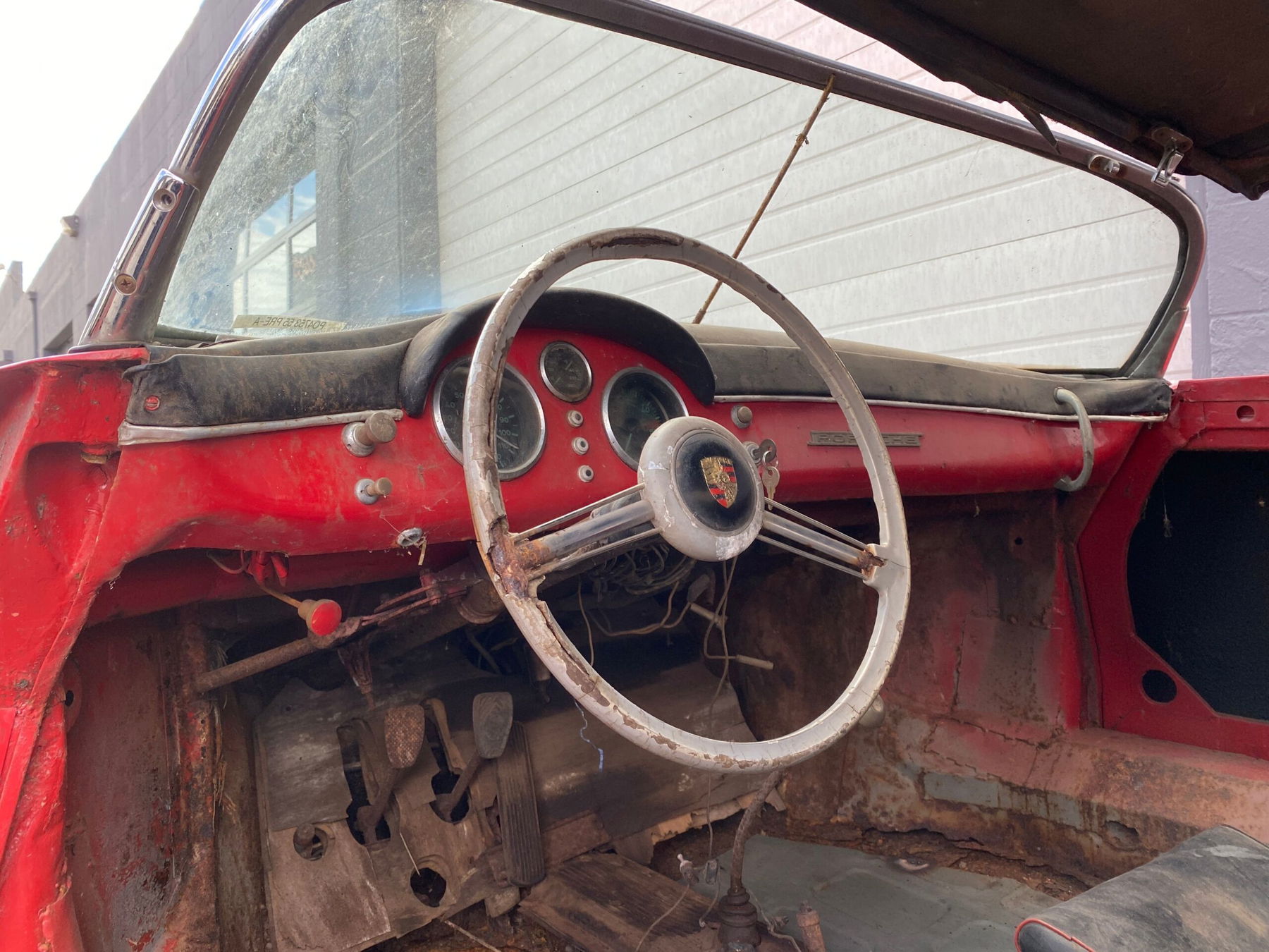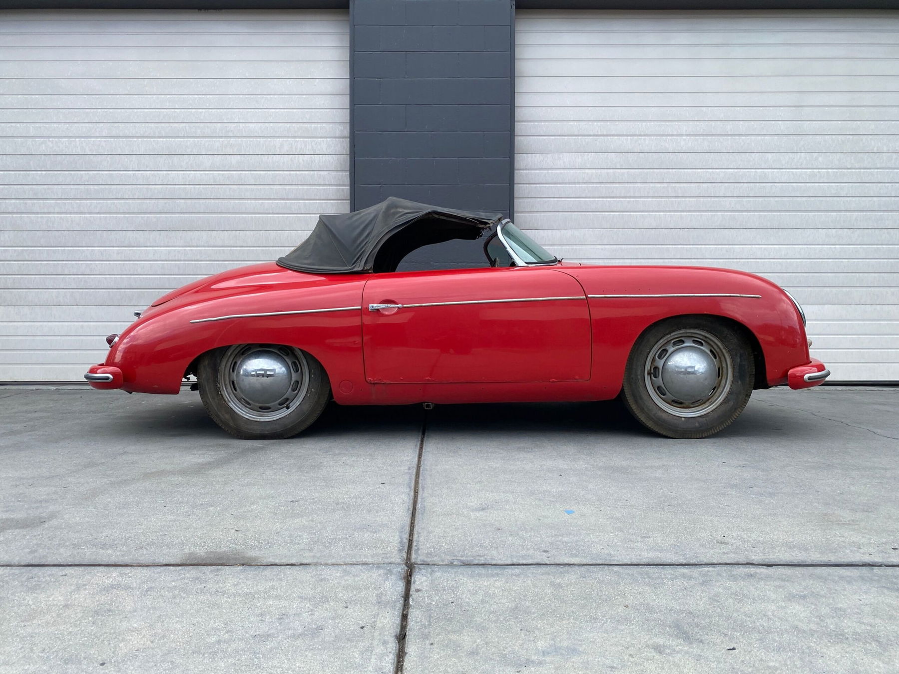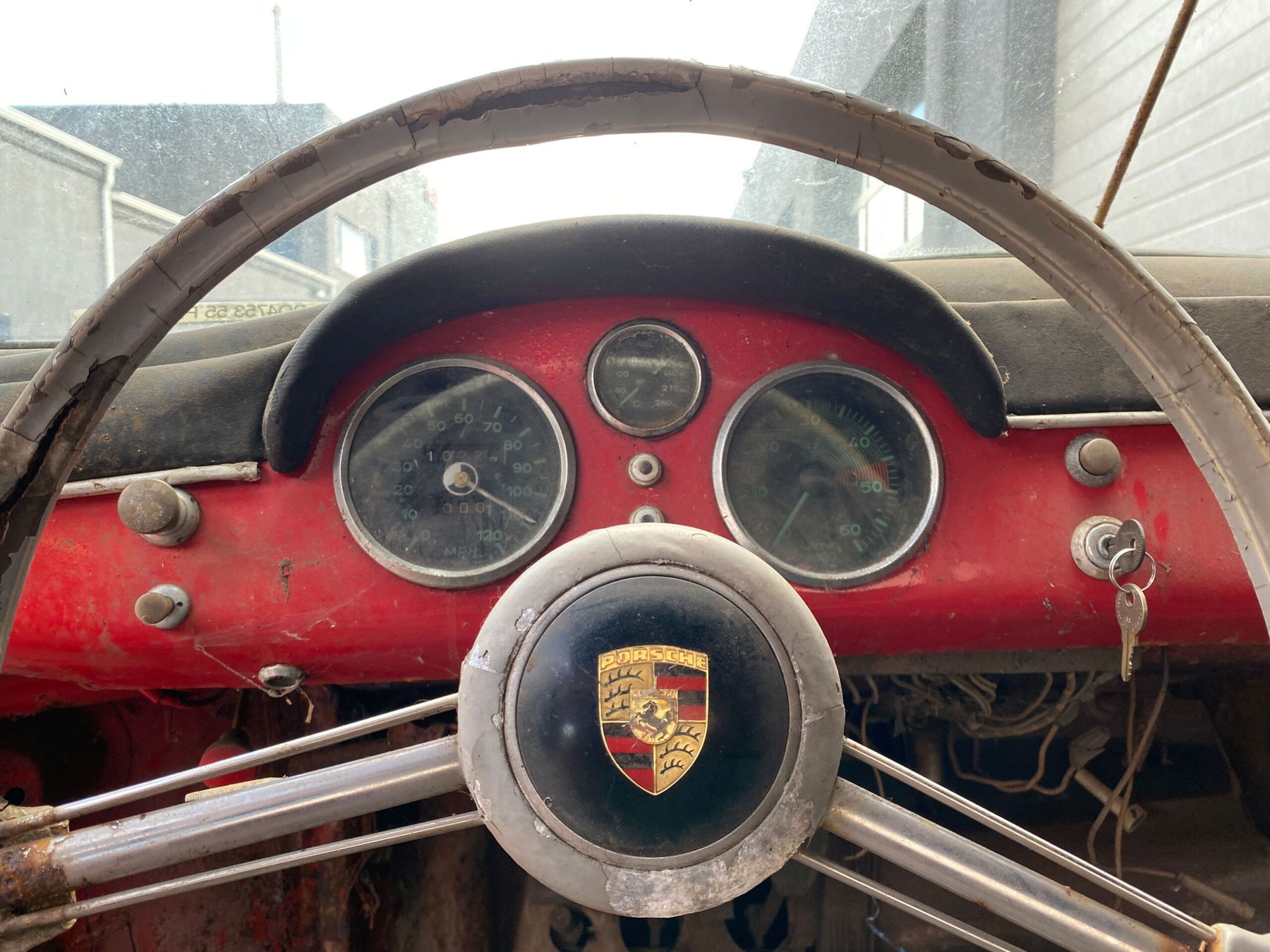 Long-term single-family ownership for the past 54 years. According to the Porsche Kardex, this Pre-A Speedster was delivered by Hoffman Motors in New York, New York, and finished in Signal Red (color code 601) with Black upholstery. Factory options include sealed beam headlights and a Speedometer in miles. According to the previous owner, this Speedster was last driven in the late 1970s before going into long-term storage for the next four decades. The interior features VDO instrumentation, Speedster seats, door panels, Speedster door caps, and a VDM steering wheel. The exterior is basically complete, including the chrome windshield frame, soft-top frame, bumpers, bumperettes, and 3.25” x 16” painted steel slotted wheels (dater coded 9/55). The undercarriage will need rust repair, including the battery box floor, floor pans, longitudinals, and closing panels. Mechanically, this Speedster is not running or driving. It does have the matching 1600cc engine (Type 616/1), a manual 4-speed transmission (Type 519), and four-wheel drum braking system. Complete with the Porsche Kardex and soft top. Speedster projects are getting harder and harder to find. This is an incredible opportunity to acquire a 356 Pre-A Speedster project needing restoration.