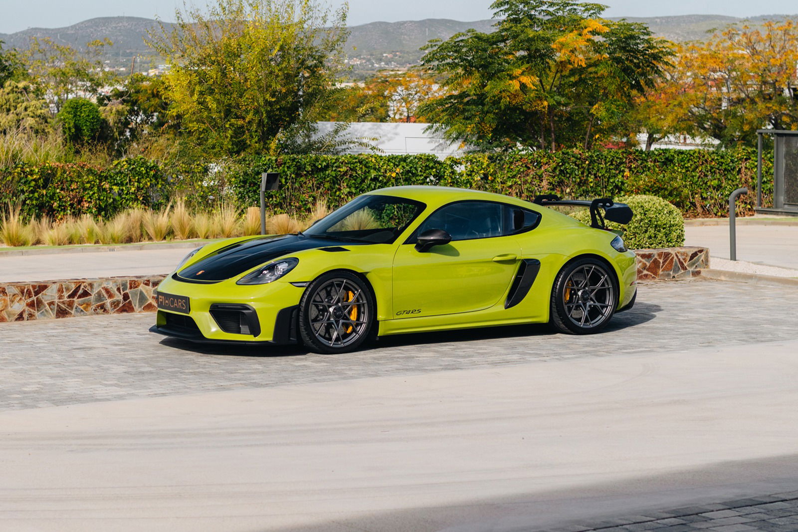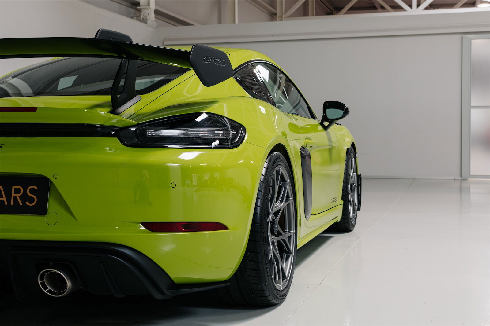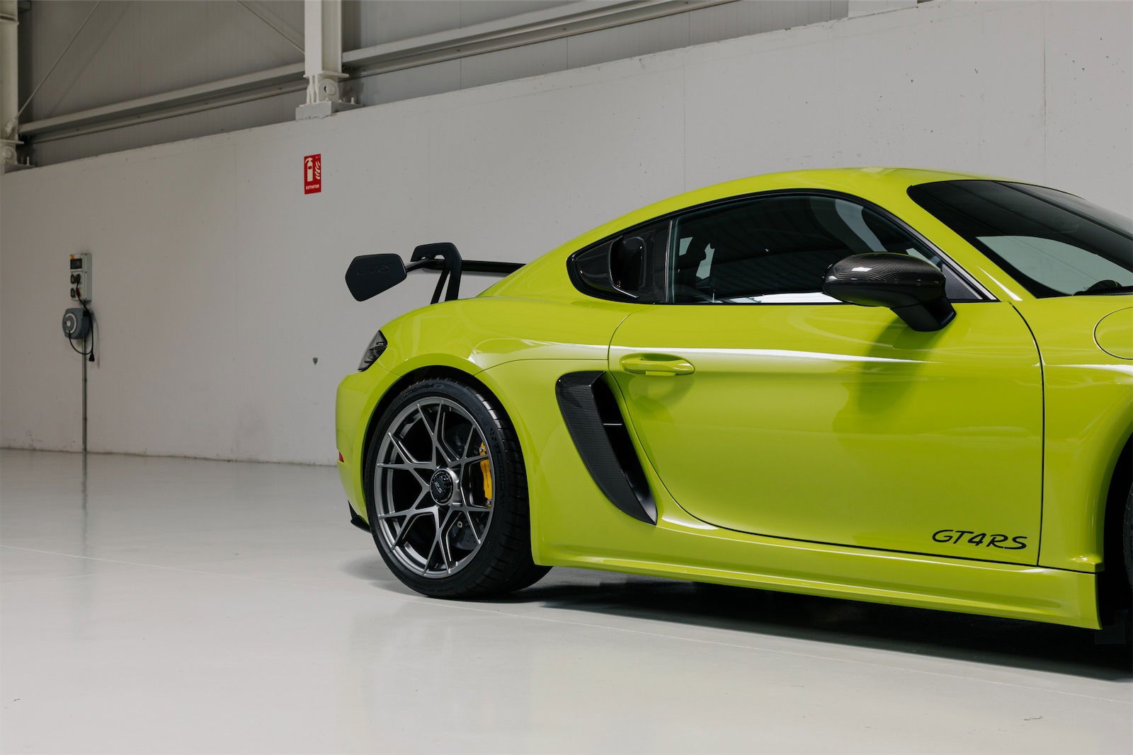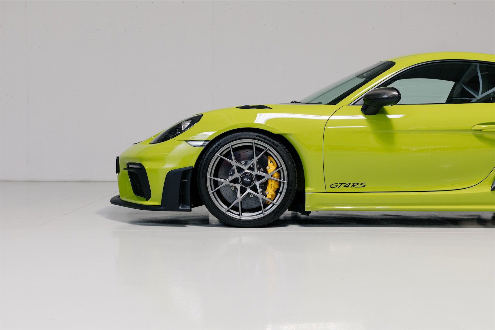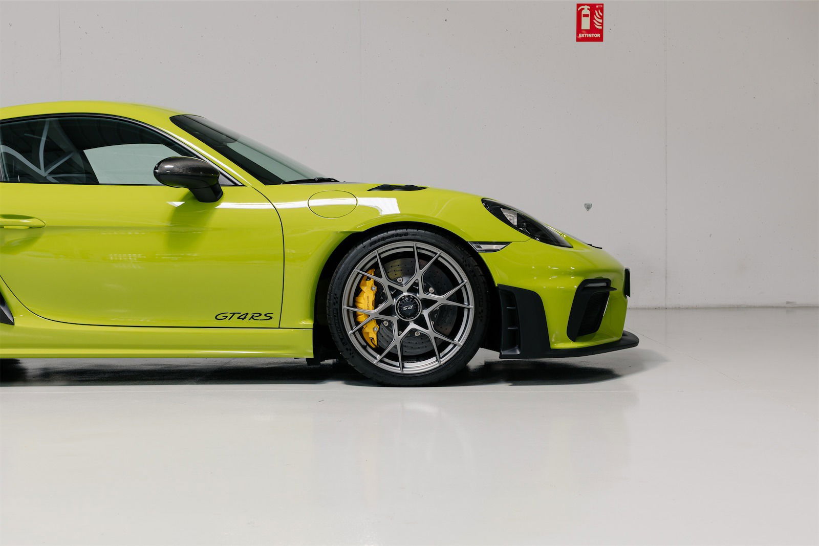 For sale: Porsche 718 Cayman GT4 RS in Paint to Sample (PTS) Lindengreen (Chartreuse). Equipped with Weissach Package, Porsche Ceramic Composite Brakes (PCCB) and Lift System. It has only 120 kilometres and is in new condition. The car comes with its original purchase invoice, service books, manuals, and the COC (Certificate of Conformity). A stunning example, ready to drive and enjoy. Feel free to get in touch with our team, we can help with transportation and delivery.