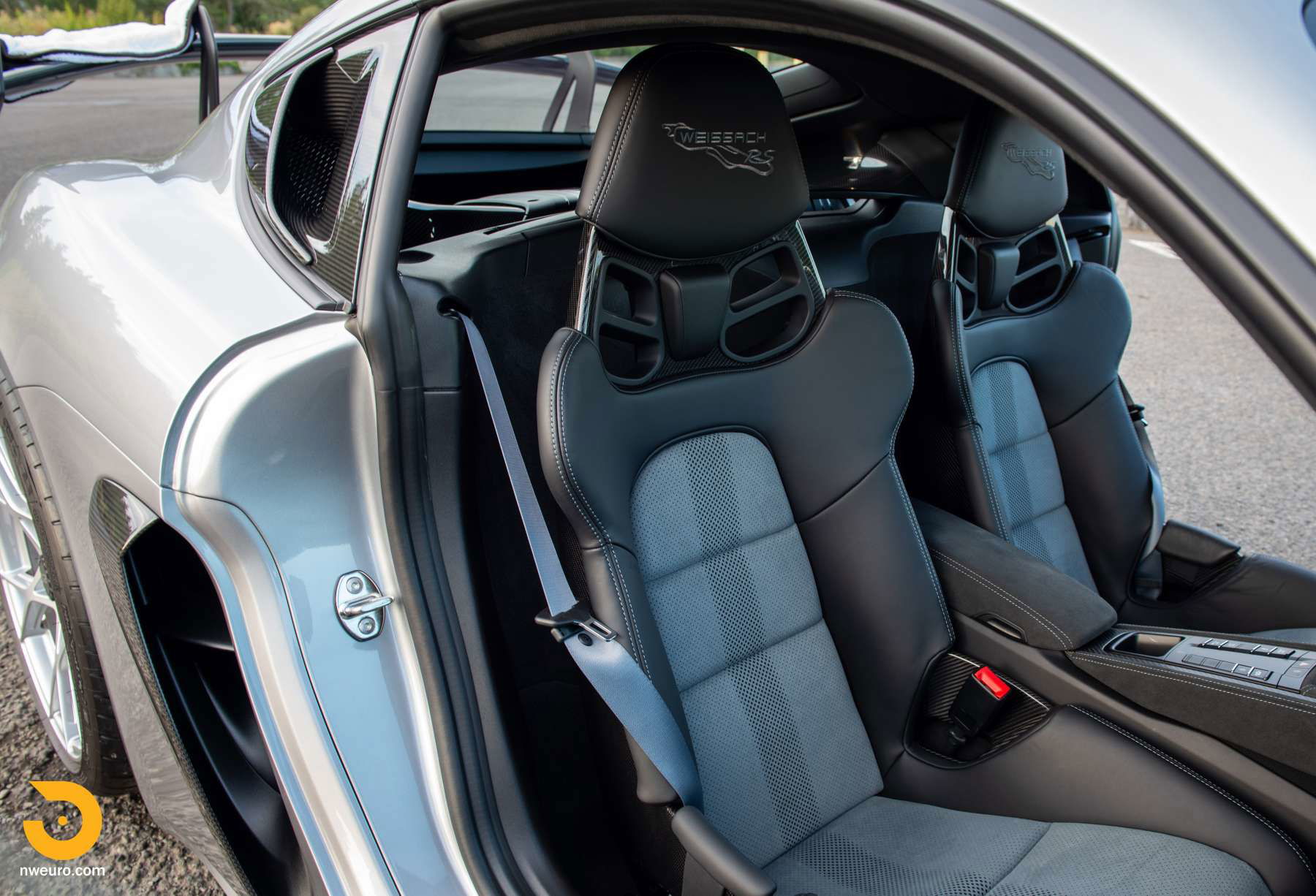 The interior is all business with a touch of luxury. The black leather interior has splashes of Race-Tex and alcantara, and highlights of Artic Grey stitching and seat belts in our example here. The Weissach Package on the interior brings the bespoke stitching on the seat headrests, a badge on the passenger side dash, and exposed carbon air intake runners behind your head. Can we talk about the engine air intake noise now? Surreal. Heavenly. Some of the best noises ever in a modern street car. We are fans.