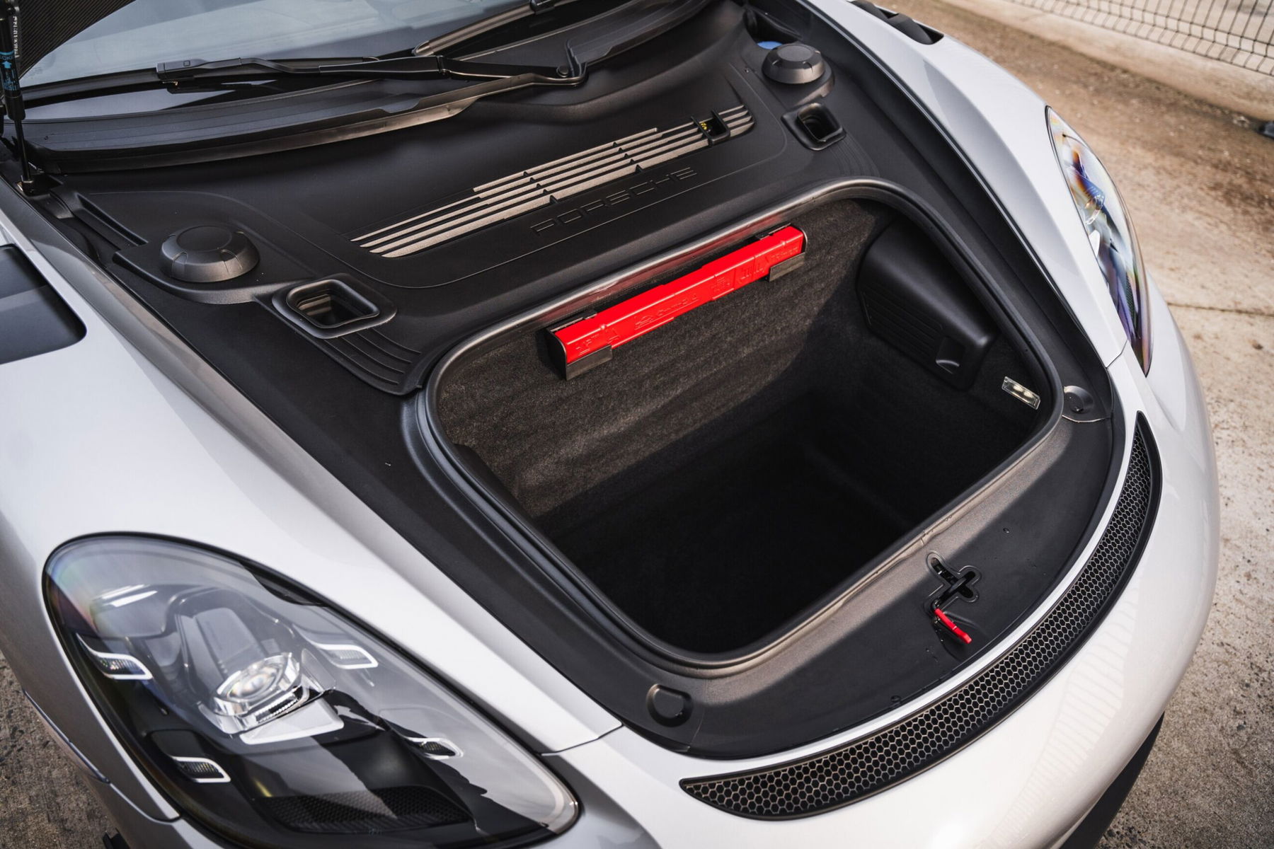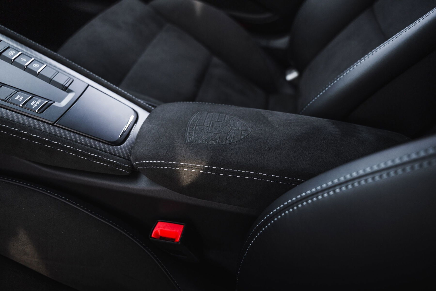 XLJ Porsche crest on storage compartment lid in Race-Tex – Porsche Exclusive Manufaktur