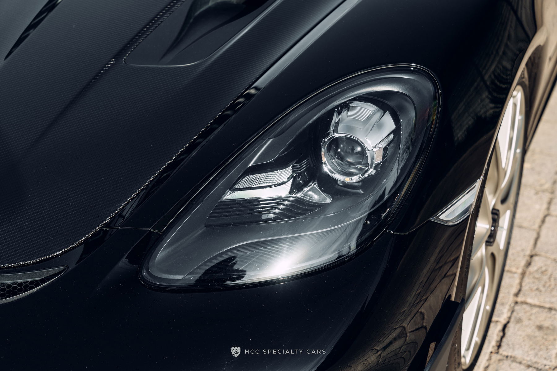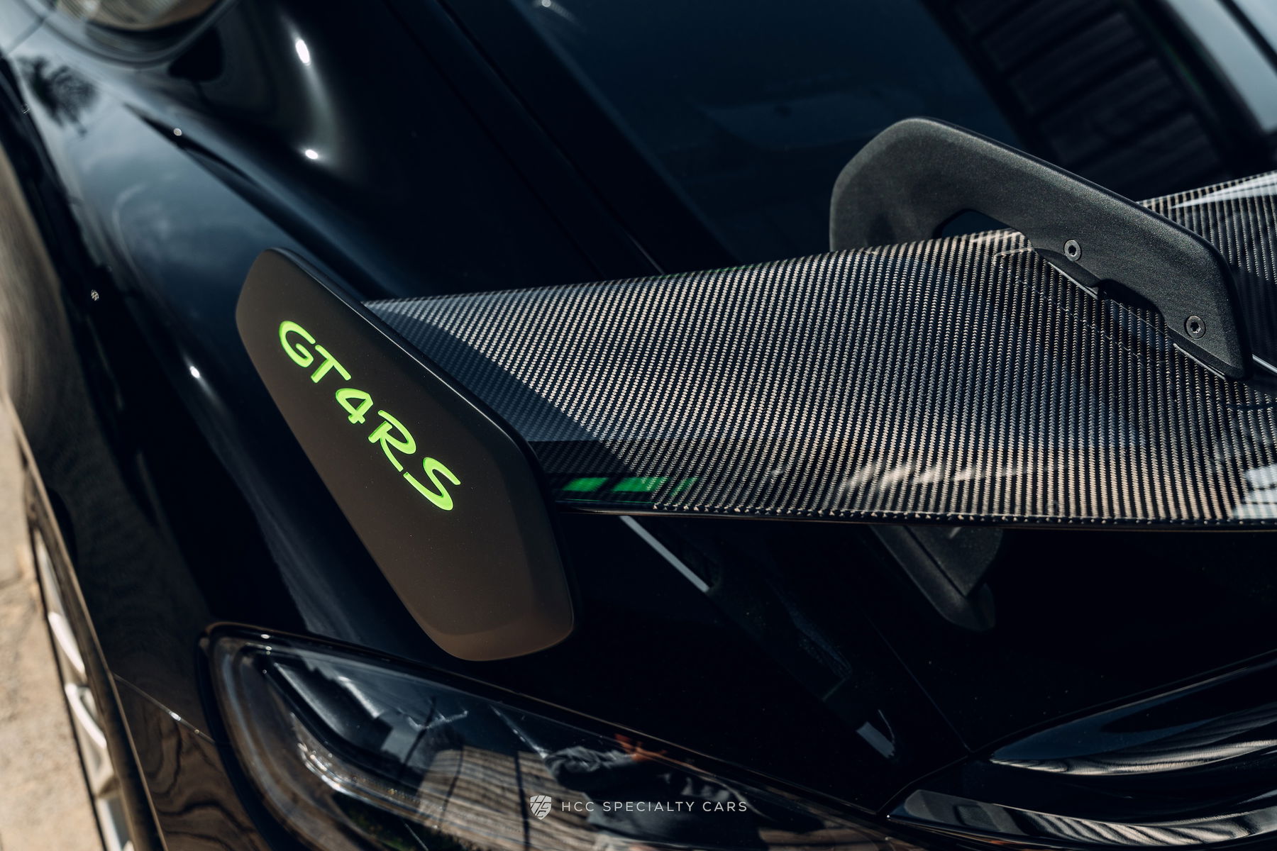 A 2023 Porsche 718 Cayman GT4 RS finished in Black over a Black Leather/Race-Tex interior with Lizard Green deviated stitching, powered by the naturally aspirated 4.0L flat-six paired with a 7-speed PDK. This highly optioned GT4 RS is equipped with the Weissach Package, Porsche Ceramic Composite Brakes, Front Axle Lift, forged magnesium wheels, and Sport Chrono, along with extensive carbon fiber and deviated interior details. Offered with a clean CARFAX, clean Texas title, and factory warranty through 2027 with CPO coverage to Nov 2029.
