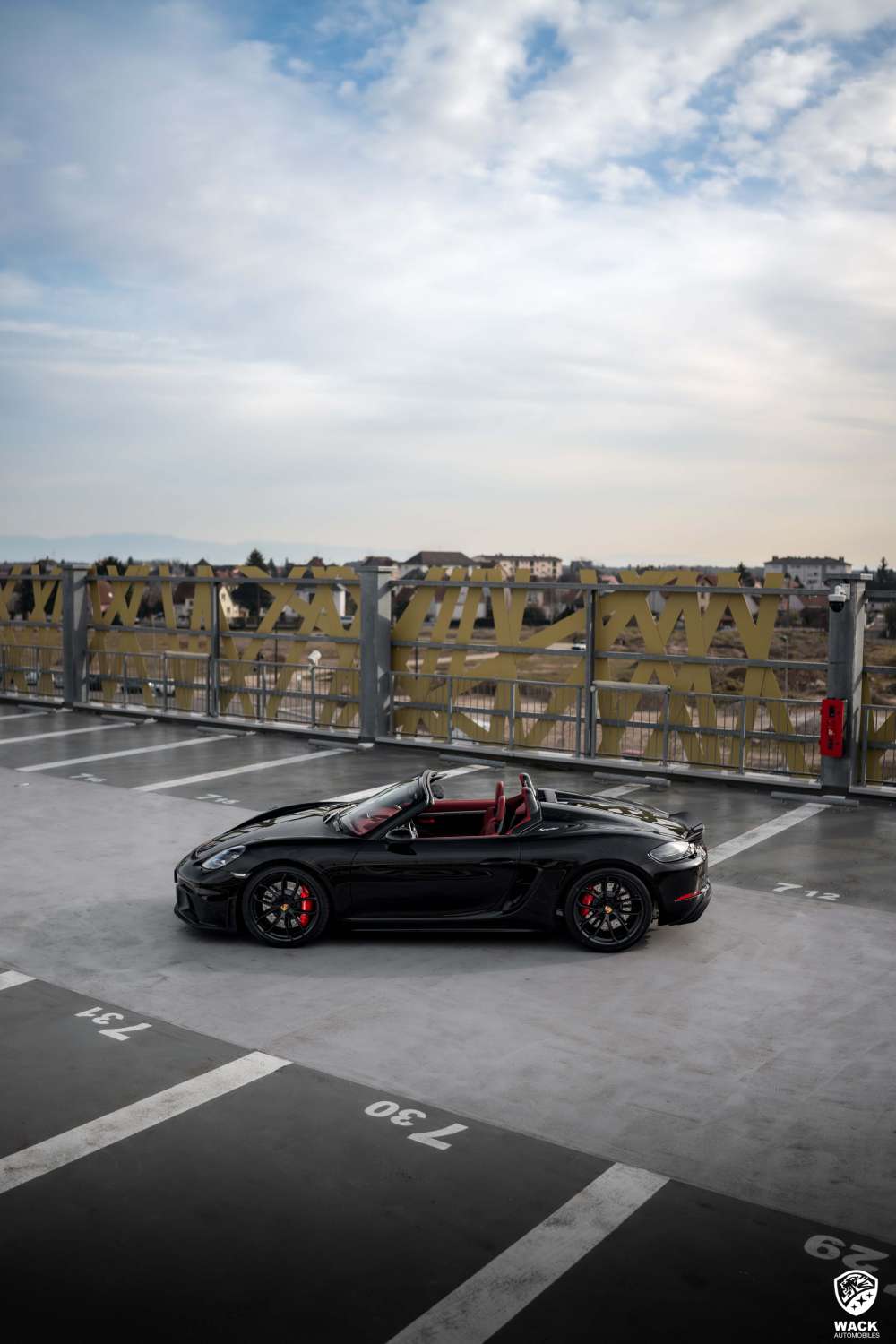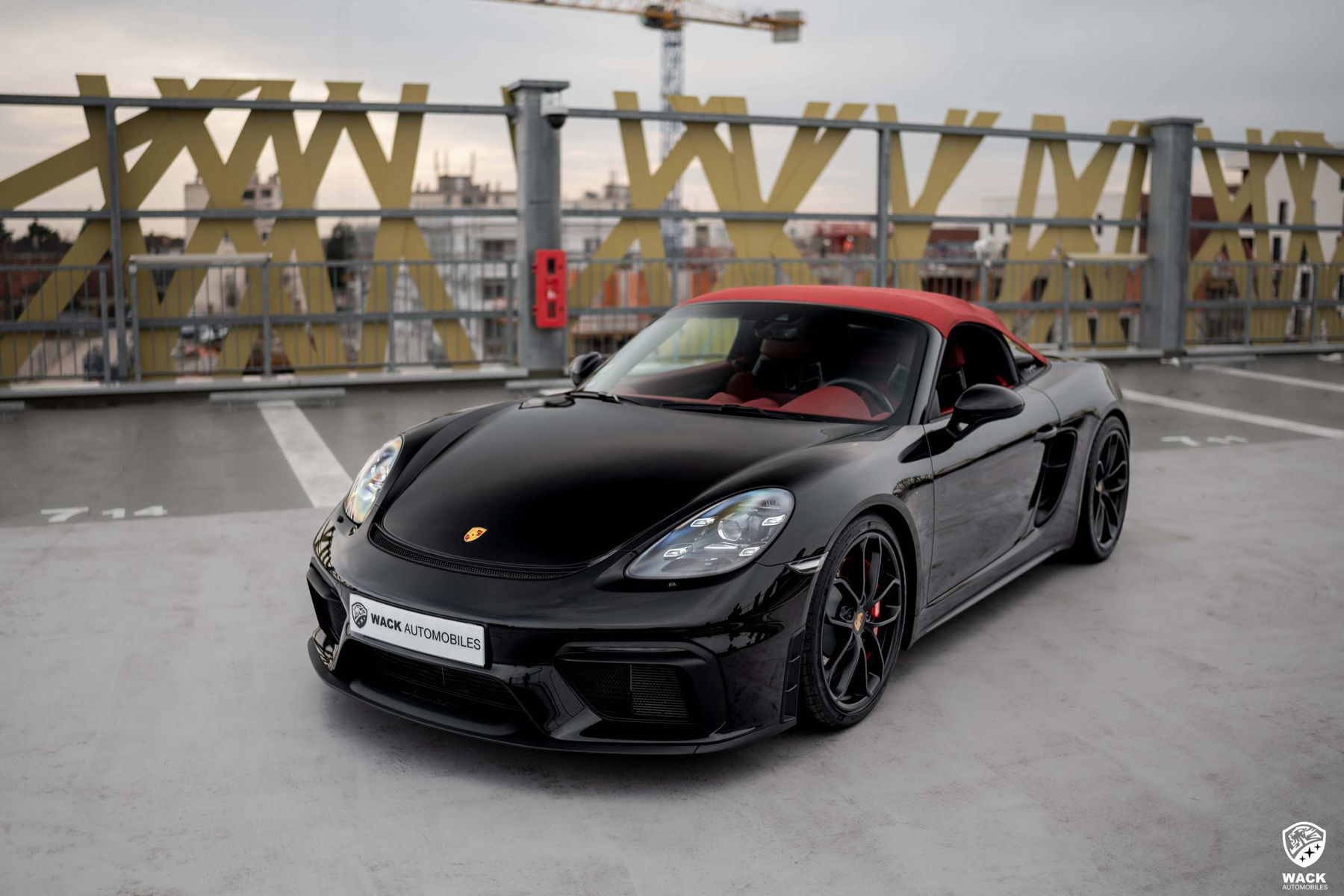 As indicated in its original maintenance book, this Boxster Spyder was delivered new in November 2019 via the Porsche dealer of Landshut. The Porsche was imported by us and is now part of our stock. Our copy is particularly enviable for its clear history and its low mileage. In addition, by its elegant Black livery combined with its burgundy hood and its two-tone leather interior accompanying its many equipments among which:
