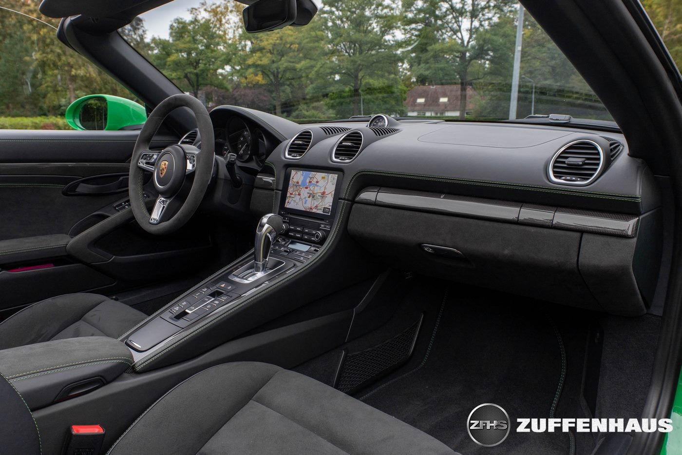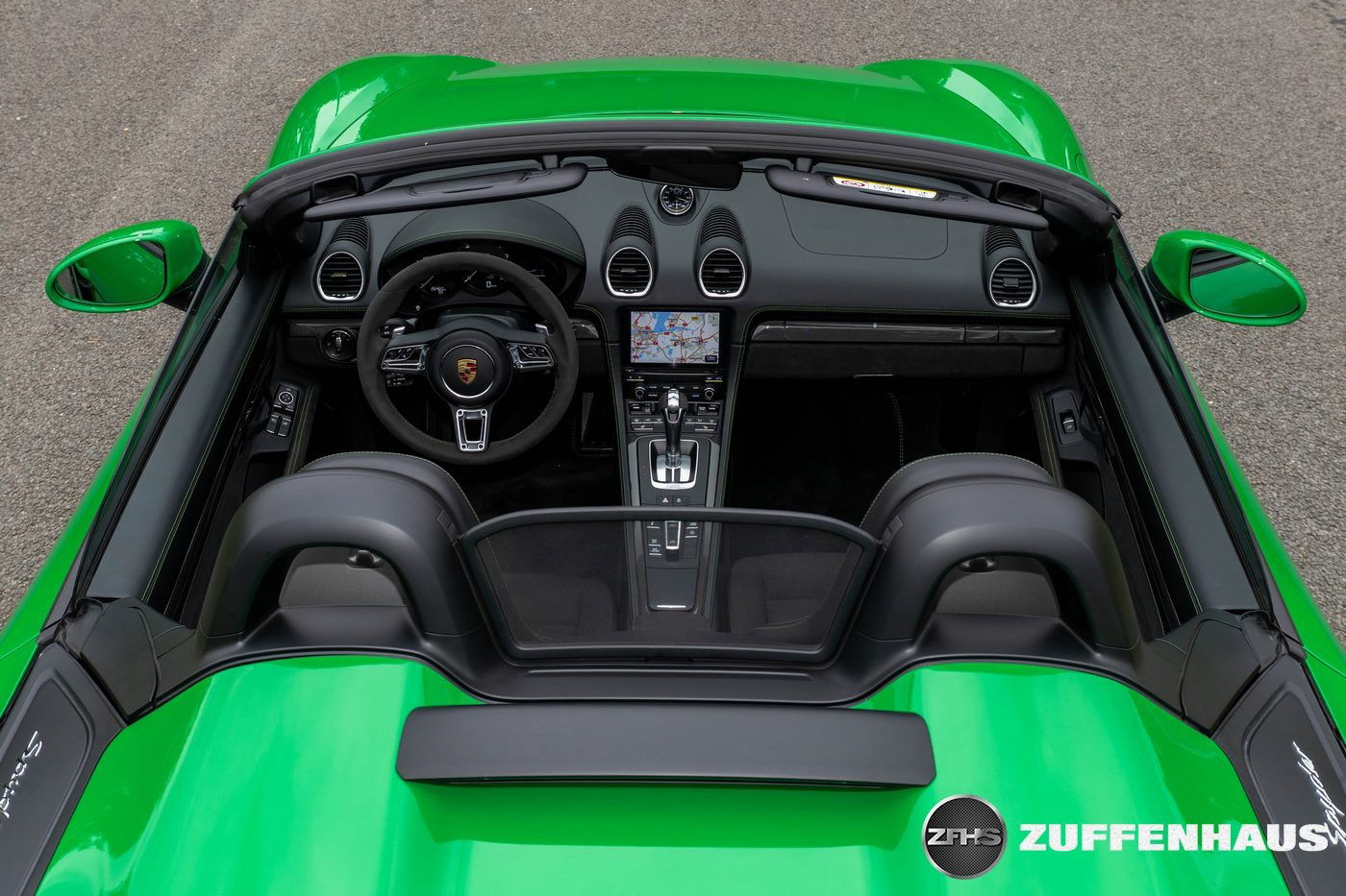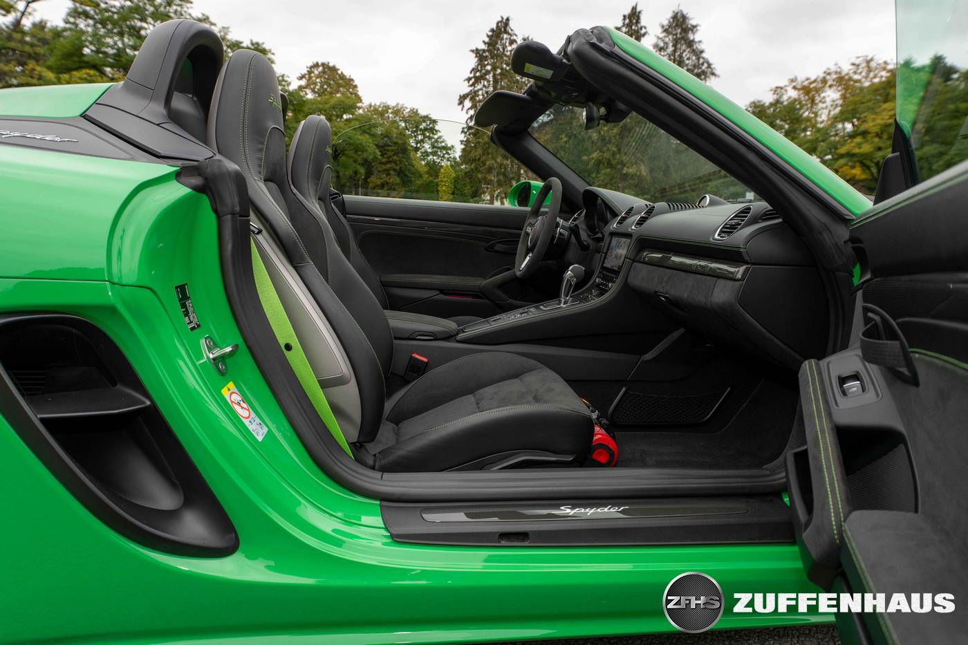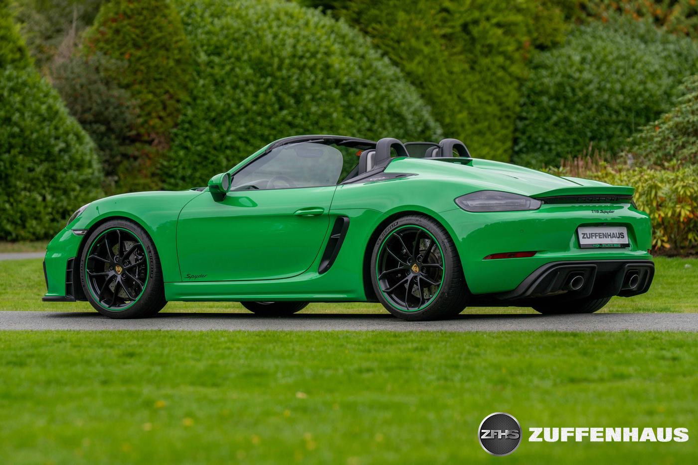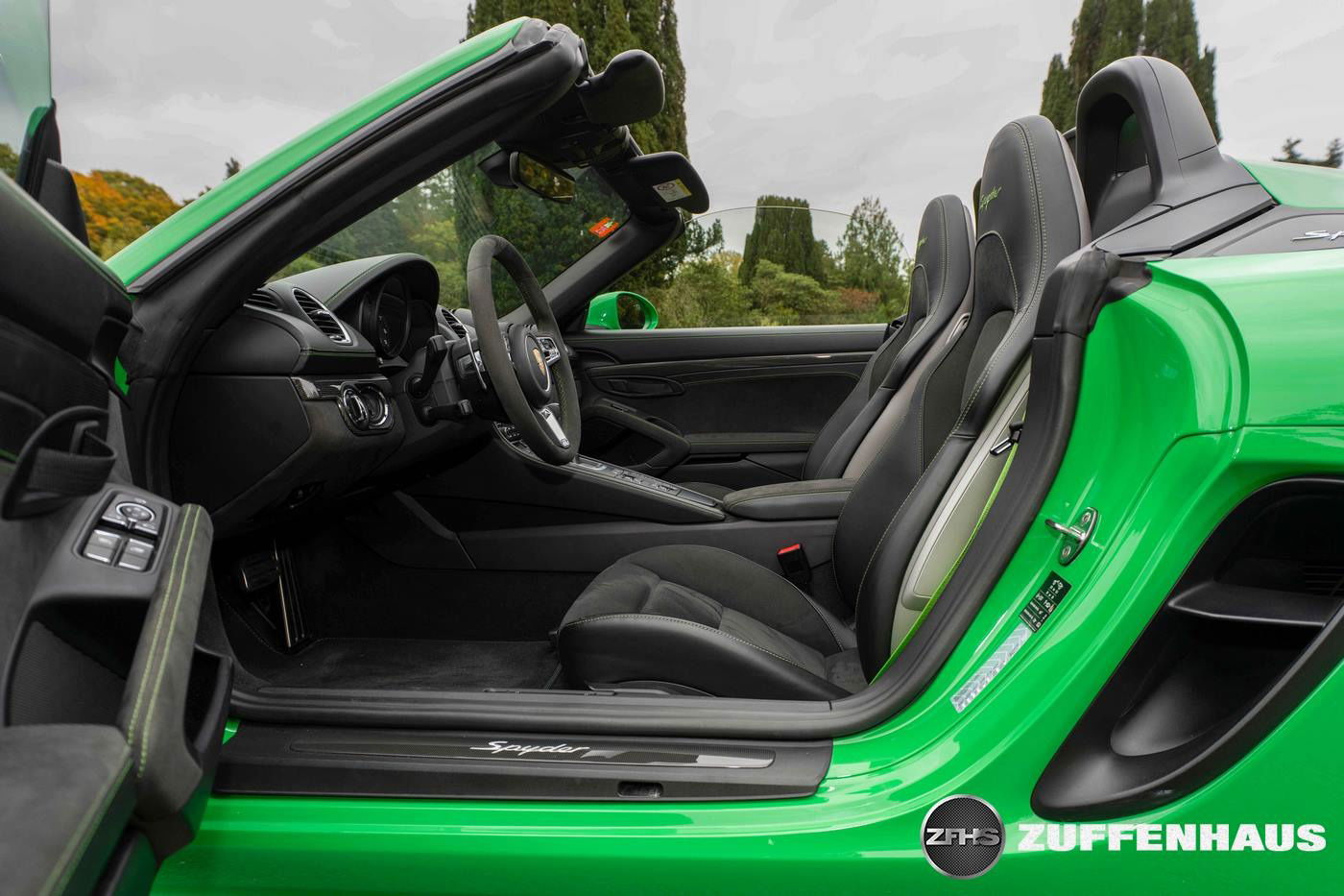 VERSION AND OPTIONS: 049 20-inch 718 Spyder wheels with summer tires, 250 PDK gearbox, 342 Seat heating, 454 Cruise Control, 489 Multifunction and steering wheel heating, 509 Fire extinguisher, 519 PORSCHE logo painted black, 573 Climate control, 581 Luggage net at passenger footwell, 583 Smoker’s Package, 602 LED headlights including Porsche Dynamic Light System Plus (PDLS Plus), 630 Light design package, 631 Maximum speed recognition, 637 Park Assistant (rear) with reversing camera, 748 Electrically folding mirrors, 810 Floor mats, 9WT Apple Carplay, DFS keys in color, EKG Interior package carbon trim, P13 Self-dimming interior and exterior mirrors with integrated rain sensor, P40 Navigation incl. Porsche Connect, XBS Brake calipers in high-gloss black, XDK wheels painted in semi-gloss black, XVX Stitching and stitched logos in a different Mambogrun color, XYB Tank cap in aluminum look