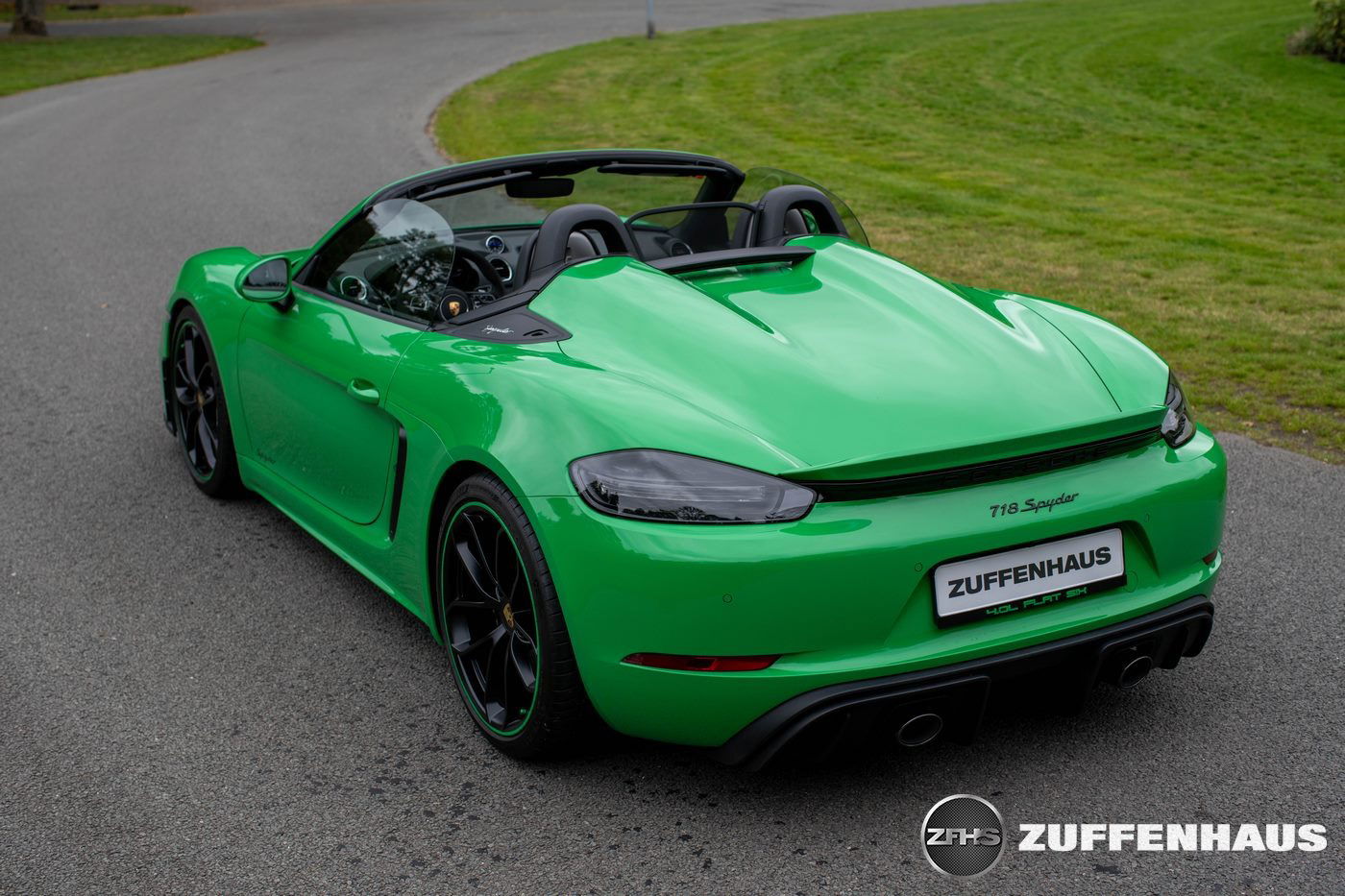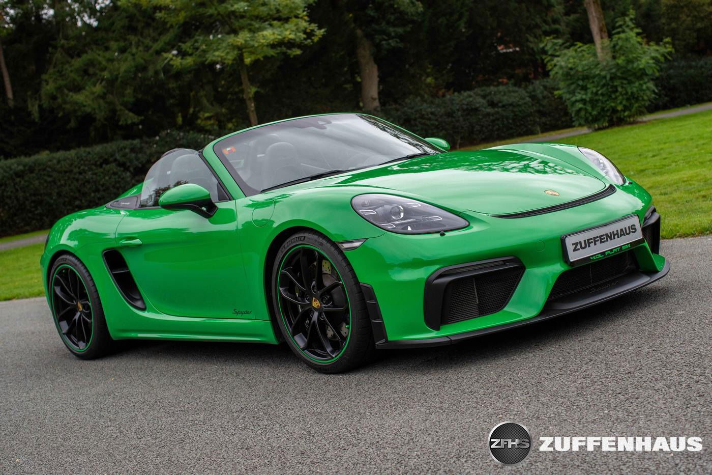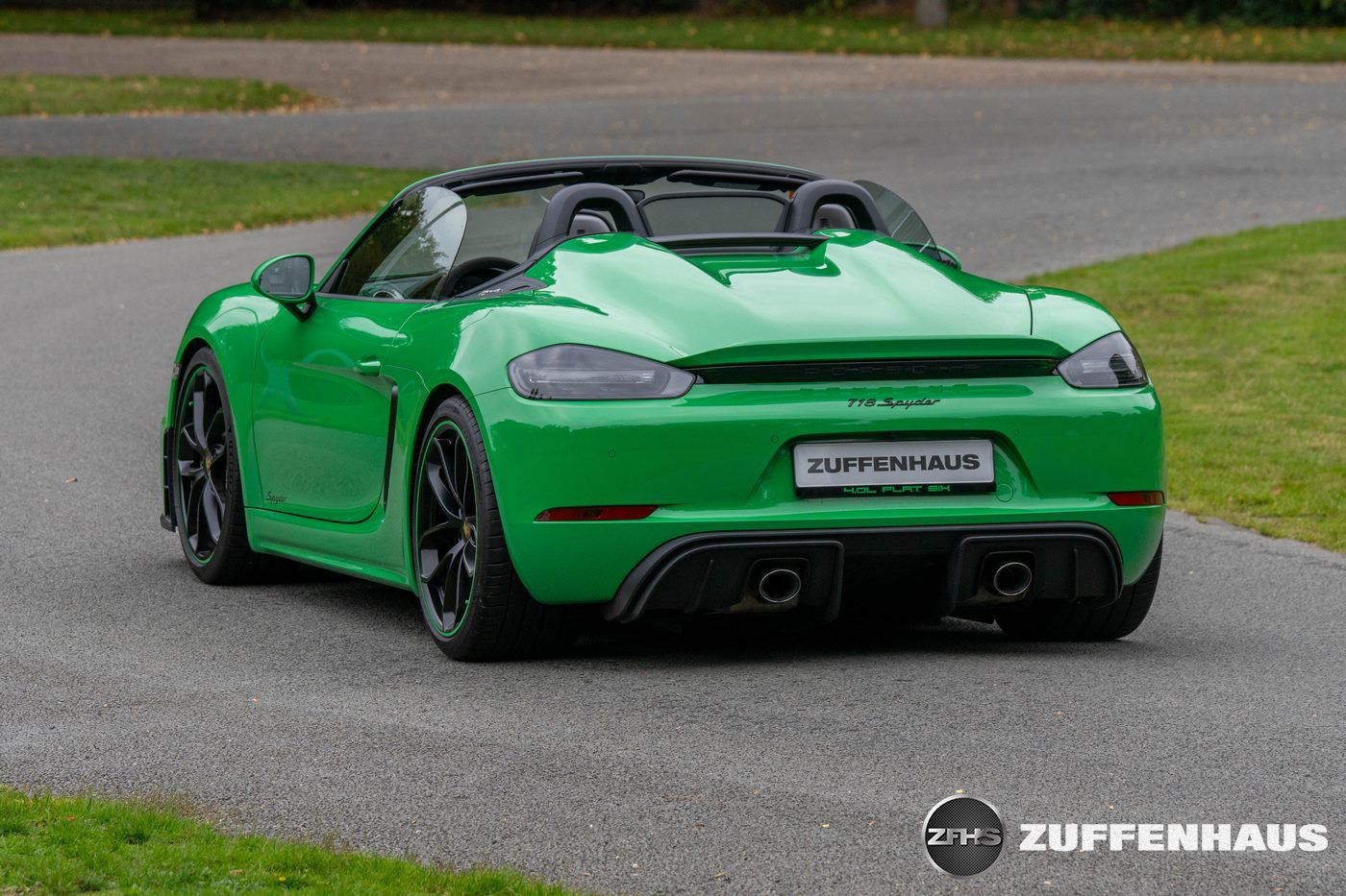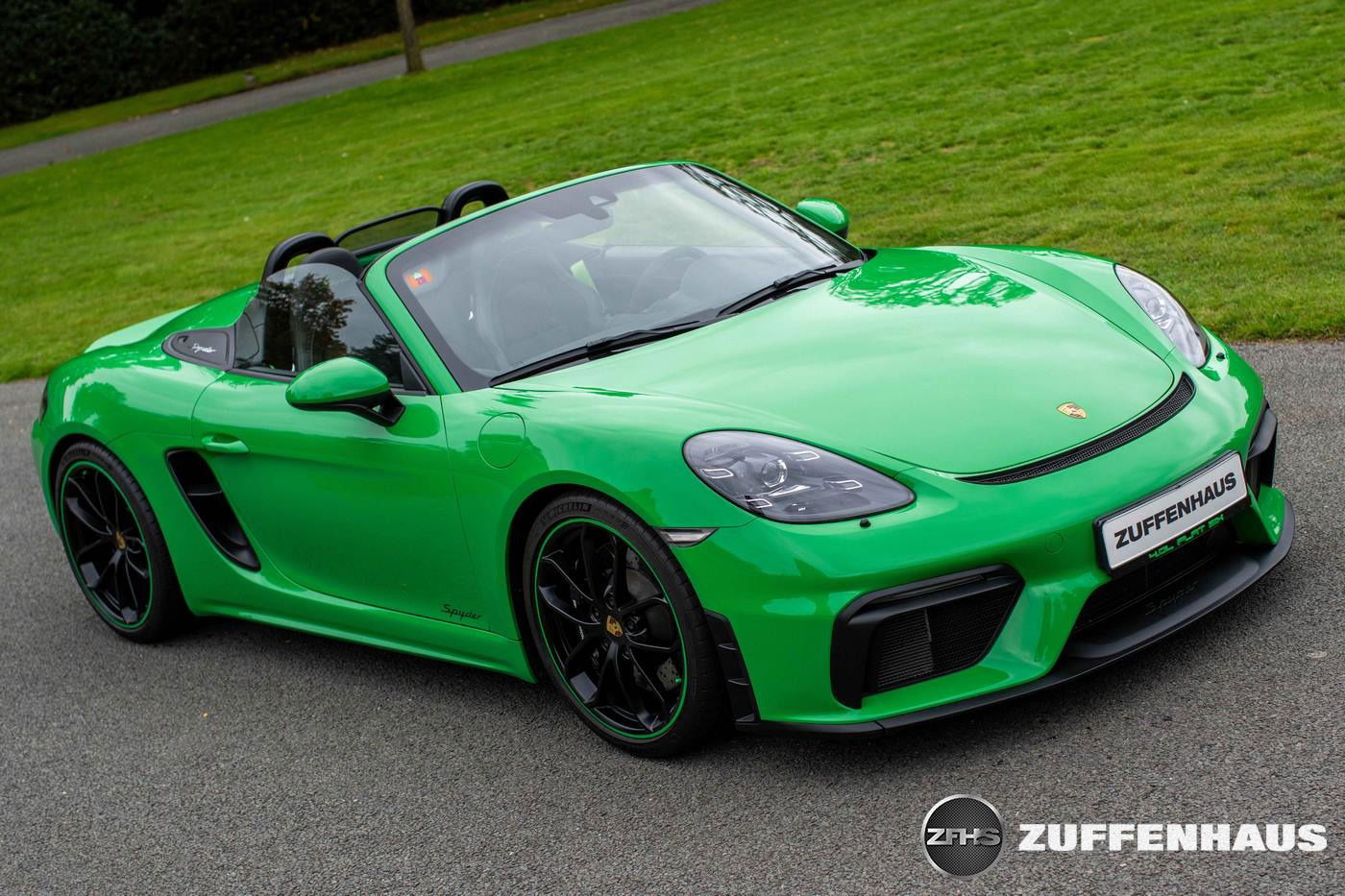 VERSION AND OPTIONS: 049 20-inch 718 Spyder wheels with summer tires, 250 PDK gearbox, 342 Seat heating, 454 Cruise Control, 489 Multifunction and steering wheel heating, 509 Fire extinguisher, 519 PORSCHE logo painted black, 573 Climate control, 581 Luggage net at passenger footwell, 583 Smoker’s Package, 602 LED headlights including Porsche Dynamic Light System Plus (PDLS Plus), 630 Light design package, 631 Maximum speed recognition, 637 Park Assistant (rear) with reversing camera, 748 Electrically folding mirrors, 810 Floor mats, 9WT Apple Carplay, DFS keys in color, EKG Interior package carbon trim, P13 Self-dimming interior and exterior mirrors with integrated rain sensor, P40 Navigation incl. Porsche Connect, XBS Brake calipers in high-gloss black, XDK wheels painted in semi-gloss black, XVX Stitching and stitched logos in a different Mambogrun color, XYB Tank cap in aluminum look