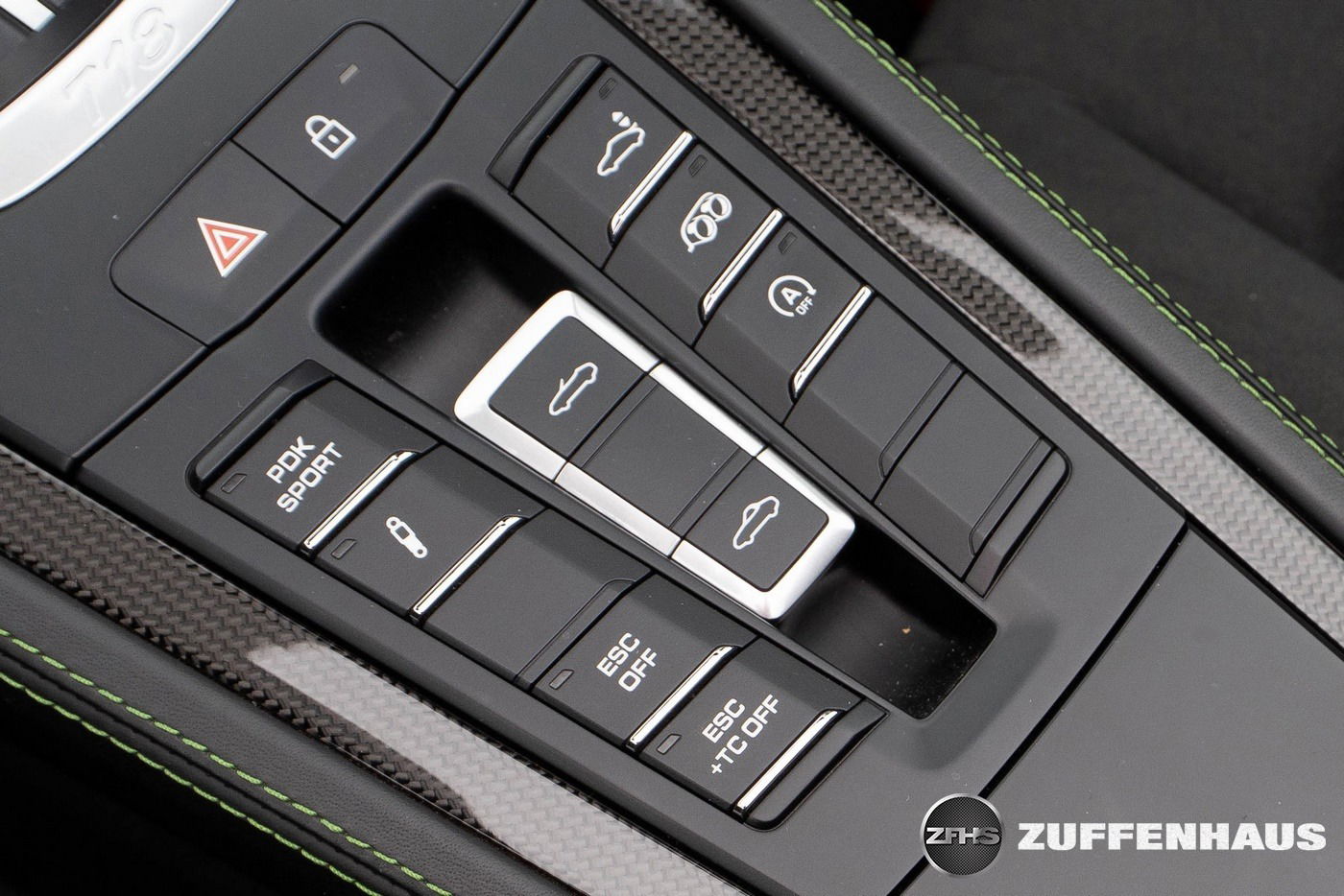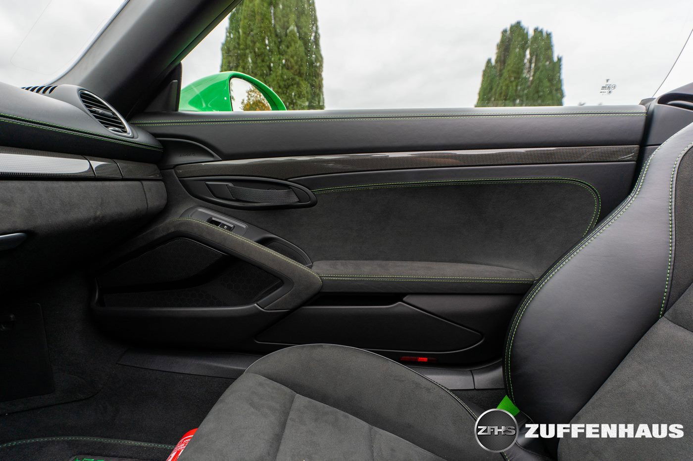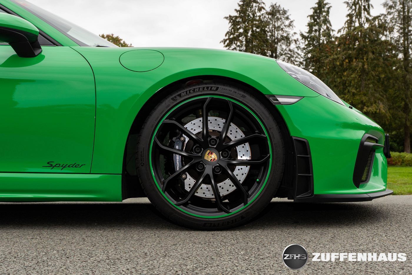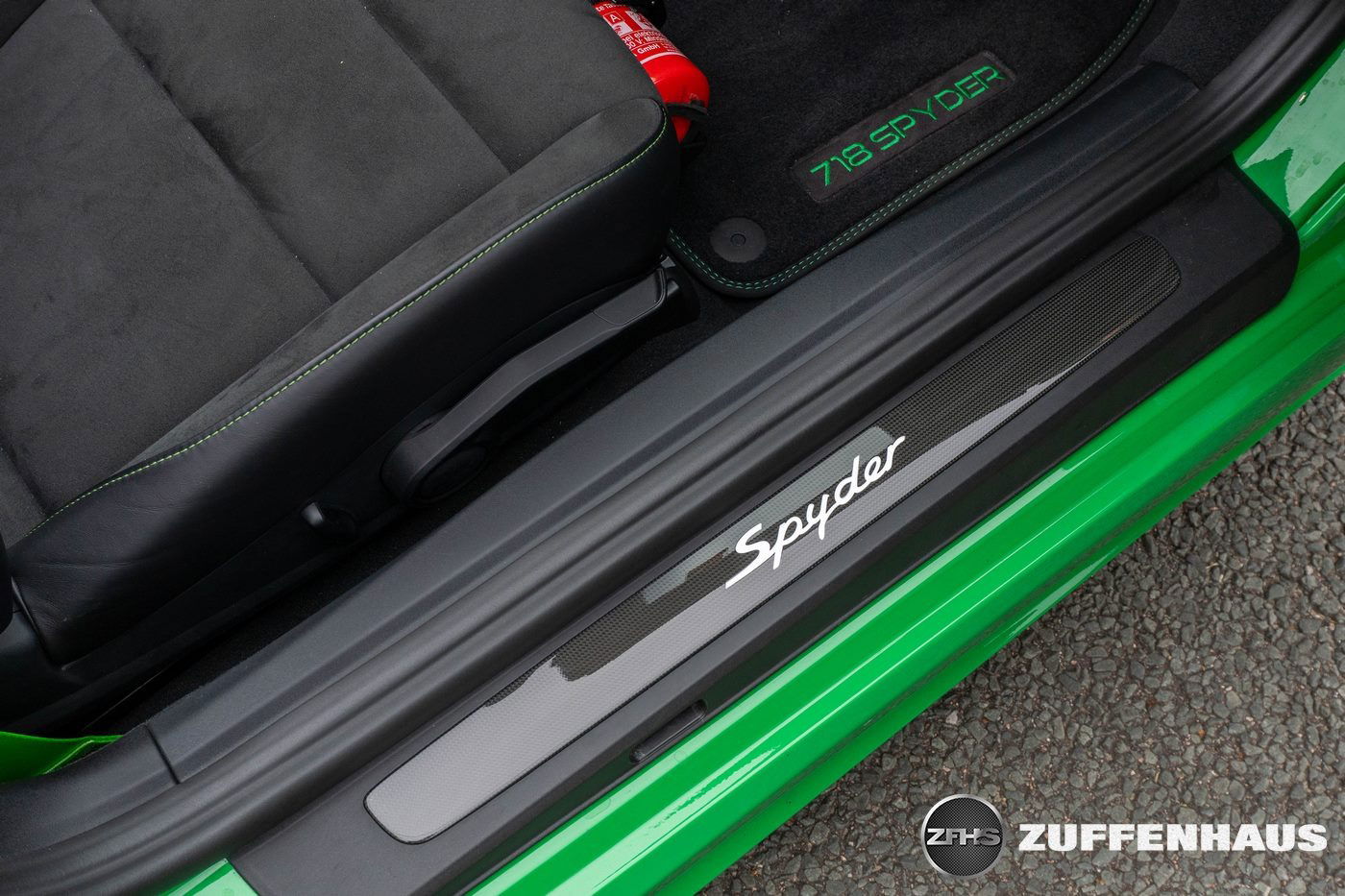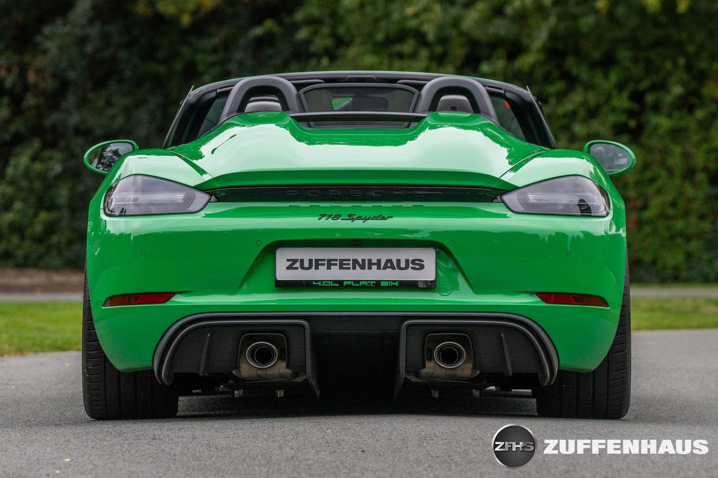 VERSION AND OPTIONS: 049 20-inch 718 Spyder wheels with summer tires, 250 PDK gearbox, 342 Seat heating, 454 Cruise Control, 489 Multifunction and steering wheel heating, 509 Fire extinguisher, 519 PORSCHE logo painted black, 573 Climate control, 581 Luggage net at passenger footwell, 583 Smoker’s Package, 602 LED headlights including Porsche Dynamic Light System Plus (PDLS Plus), 630 Light design package, 631 Maximum speed recognition, 637 Park Assistant (rear) with reversing camera, 748 Electrically folding mirrors, 810 Floor mats, 9WT Apple Carplay, DFS keys in color, EKG Interior package carbon trim, P13 Self-dimming interior and exterior mirrors with integrated rain sensor, P40 Navigation incl. Porsche Connect, XBS Brake calipers in high-gloss black, XDK wheels painted in semi-gloss black, XVX Stitching and stitched logos in a different Mambogrun color, XYB Tank cap in aluminum look