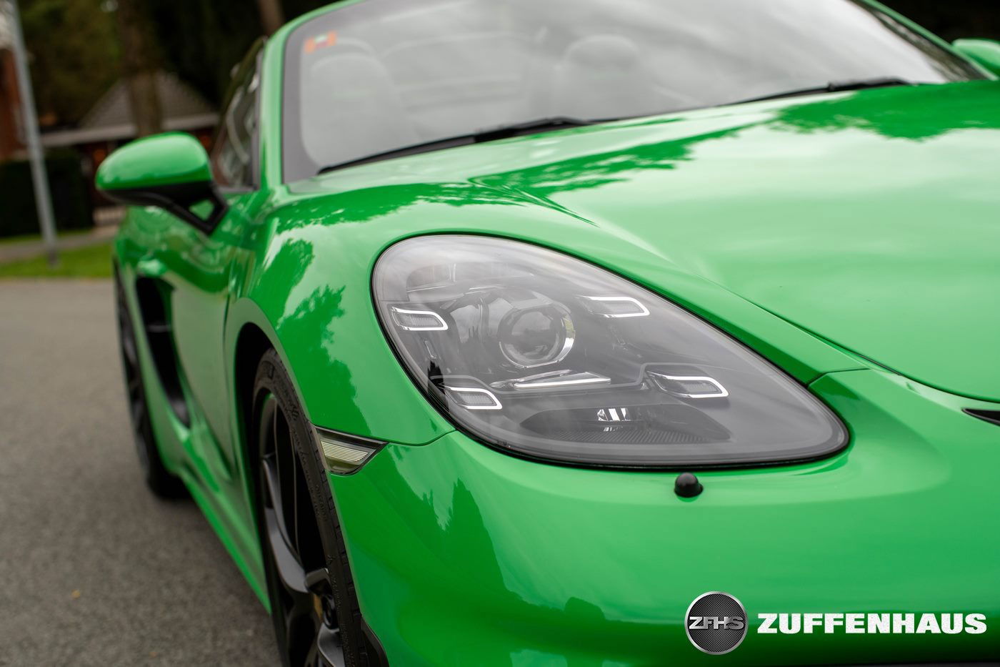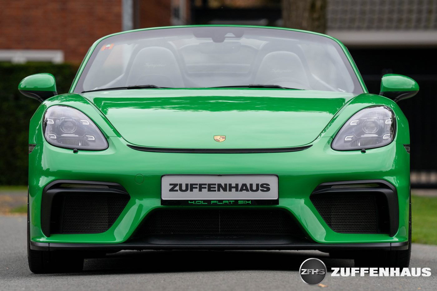 The Porsche 718 Spyder is truly driving a Porsche as it was meant to be, if you ask us. A wonderfully lightweight Porsche (with PDK it weighs 1525 kilos), a 4.0-liter engine from the 911 GT series that produces an impressive 420 hp from a naturally aspirated engine, and then, in dry weather and with the wind in your hair, driving this Spyder through the Eifel region—it doesn’t get any better than this. This Spyder was purchased directly from the first German owner by a customer of ours, who loves the search for something special every time, and who carefully assembled it. A Porsche folder with the order form, the original invoice, the immediately installed PPF film, the extended warranty—everything is included from day one! Naturally, the Porsche has been dealer-maintained and will remain so until May 2025, including the warranty, which was then extended for 24 months. So, driving this Spyder is worry-free. For those moments when you’re not driving but walking into the garage, that fantastic Python Green color will also make you happy. By special request, the stitching at the Exclusive department in Zuffenhausen is finished in Mambogrün, which makes it truly special!