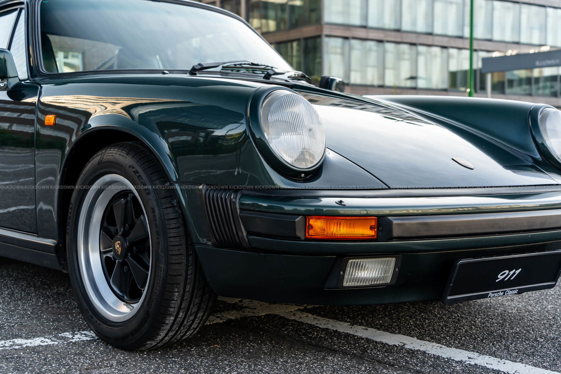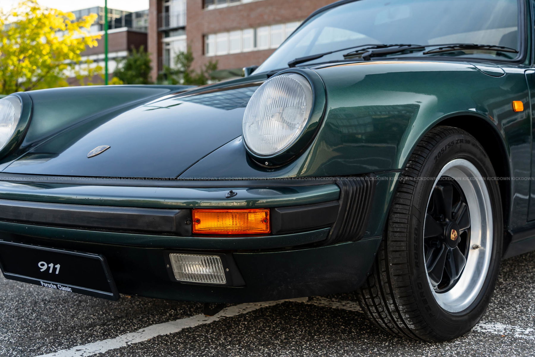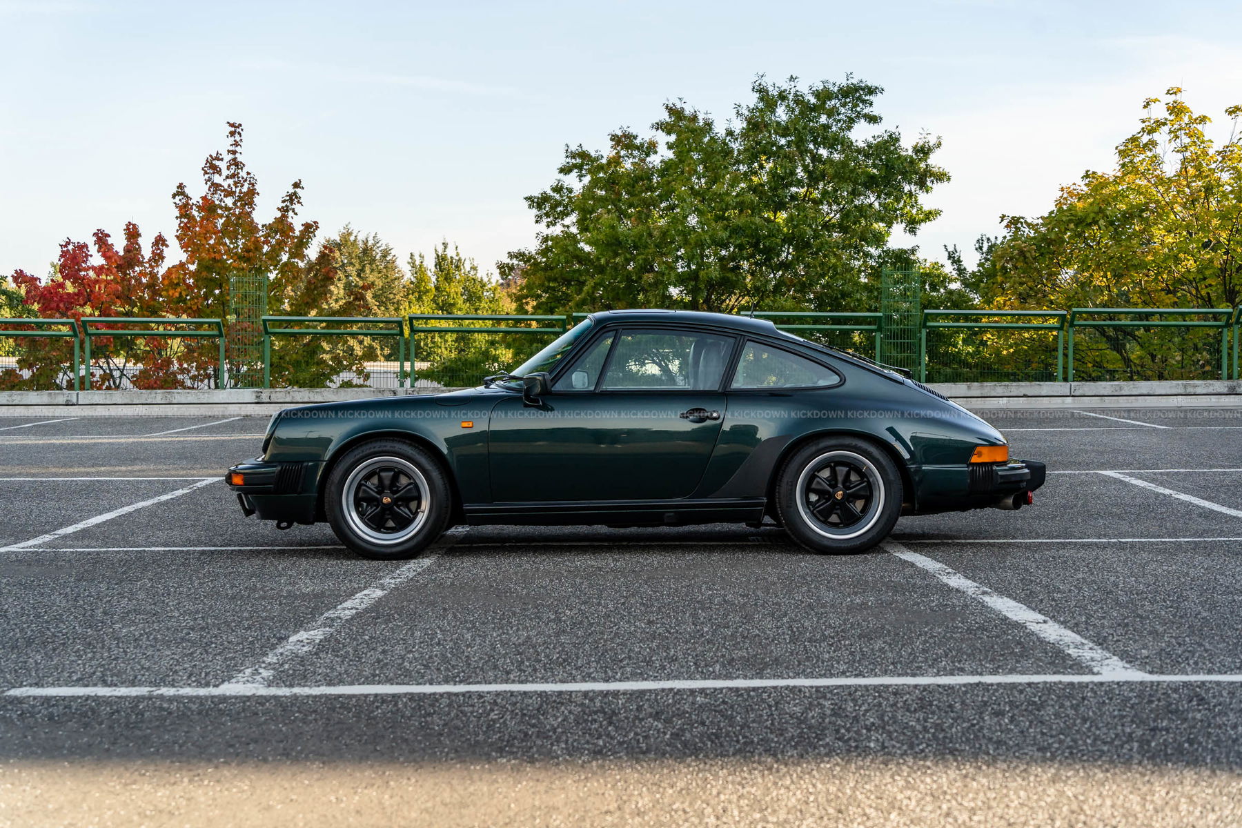 A 1985 Porsche 911 Carrera 3.2 is for sale in moss green metallic with black leather interior.