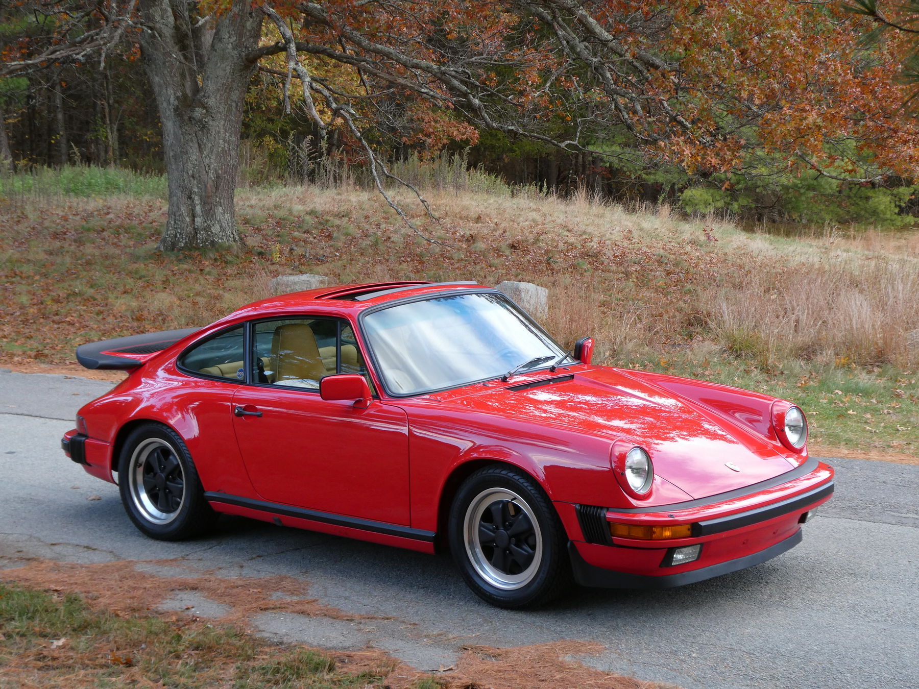 WP0AB0915GS120658, Guards Red with champagne full leather, 3.2 litre air cooled flat 6 cylinder fuel injected engine making 207hp with 192 lb-ft of torque, type 915 5 speed manual transmission, disc brakes at all 4 corners, air conditioning, power driver’s seat, factory options – color code PE special leather interior, Monterey cassette radio – now updated to current-gen Porsche Classic radio, power door locks, electric sunroof, front and rear spoilers, 16 inch Fuchs alloy wheels, delivered new November 14, 1985 via Schneider Porsche + Audi of Oakhurst, New Jersey, complete with original owner’s manuals and pouch, original maintenance booklet, original window sticker, tool roll and jack, exceptional condition throughout, and delivered new nearly exactly 40 years ago on November 14, 1985. It really does not get more iconic than a Guards Red Porsche 911.