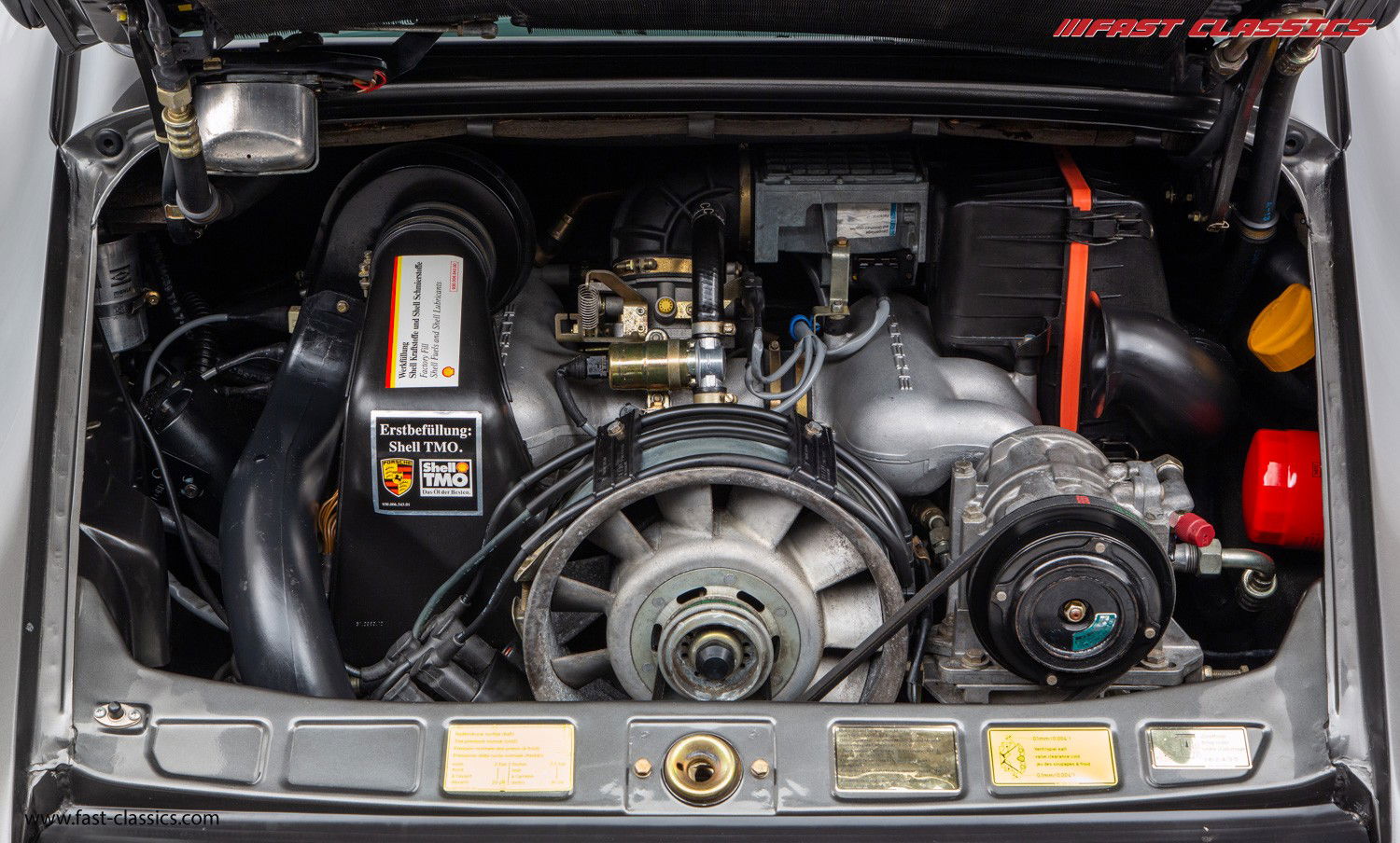 The interior space of the 911 boasts classic Porsche ergonomics with a row of dials spread across the dashboard in front of the driver and the switch gear laid out in a simple, linear fashion. The unusual silk grey leatherette sports seats have deep bolsters to help support the passengers and offer an elegant contrast / compliment to the body colour. With a generous and unusual specification of both AC ‘Climate Control’ and Sunroof the occupants are truly spoiled!