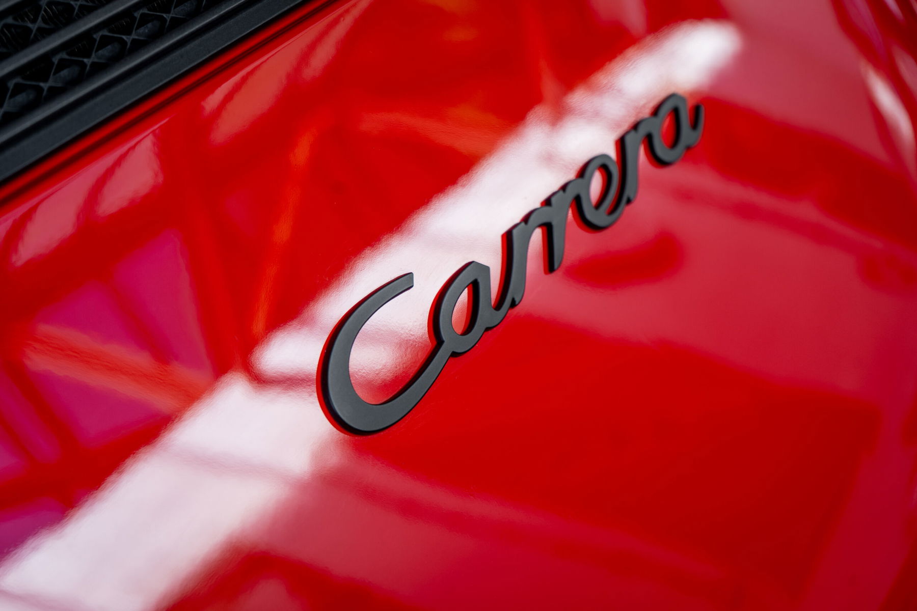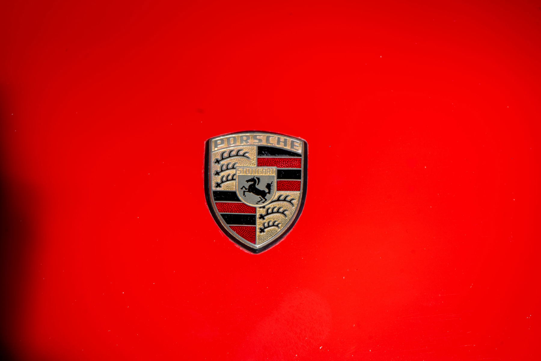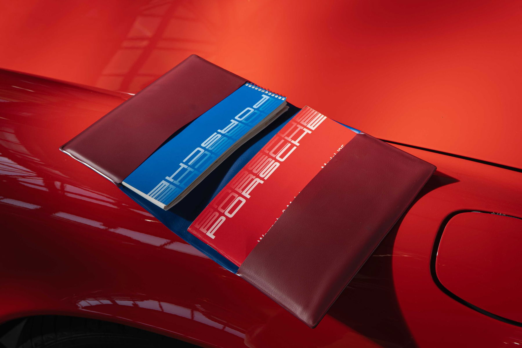 The car is presented in the classic Guards Red color combination with a brown leather interior.