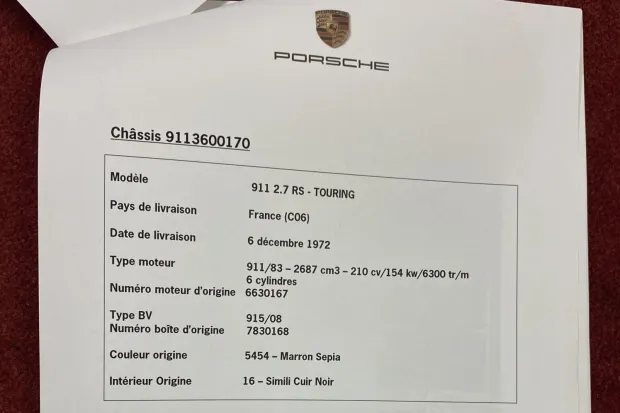 The car is a one of the seven Sepia Brown RS produced (one of the rarest color) and remained with its original owner for approximately 43 years, at the beginning of which it was repainted black and. It is powered by a 2.7-liter flat-six equipped with a new replacement case when the case broke. The change had been performed by the Almeras Brothers and is unstamped, unmarked and properly invoiced and documented. The 915 five-speed transaxle and the car itself are 100% matching andall the stamps, welds etc … have been assessed and prayed as authentic and never touched. The car has never been raced and never been crashed. It is apart from its black paint probably the most original 2.7 RS in existence, as all documents from day 1 are coming with the car. The 2 Keyes, the service book stated until its last page, all the manuals, the engine bay decals etc … The car is is a sort of diva which has been used on several books covers, on advertising pages for Meggyars and published in numerous Porsche magazines. I purchased the car in 2016, and work performed last November for over 18 000 € by the Porsche Classic Center Paris (probably the best in France) involved replacing the oil cooler and lines and servicing the brakes. The car is sold with its original Touring parts, its 1973 « car cover, and a big box containing all the literature and memorabilia attached to the car. You need to know that at some point singer songwriter Chris Rea fell in love with my car and wrote and recorded a sont, never released, for « her ». And this song on a CD comes with the car. Needless to say tires are almost new and there is nothing to do to the car which has in the meantime never been restored.