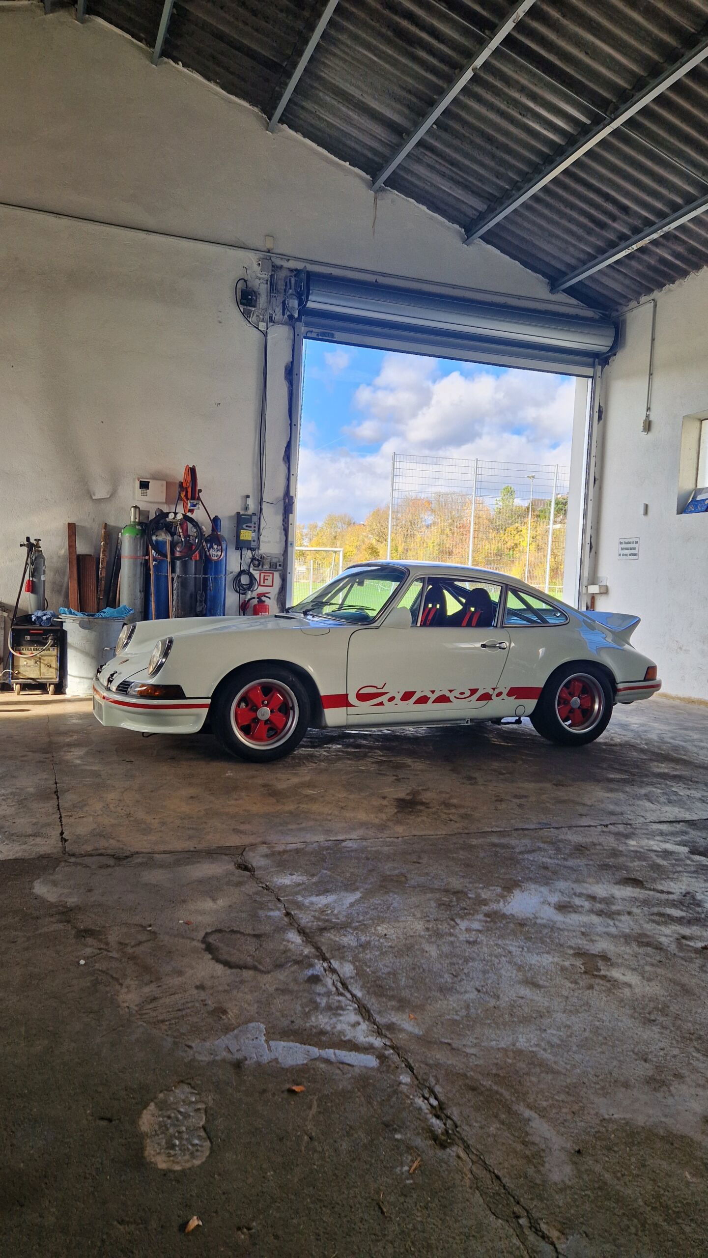 Porsche 911 2.7 RS Replica Original vehicle: 911 G-Mod 2.7, built in 1974 2.7-liter engine (7R housing) with 40 mm Weber carburetors, ultrasonically cleaned and resealed, new ignition cables, distributor, and spark plugs.Performance enhanced by different pistons and camshafts Oil thermostat in rear wheel arch and oil cooler from 3.2 in front right wheel arch Dual-flow heat exchanger with sports exhaust 915 transmission with mechanical speedometer drive Conversion to F-Mod appearance: Front lock plate from F-Mod welded in, rear wheel arches welded in with original Carrera 2.7 widenings, front and rear bumpers made of GRP, front trunk lid and engine cover ('ducktail') made of GRP, Grand Prix White paintwork with red Carrera RS decals, roll cage welded in, original 'S' front brake calipers / 'RS' aluminum calipers Rear aluminum wishbones Front aluminum axle subframes Front and rear stabilizers, rear stabilizer brackets reinforced Torsion bars 22 mm front, 28 mm rear PU-mounted wheel suspensions 'Turbo' tie rods Fuchs rims 7 and 8 x 15 Michelin semi-slicks Plastic tank, aluminum sheet underride guard Front strut brace Interior insulation completely removed, felt headliner Sports seats with H-belts Aluminum sheet footrests Racing mirrors GFK Tachometer 'S' / 'RS' Speedometer 300 kph mechanical drive Sports steering wheel The vehicle has been registered with a 07 number for the last 20 years.The modifications and changes are entered in the vehicle registration document (power approx. 230 hp with 46 carburetors – but 40 are installed