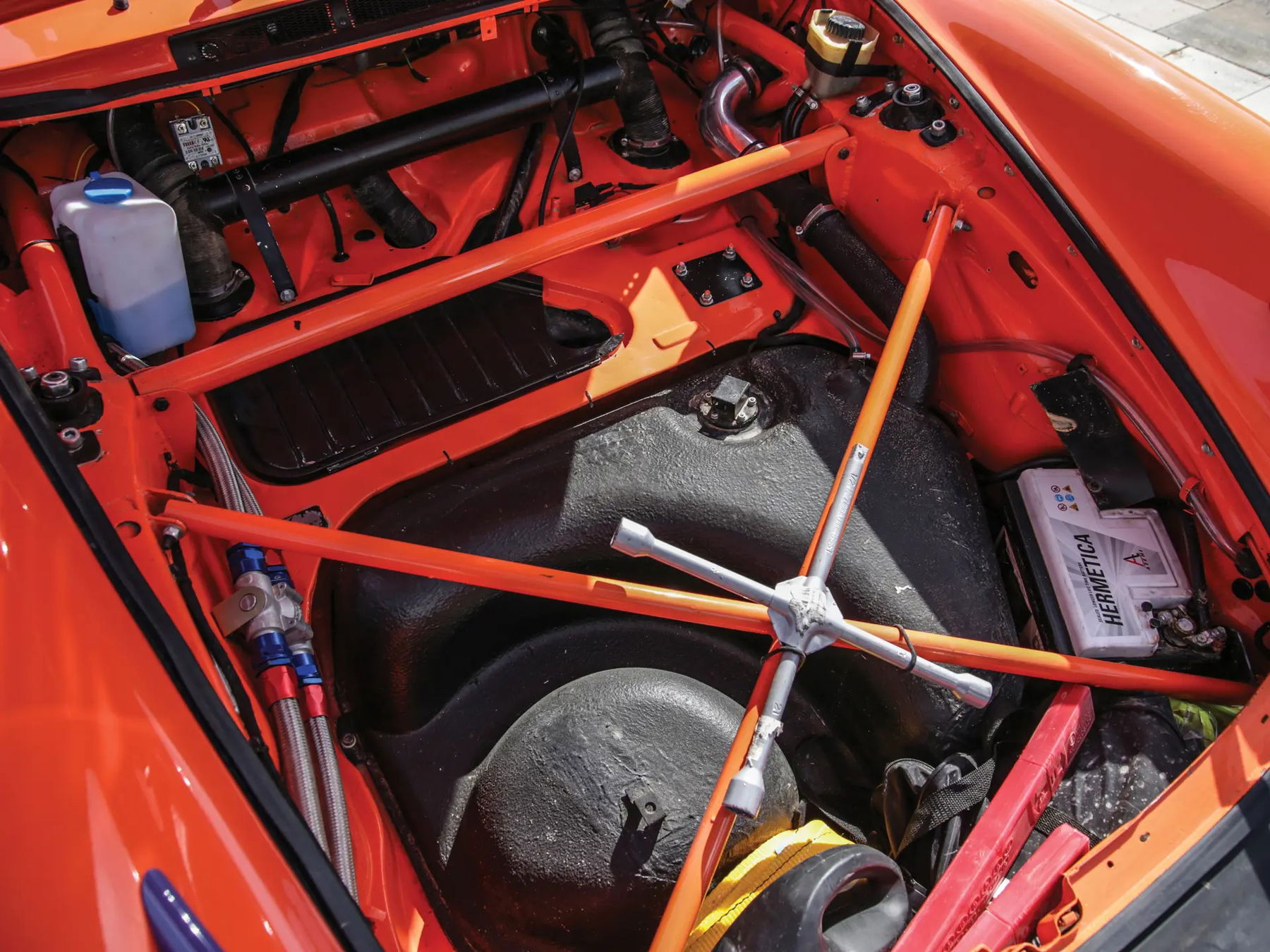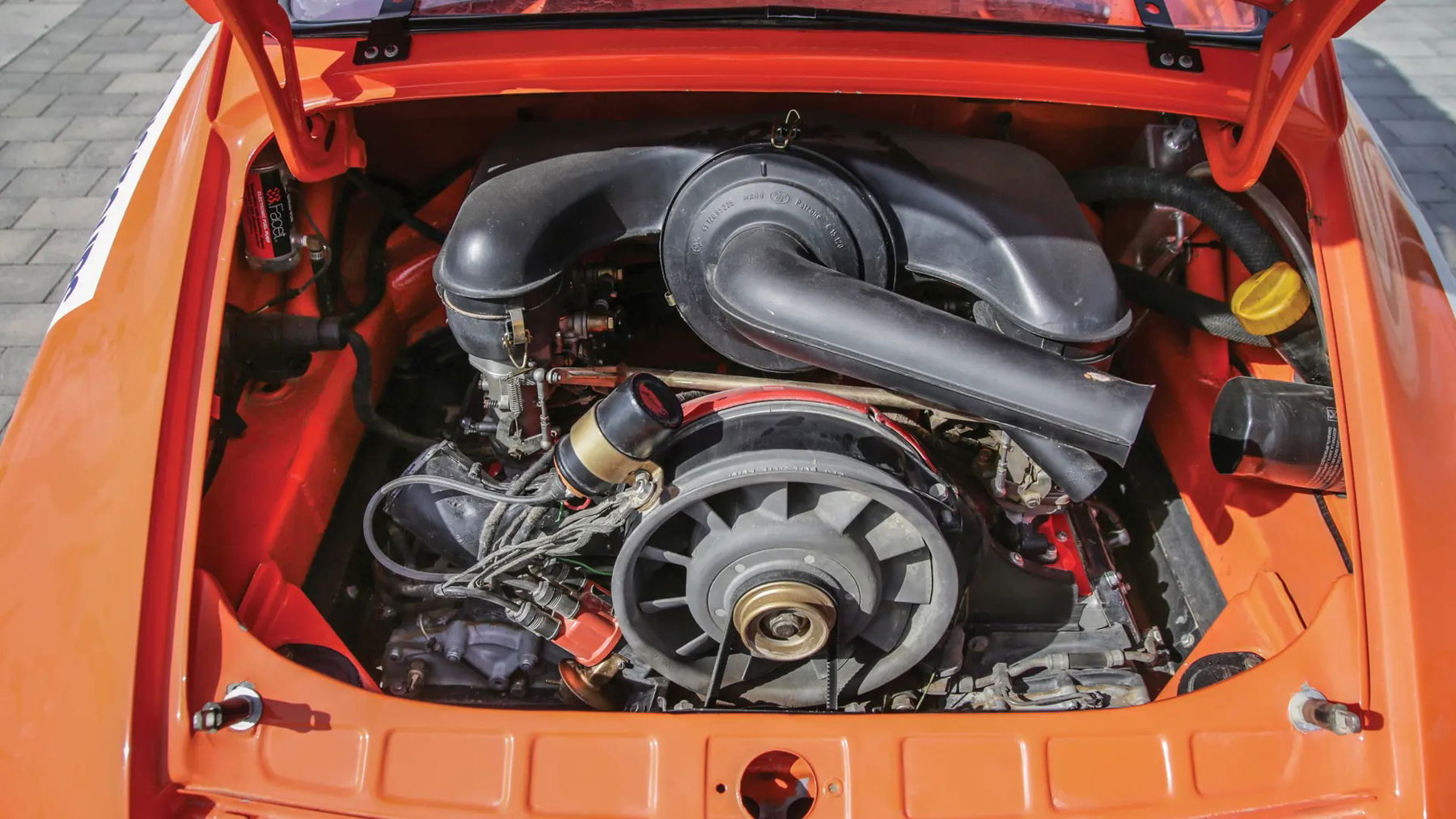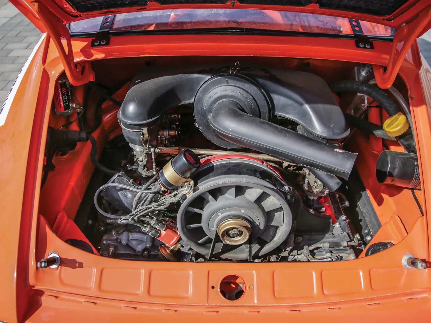 Mechanically, the suspension received specially modified elements, which allow for a ride-height 12 centimetres above the stock setting. Dampening is controlled via shock absorbers made from thicker tubes and longer travel to handle uneven surfaces with greater compliance. The modified, rear-mounted, flat-six, 2.7-litre engine breaths through custom Weber carburettors and feeds power through a special aluminium racing clutch to a type 915 manual gearbox. A front-mounted oil cooler aides in the maintenance of proper operating temperature. In June 2020, the engine was rebuilt and invoices on file reveal the sum of CHF 24,949 to complete the project.
