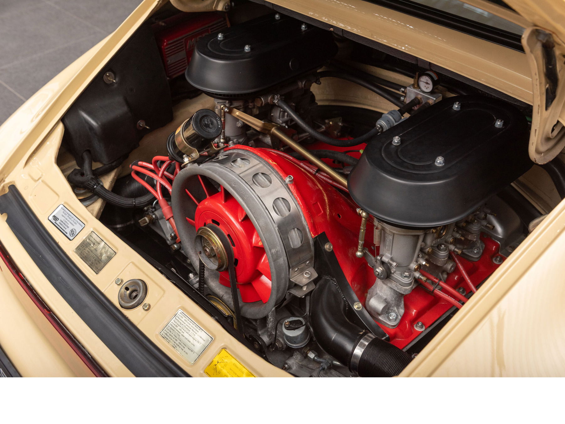 The engine has been mildly enhanced with Porsche sport camshafts and 40 mm PMO carburetors, delivering 239 hp — providing a lively and engaging character while retaining the unmistakable spirit of the classic SC. Extensively documented restoration of the engine, gearbox, suspension, and related components.