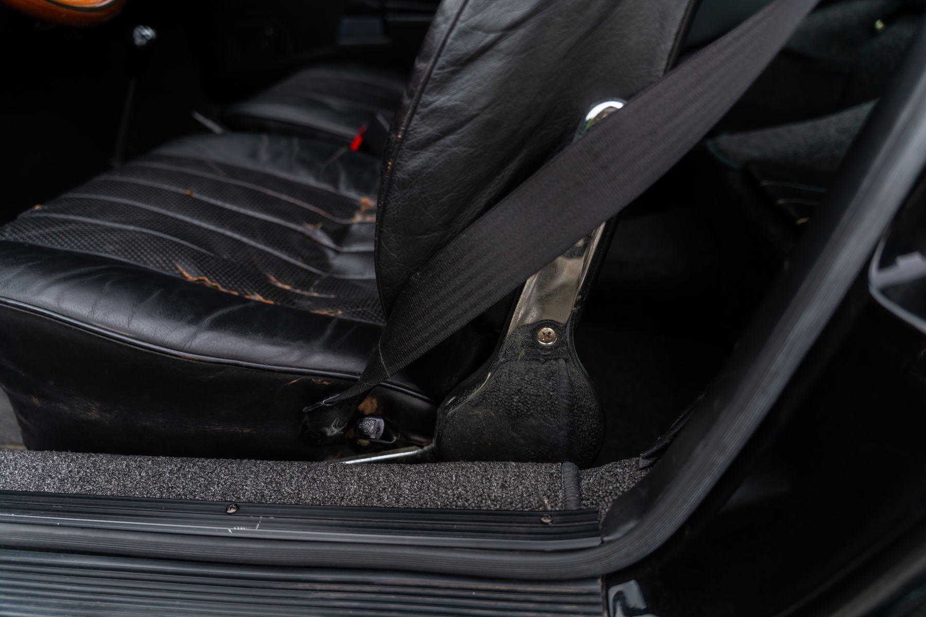 The interior is welcoming. The leather is original. Some will appreciate its patina, while others may want to have the seats reupholstered. The wooden steering wheel adds a nice touch of elegance.