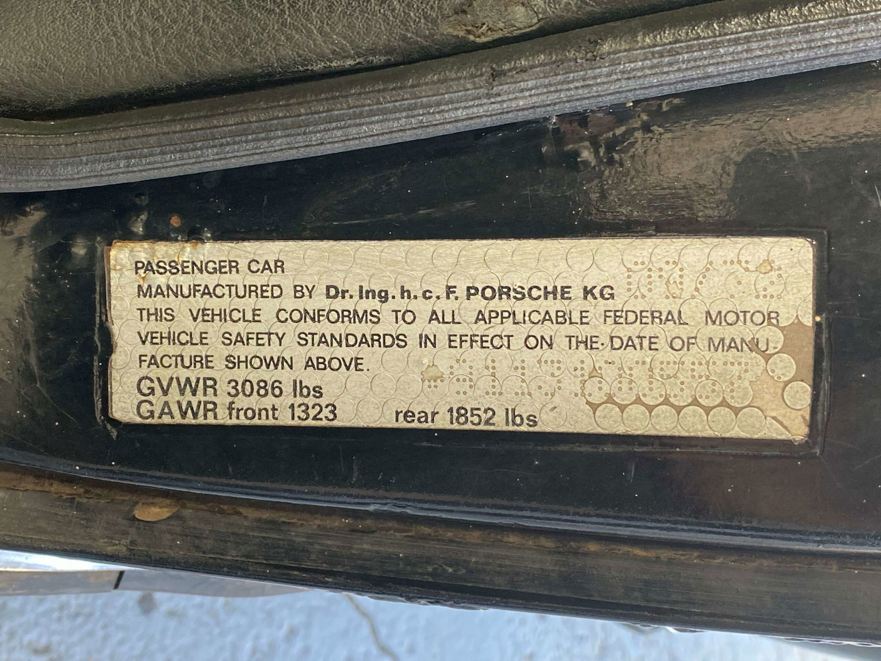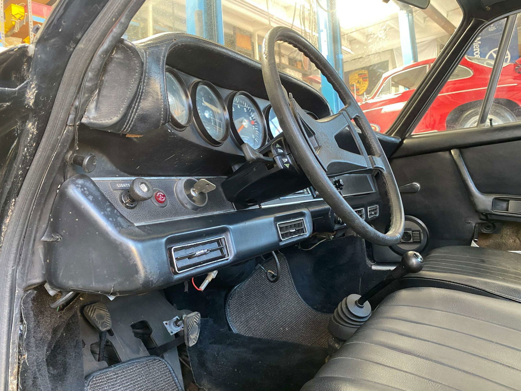 This is a very complete 1973 911T Coupe restoration candidate. Originally delivered in Silver Metallic according to the paint code (936). The exterior features a “S” front spoiler, and a rear duck tail, with original glass and brightwork. The interior is complete with original seats, VDO instrumentation, a VDM steering wheel, a deluxe horn ring, a Pioneer radio, and a air conditioning system. The Fuchs alloy wheels are fitted to General XP2000H 205 60 R15 tires.