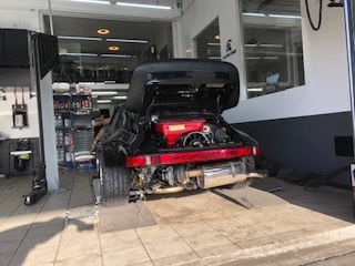 At its core it is a S-spec 3.3L turbocharged flat-six, upgraded with RSR-style cylinder heads, Dbilas Dynamic performance cams, a revised K-Jetronic fuel injection system, and a BorgWarner K27 turbocharger. Power is fed through a freshly rebuilt four-speed manual transaxle paired with a sports clutch and WEVO short shifter. Supporting mods include Bilstein suspension, RSR-style Maxilite alloys, and an aluminum rear bumper.