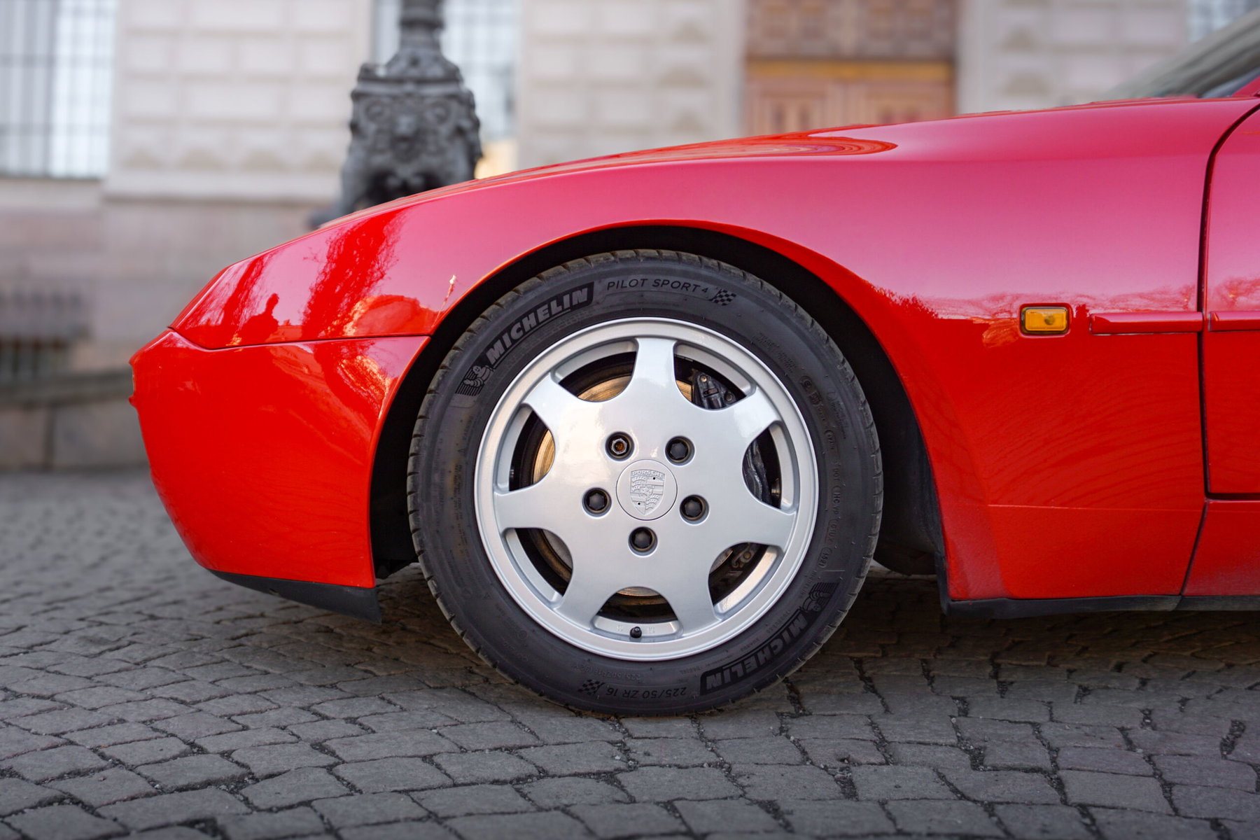 Boosting performance required significant engineering work: the 944 was the first mass-produced Porsche to use a ceramic port liner, and also the first whose power output remained the same regardless of whether a catalytic converter was installed or not. The engine featured an oil cooler, and the transmission was also upgraded. It had different gear ratios and was reinforced to handle the increased power. The suspension received progressive springs and was slightly stiffened. The brakes were also upgraded: the car used the same 12-inch discs as the 911, equipped with Brembo four-piston fixed calipers. The brakes were housed inside 16-inch wheels, with Fuchs wheels available as an option.
