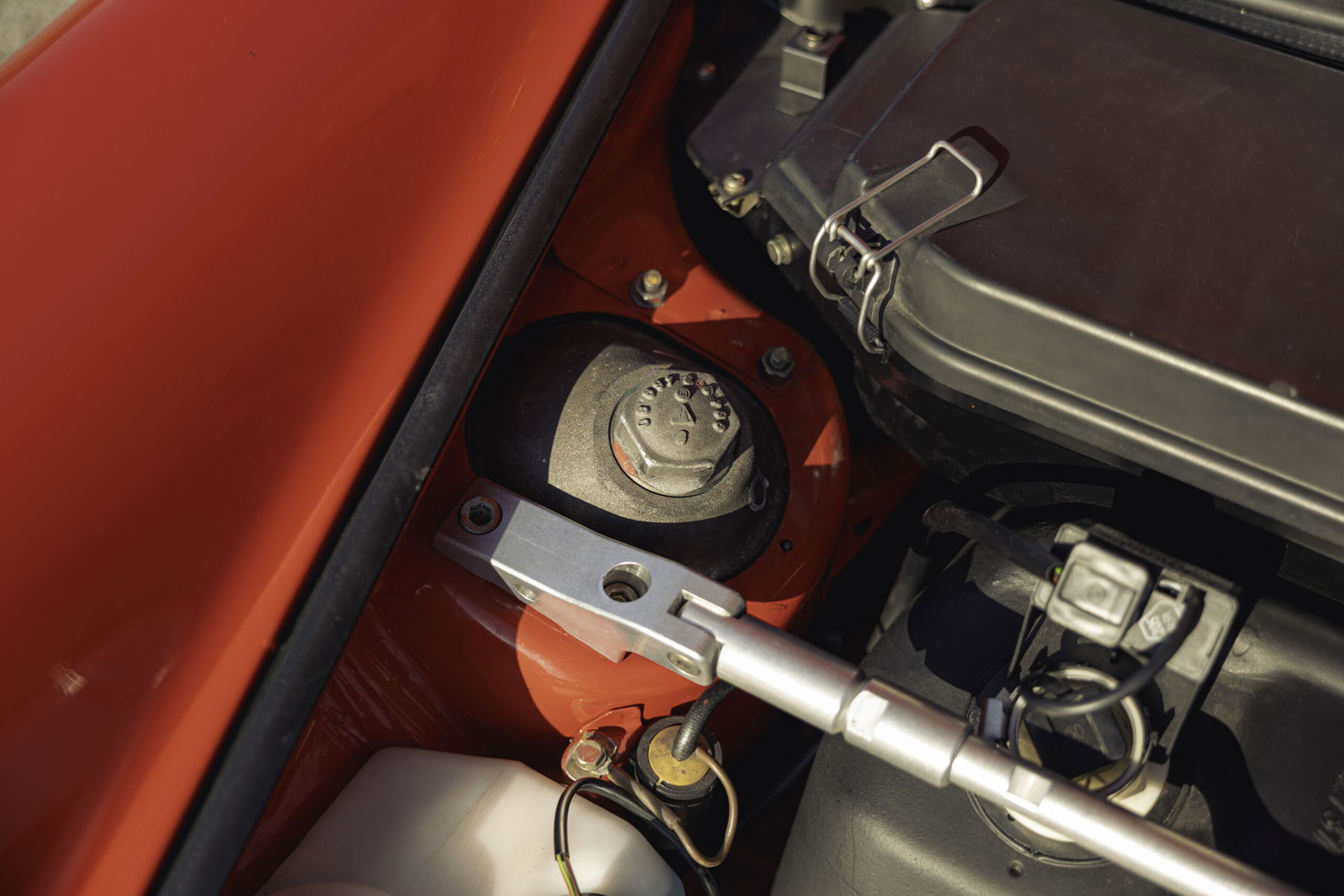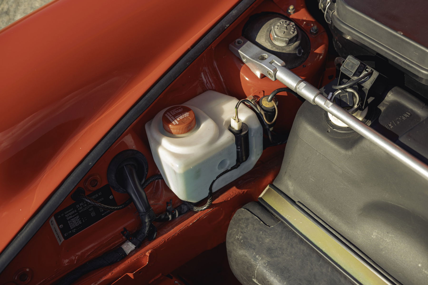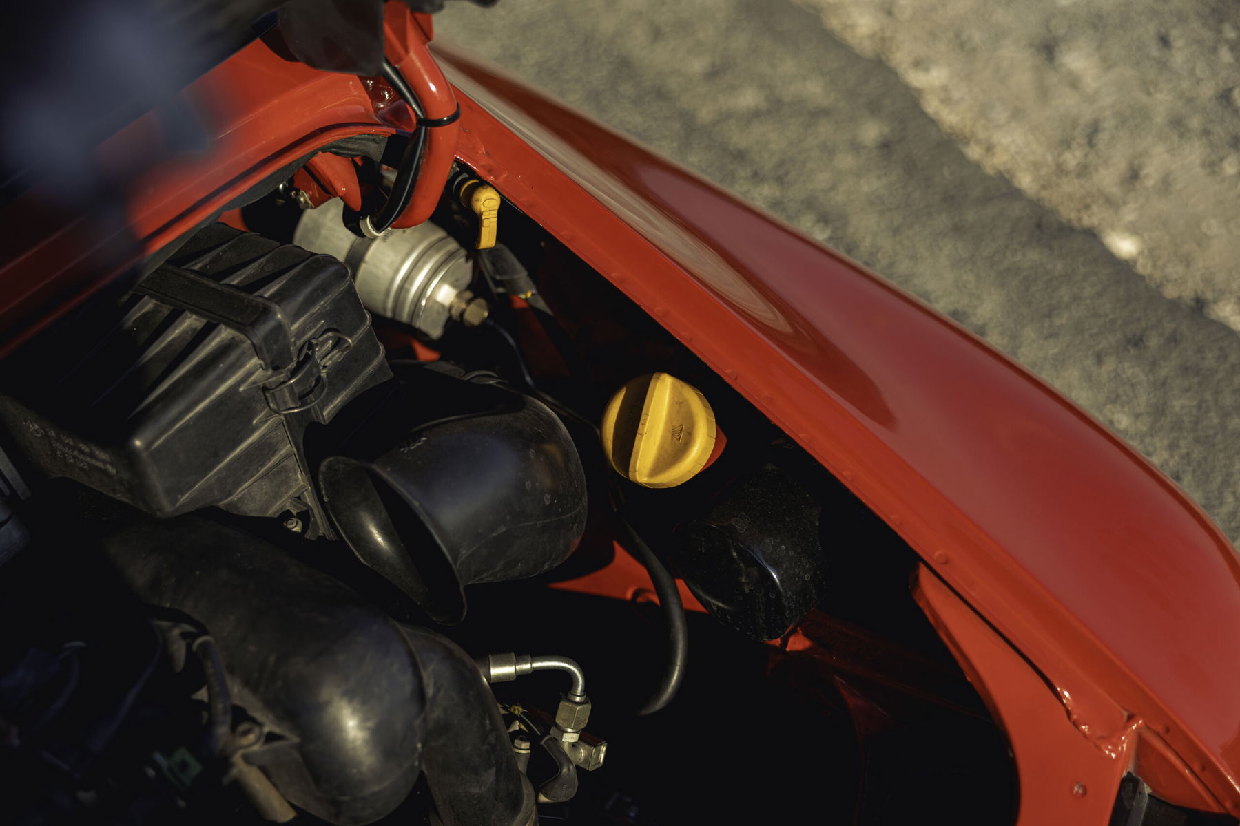 Exterior: The bodywork is sound. It has already been repainted in its original colour: Indian Red. The paintwork is in very good overall condition. We note some stone chips on the front. The car is equipped with its original headlight covers and STTI magnesium rims. The paint on the rims is peeling in places and they show some signs of rubbing.