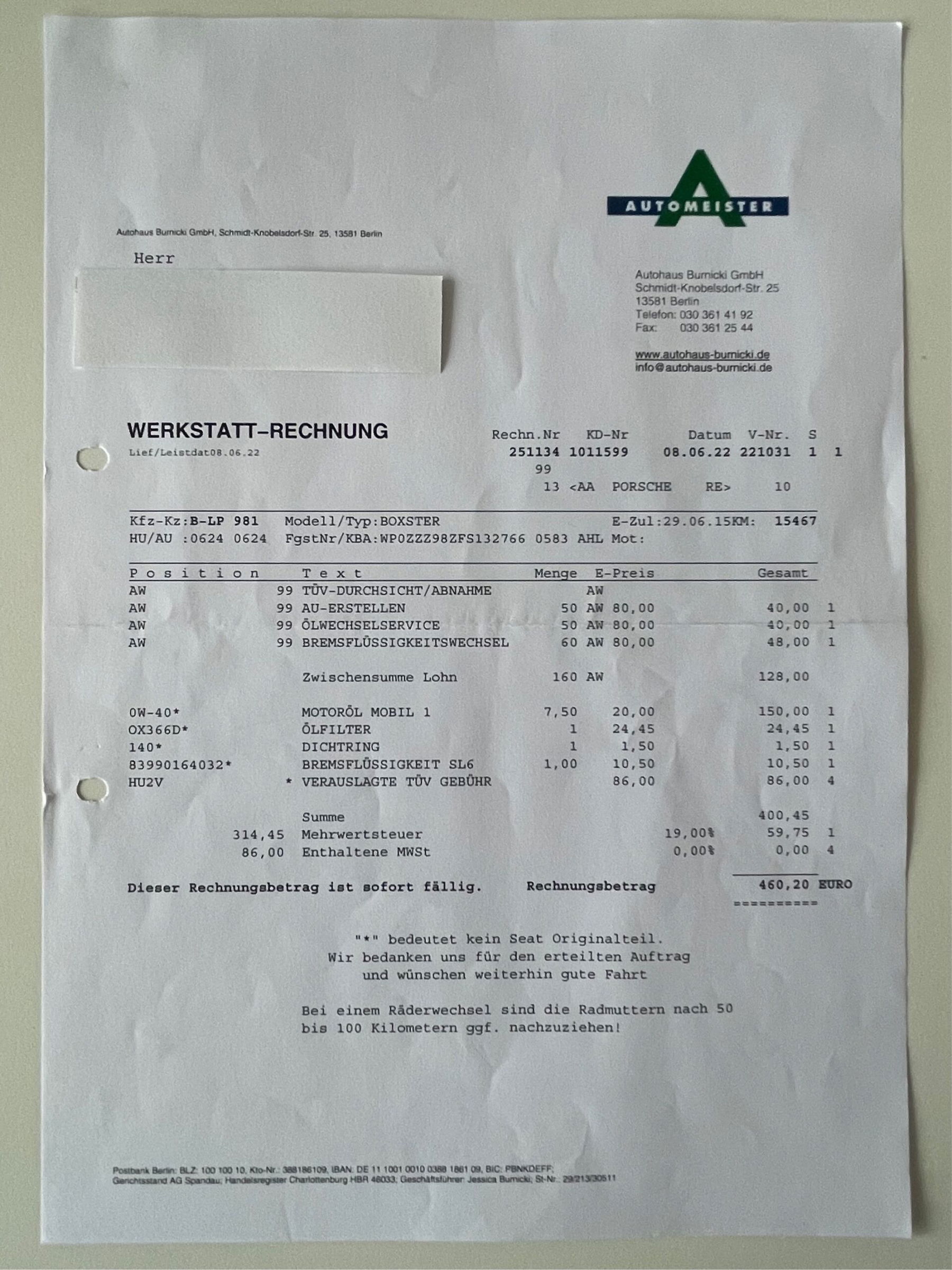 In spring 2024, the vehicle received ceramic sealing at a price of €952 gross from the above-mentioned company Theegarten (invoice available).