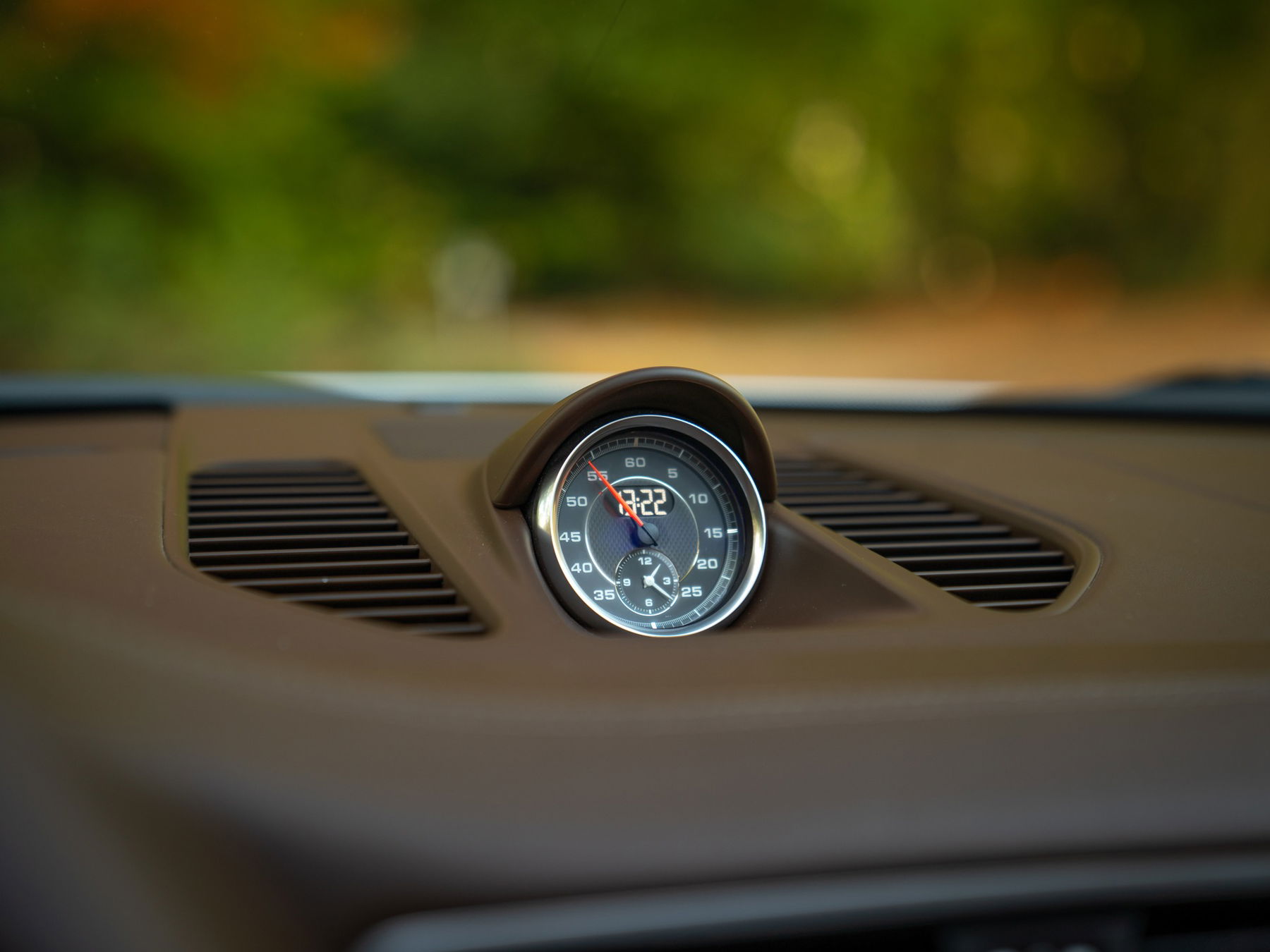 You get a completely different view when the beautiful brown soft top is lowered. The color of the fabric hood is not only particularly well chosen, it also reveals the composition of the cockpit: saddle brown leather is not just a theme, it is pretty much the only theme on board the 991.2 Cabriolet. From adaptive sports seats to the dashboard. From GT sports steering wheel to door panels. And the center armrest and gear knob are also finished in it. The dark brown leather exudes a sense of stylish luxury and exudes just as much cachet and elegance as the exterior. Clearly, a lot of thought has gone into this! It’s no coincidence that the Porsche emblems are proudly displayed on the headrests…