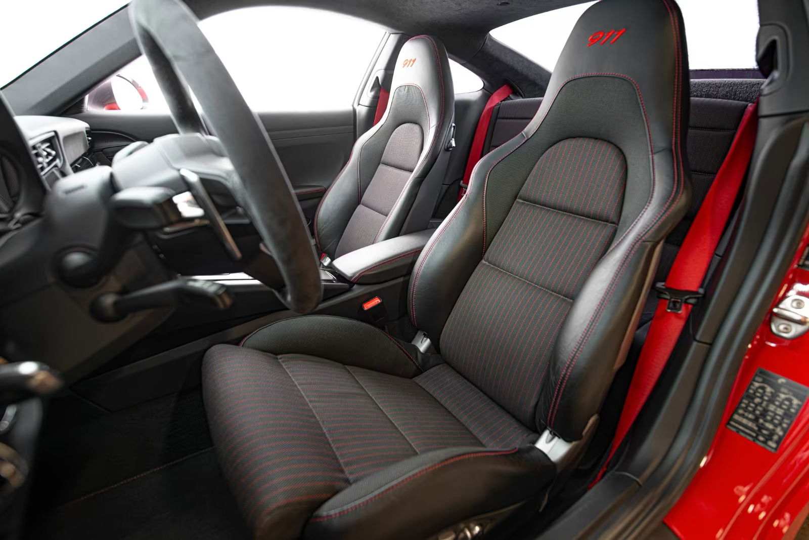 Welcome to this wonderful Guards Red 991.2 Carrera T. The bright red exterior highlights the contrast in its model-typical gray details in the mirror caps, grill and the stripe that also holds the model designation across the sides. A color that is also highlighted in the rims. Open the driver’s door and you are greeted by an interior that is also of course recognizable from the 991 model program, albeit with its own appearance. The sports seats are divided here by type and with pinstripe inserts. Everything is woven together with a contrasting seam in red that is also paired with belts in the same color. The driver’s environment is dominated by a steering wheel in Race-Tex just in front of the iconic five instrument panels. The door sides highlight details from their GT siblings with a red loop that replaces the door handles.