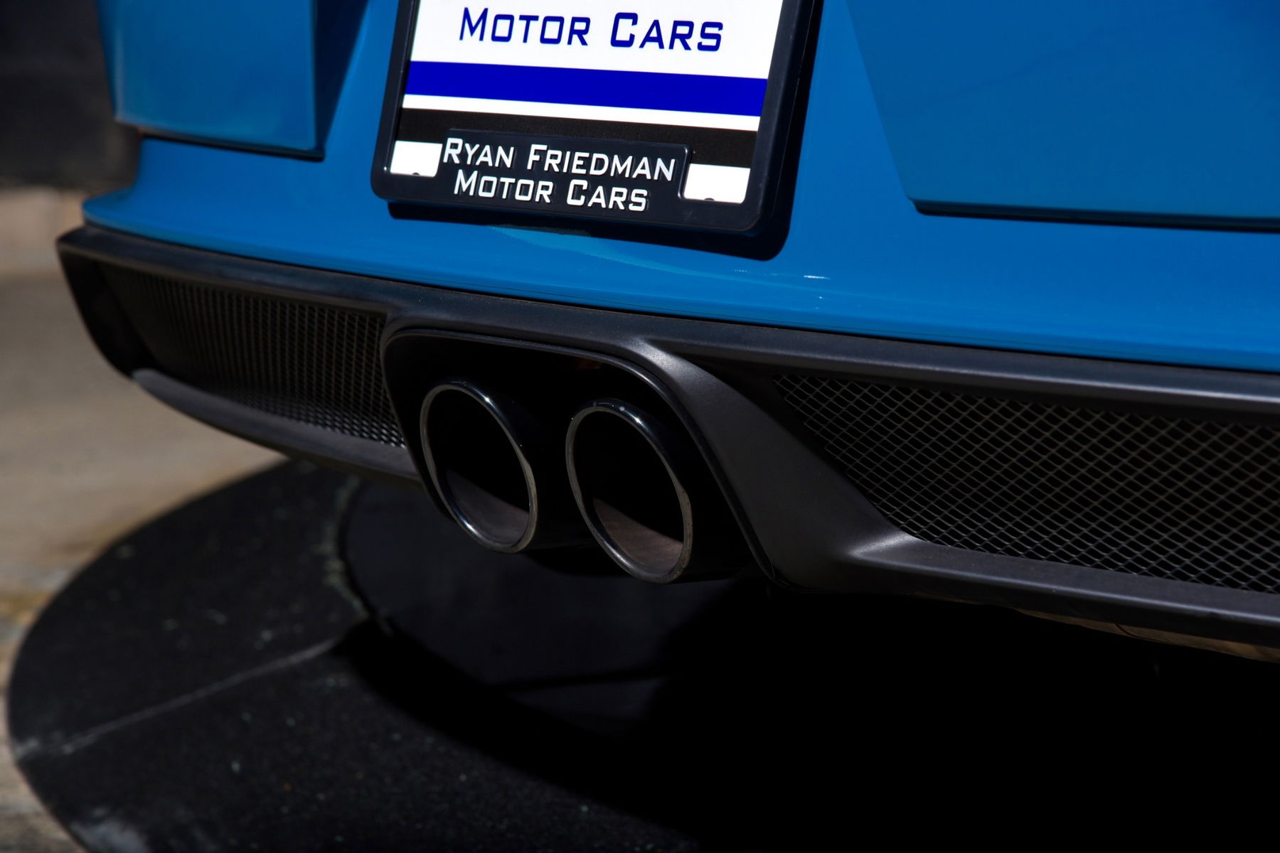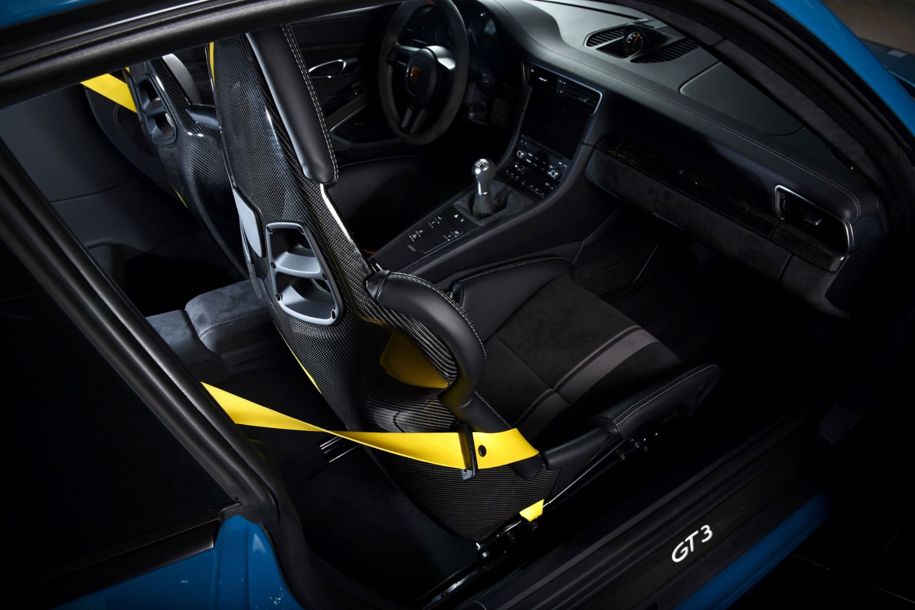 exuberantly finished in the seldomly specified paint-to-sample non-metallic tone of oslo blue. equipped with the immensely desirable full bucket seats, pccbs, front lift system, and chrono package. 1 of approximately 1,268 991.2 gt3 6-speed equipped coupes to have landed in north america with the 2018 model year designation and in its configuration of manual, model year, and market region, it’s 1 of around 152 to have been specified in a non-metallic paint-to-sample color with a cabin lined in leather/alcantara interior in black with platinum stitching.