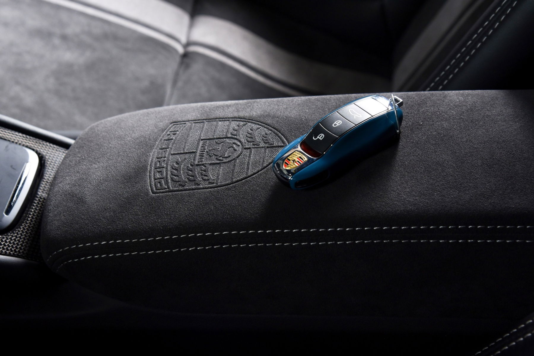 showcased on the model’s trademark multi-spoke 20-inch wheels boasting a satin aluminum finish and are positioned before yellow brake calipers of the highly sought-after porsche carbon ceramic braking system with its body completed in pts non-metallic oslo blue with a full bucket seat encompassing black leather/alcantara lined cabin featuring racing yellow seat belts and carbon fiber trim on select regions.