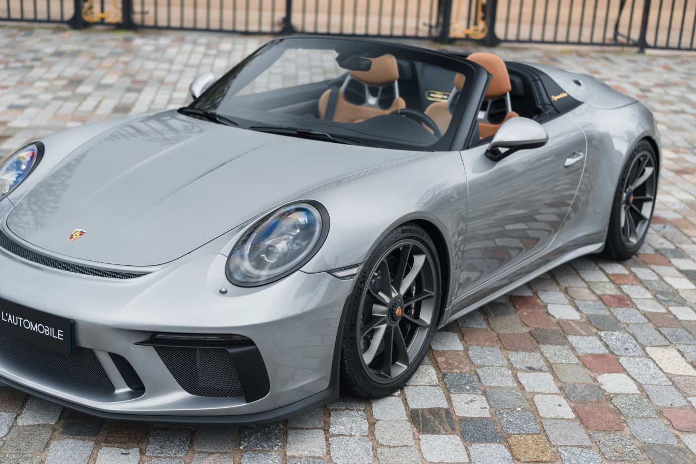 A true collector’s item and one of Porsche’s finest achievements of recent years, we are pleased to offer for sale a Porsche 991 Speedster in impeccable condition, still in its original paint, with only 7,500 kms. French second hand, delivered by Porsche Centre Clermont-Ferrand in November 2019, it features the Heritage Design Package and therefore GT Silver paint, with the Heritage Package decals deleted and Platinum wheels, and a full two-tone Cognac and Black leather interior, with interior details painted in Silver and carbon door sills as well as ceramic brakes.