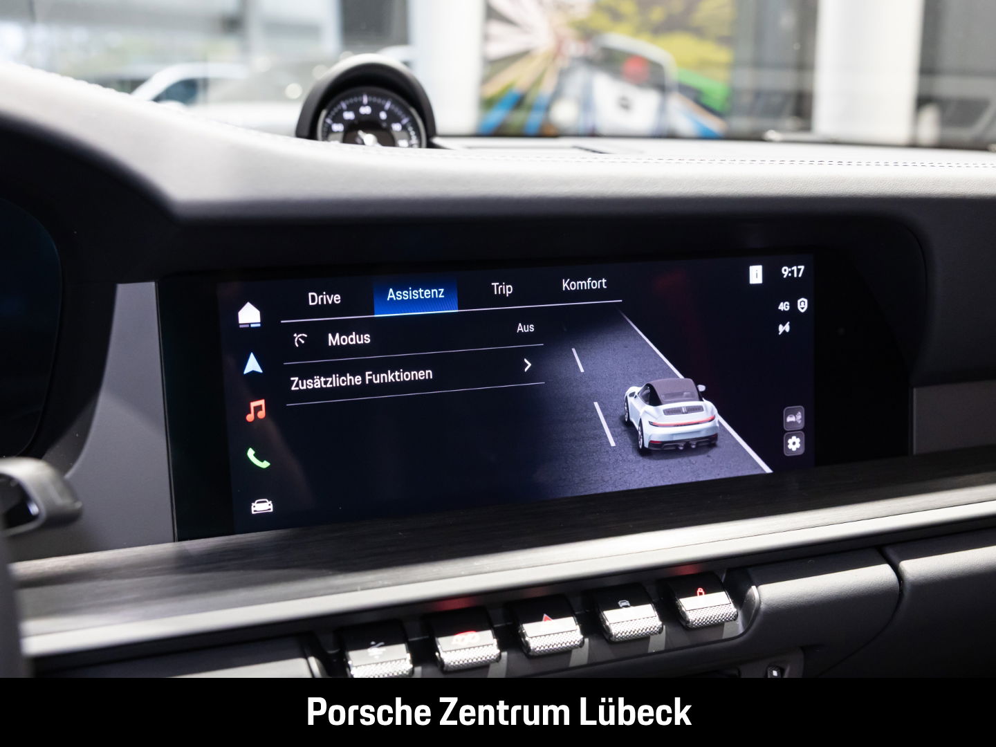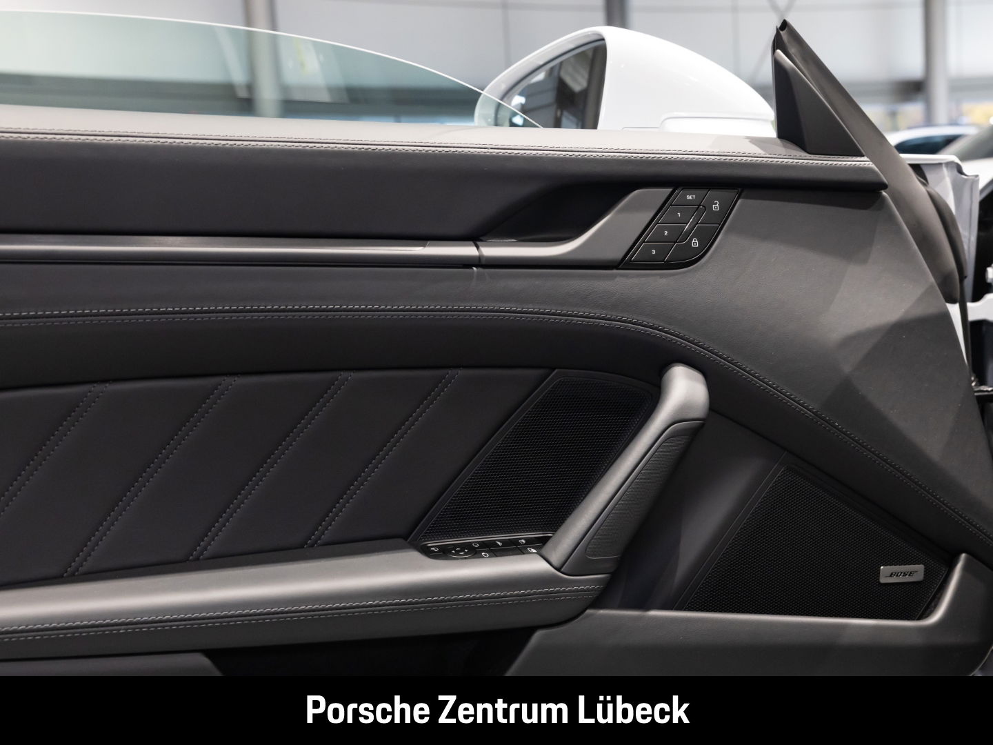 • Additional: (VR7) SportDesign sill trims painted in black (matt), (2RA) 911 lettering, (6FU) Mirror bases painted in exterior color, (6BB) Lamella inserts in rear lid painted in exterior color, (6F0) No GTS model designation on doors, (1N3) Power steering Plus, (2UH) Front axle lift system, (1G8) Tire sealant with electric compressor, (59C) 20-/21-inch RS Spyder wheels in anthracite gray, (2PJ) GT sports steering wheel in leather including steering wheel heating, (FZ1) Guards Red seat belts, (Q1J) Adaptive sports seats Plus (18-way, electric) with memory package, (3HB) Leather package 930, (4D3) Front seat ventilation, (3J7) Porsche crest on headrests, (2TH) Sports seat Plus backrest in leather with decorative element painted in exterior color, (9VL) BOSE® Surround Sound System, (8JU) HD Matrix LED headlights, darkened, (UD1) LED door projectors with "PORSCHE" lettering, (4GP) Windshield with gray tint, (4F2) Comfort access, (FT3) Surround View including Active Park Assist, (VC2) Garage door opener according to HomeLink® standard, (7Y8) Lane Change Assist, (8T3) Adaptive Cruise Control, (9R1) Night Vision Assist