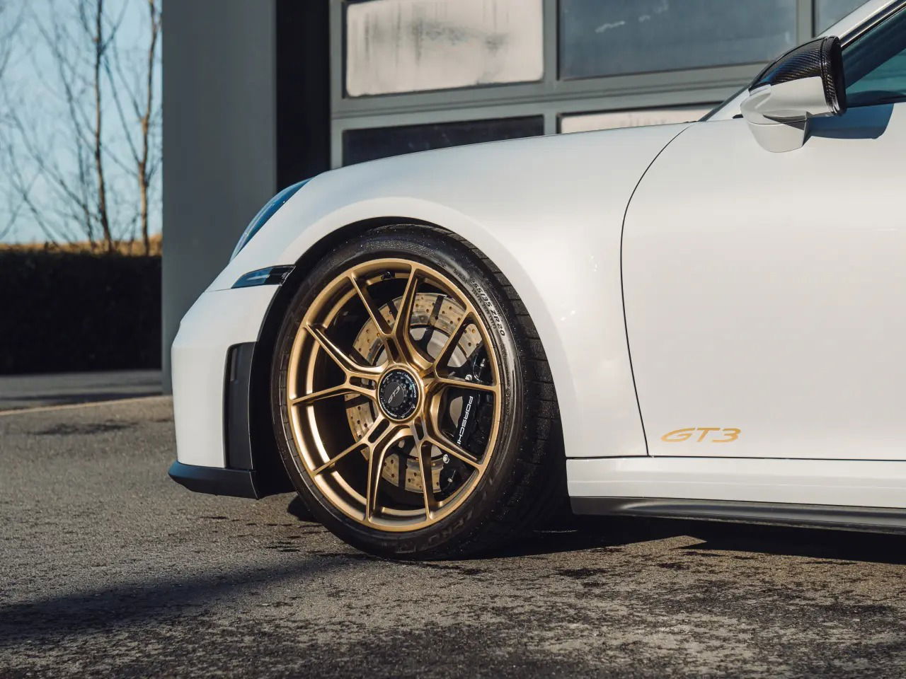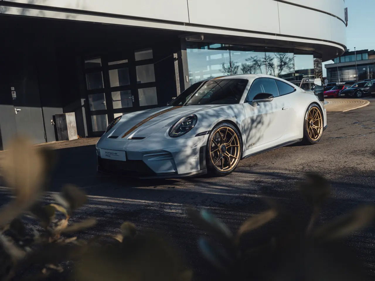 Interior: Lightweight sports bucket seats (folding), heated front seats, leather steering wheel, seat belts in Silver Grey, extensive interior package in matt carbon, personalized vehicle keys with painted cover, personalized door sill guards in matt carbon, illuminated, sun visors in Race-Tex, Porsche emblem on the center console in Race-Tex