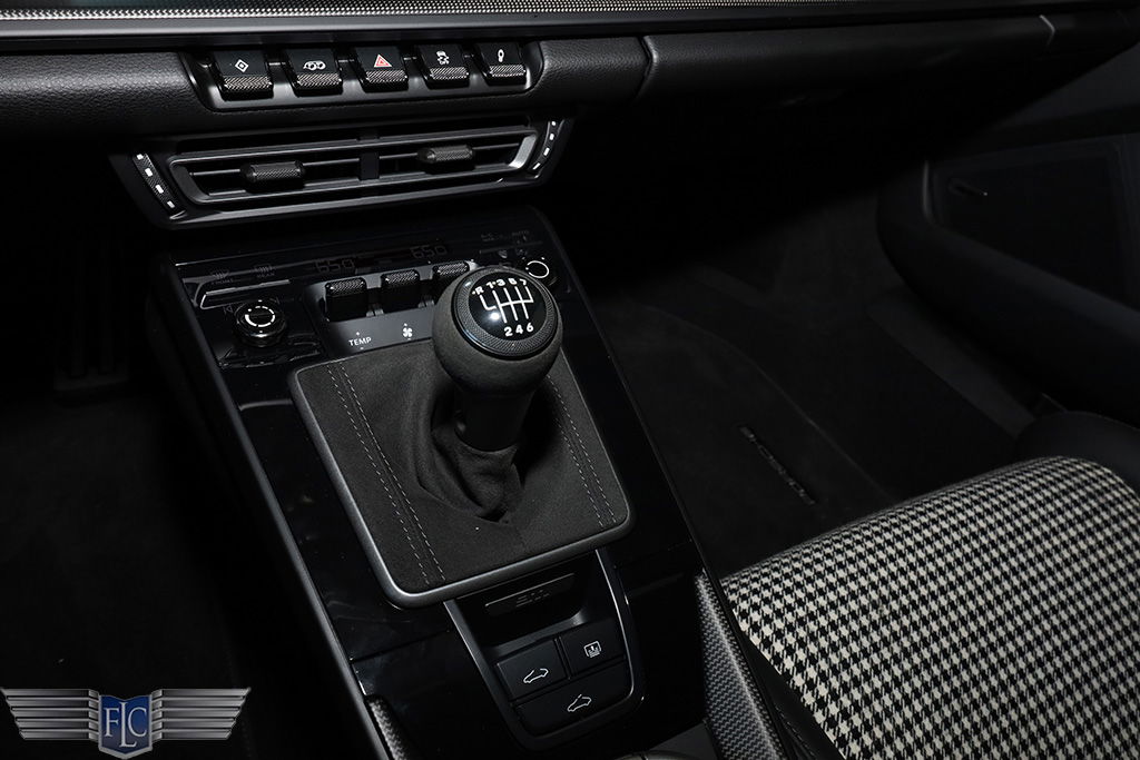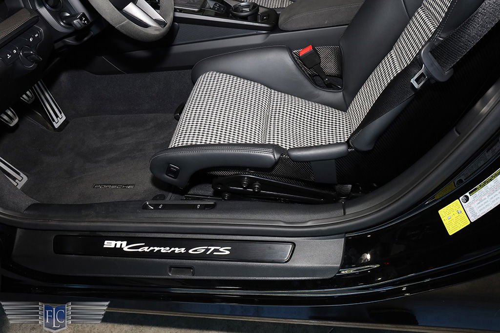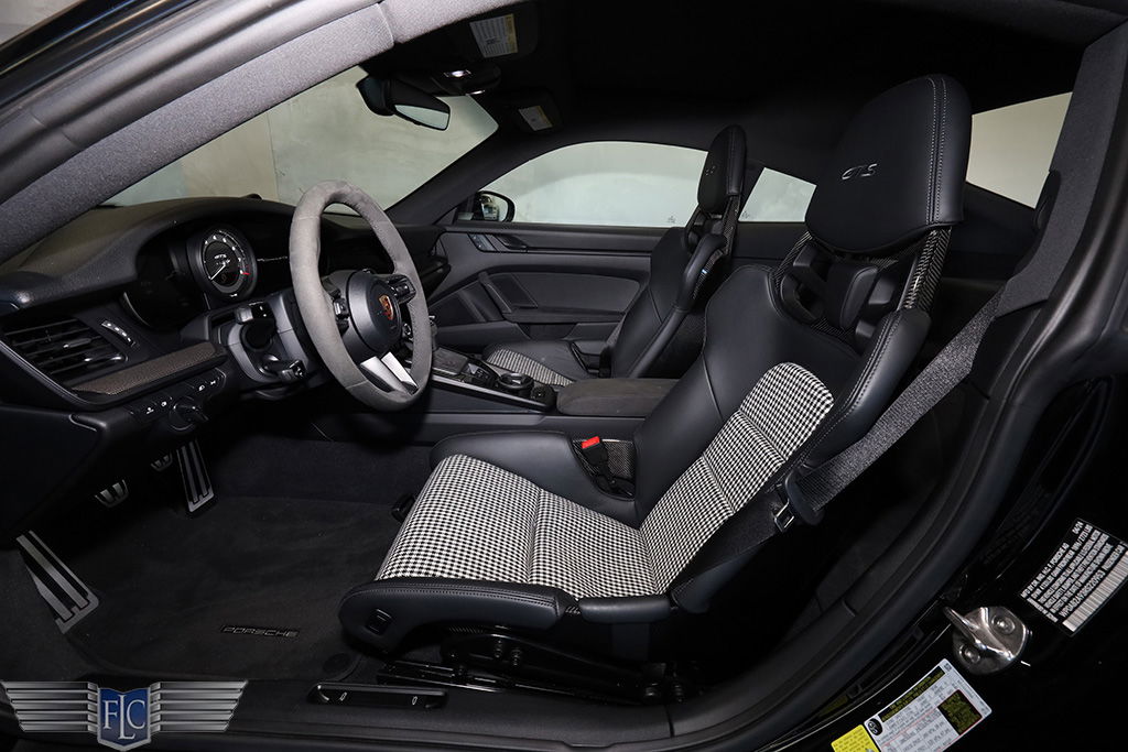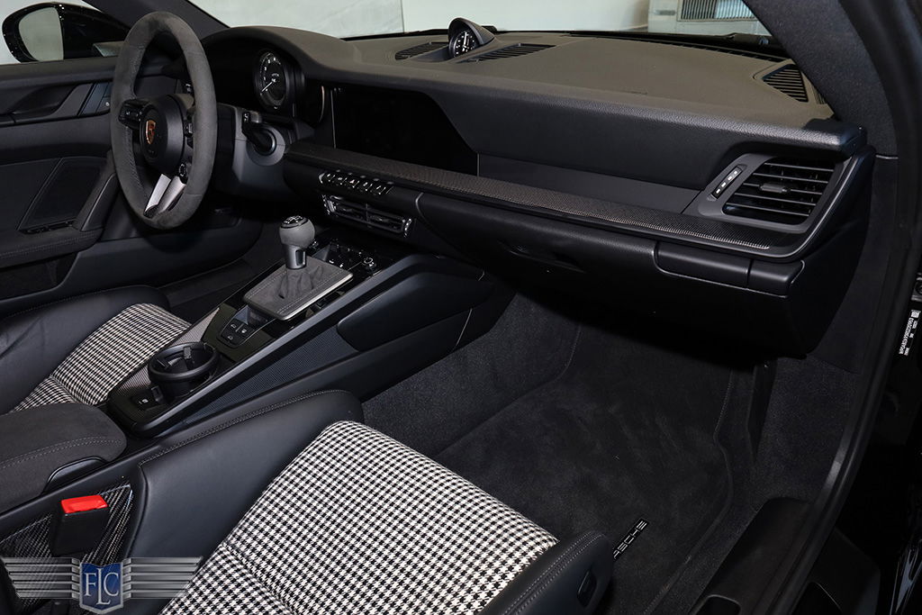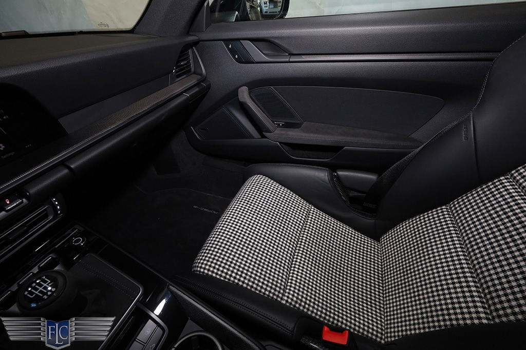 Inside the cabin, the GTS remains unmistakably 911, but with thoughtful upgrades. You’ll find a modern, driver-focused layout with high-quality materials, Carbon Fiber Bucket Seats with Houndstooth Seat Inserts, and optional carbon fiber trim. Standard features typically include Porsche’s adaptive sport suspension (PASM) with a 10mm lower ride height compared to the standard Carrera, and rear-axle steering becomes standard on the GTS, enhancing high-speed stability and low-speed maneuverability. This being a 2024, it is the last year you could get a Manual Transmission which this car has!