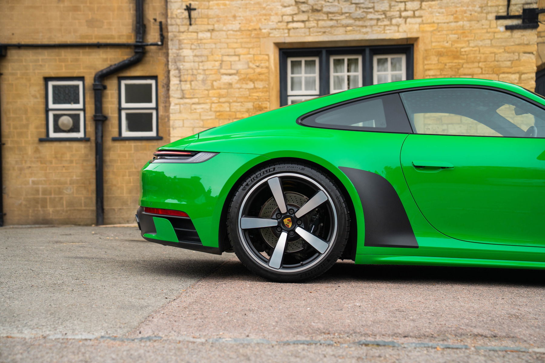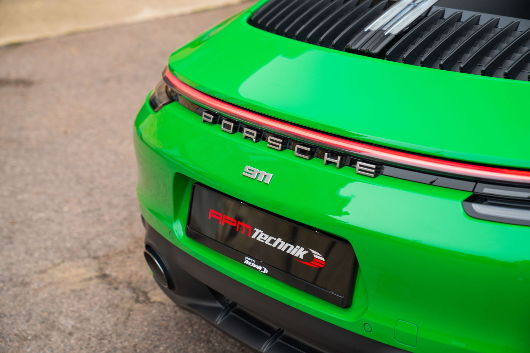 Python Green, 7-speed manual transmission, 4-way electric sport seats plus in black leather with Sport-Tex seat centres, Electric slide/tilt sunroof, Sport design package, Sport design side skirts, Sports exhaust system, Park assist front and rear with reversing camera, Brake calipers painted in black, Exclusive design taillights, GT sports steering wheel in leather, Electric folding wing mirrors, Exterior mirror bases painted in black high gloss with lower trim in exterior colour, 20/21″ Carrera exclusive design wheels.