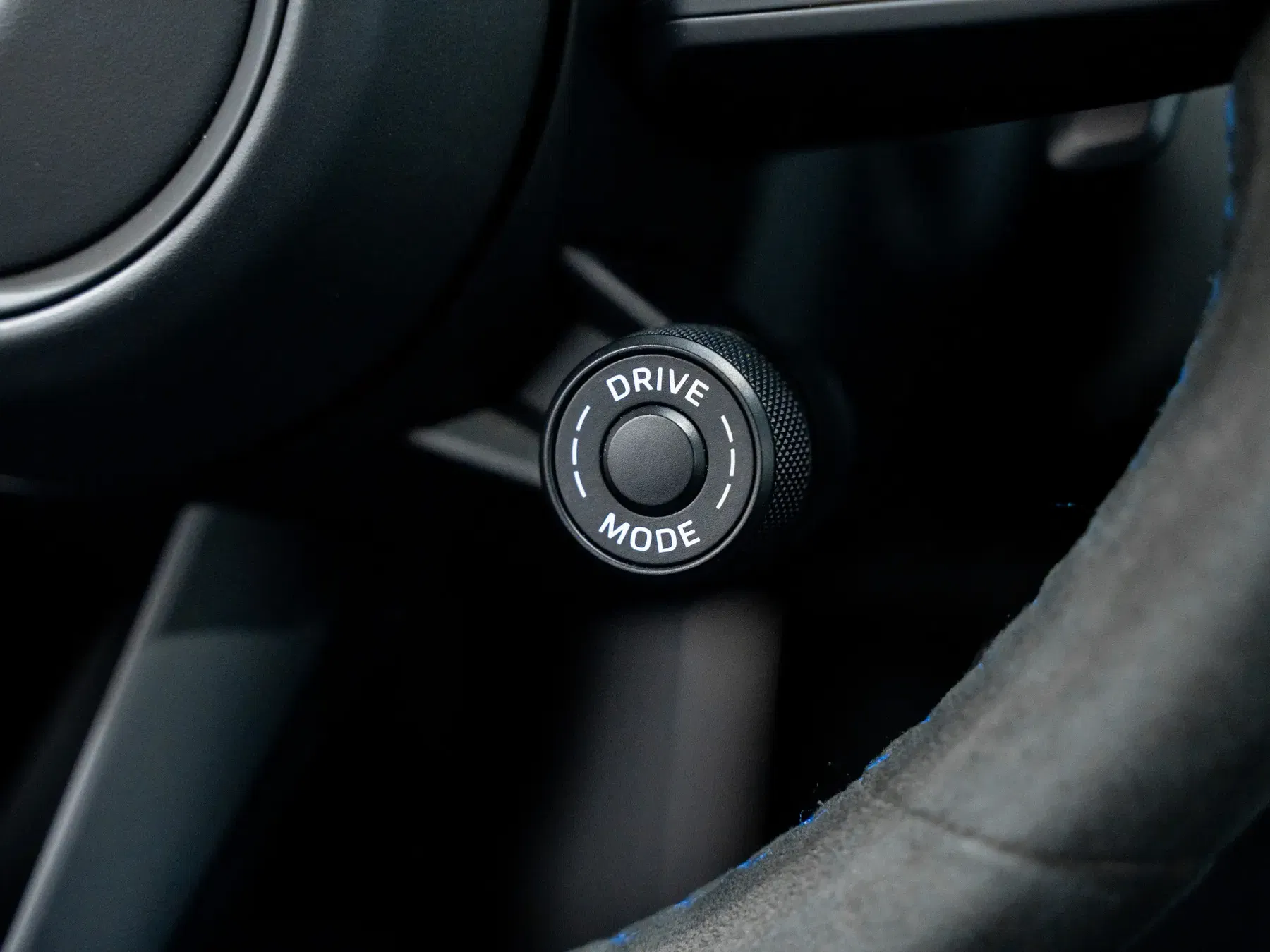 Multifunction GT3 sports steering wheel in smooth black leather with 12 o’clock marking, shift paddles, and driving mode switch