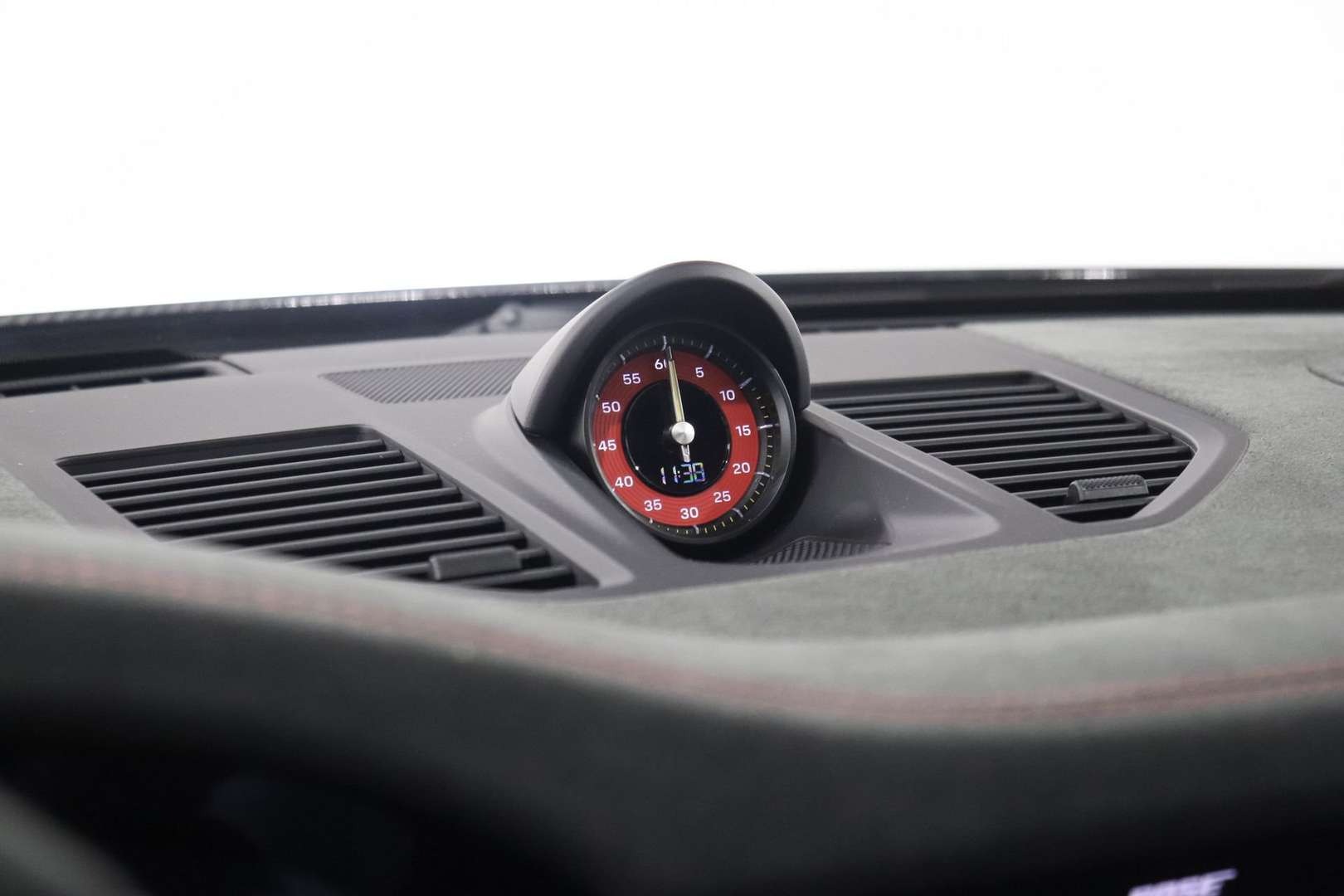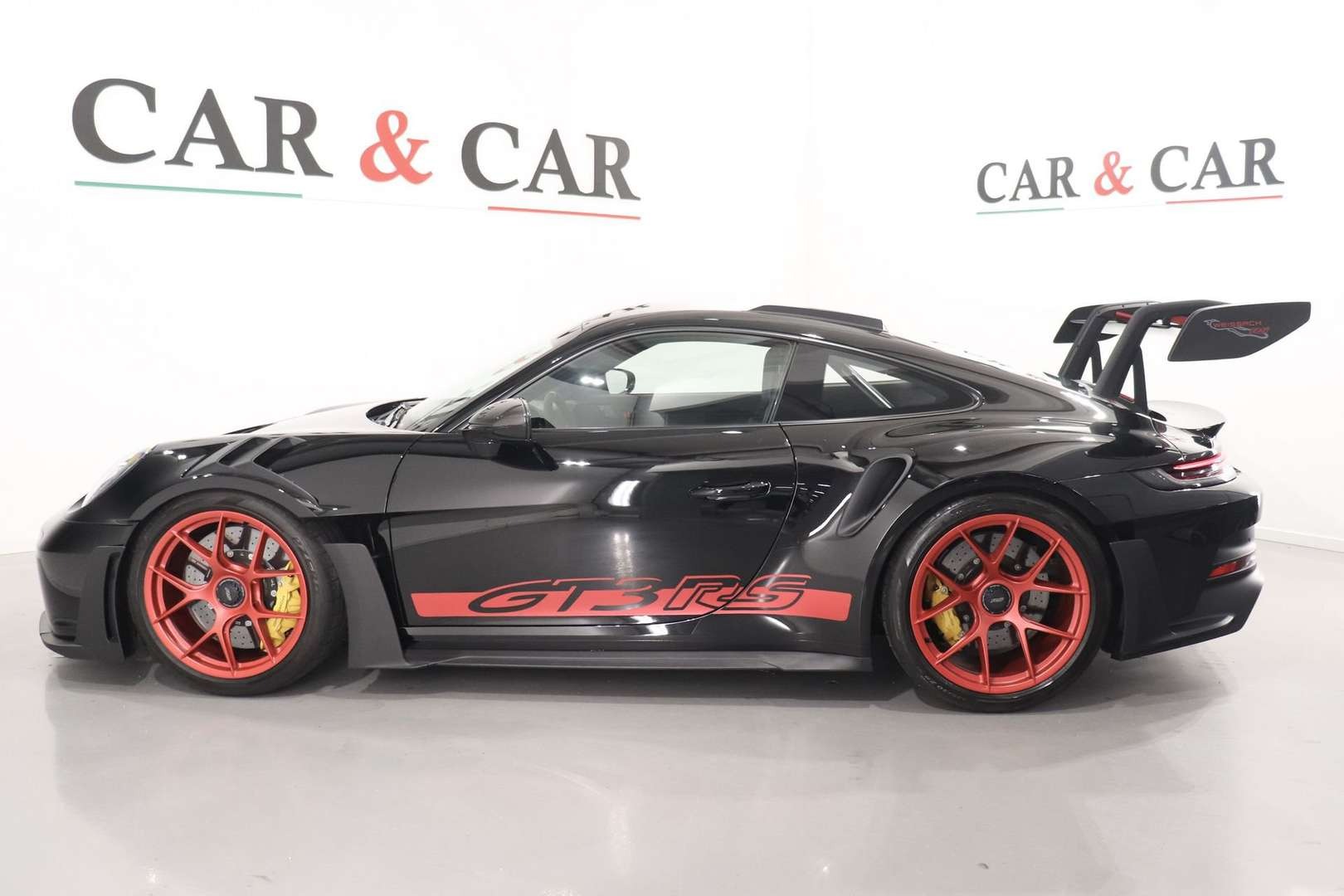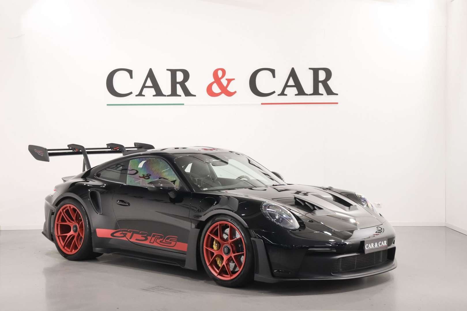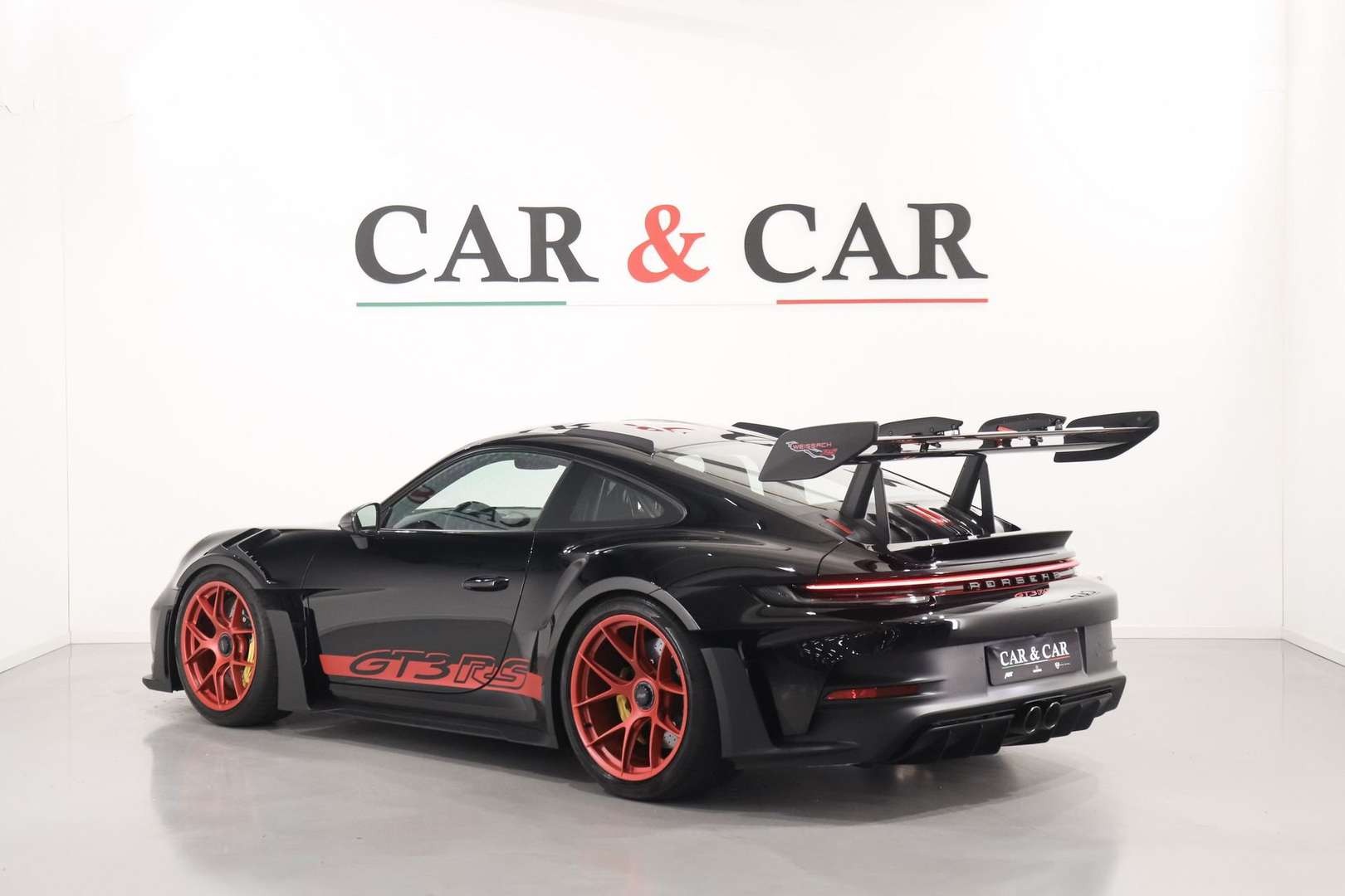 90-liter fuel tank – Porsche Ceramic Composite Brake (PCCB) – Wheels painted in Pyro Red – Front axle lift system – 20/21-inch lightweight forged magnesium wheels GT3 RS – Club Sport package with 1 kg road-approved fire extinguisher. -Preparation for trim logo package – Door sill trims in matt carbon, illuminated – LED main headlights with Matrix technology, dark-tinted, incl. Porsche Dynamic Light System Plus – Red speedometer – dial Porsche Dashcam preparation – BOSE Surround Sound System – Logo package – Weissach RS side logo on the colored rear