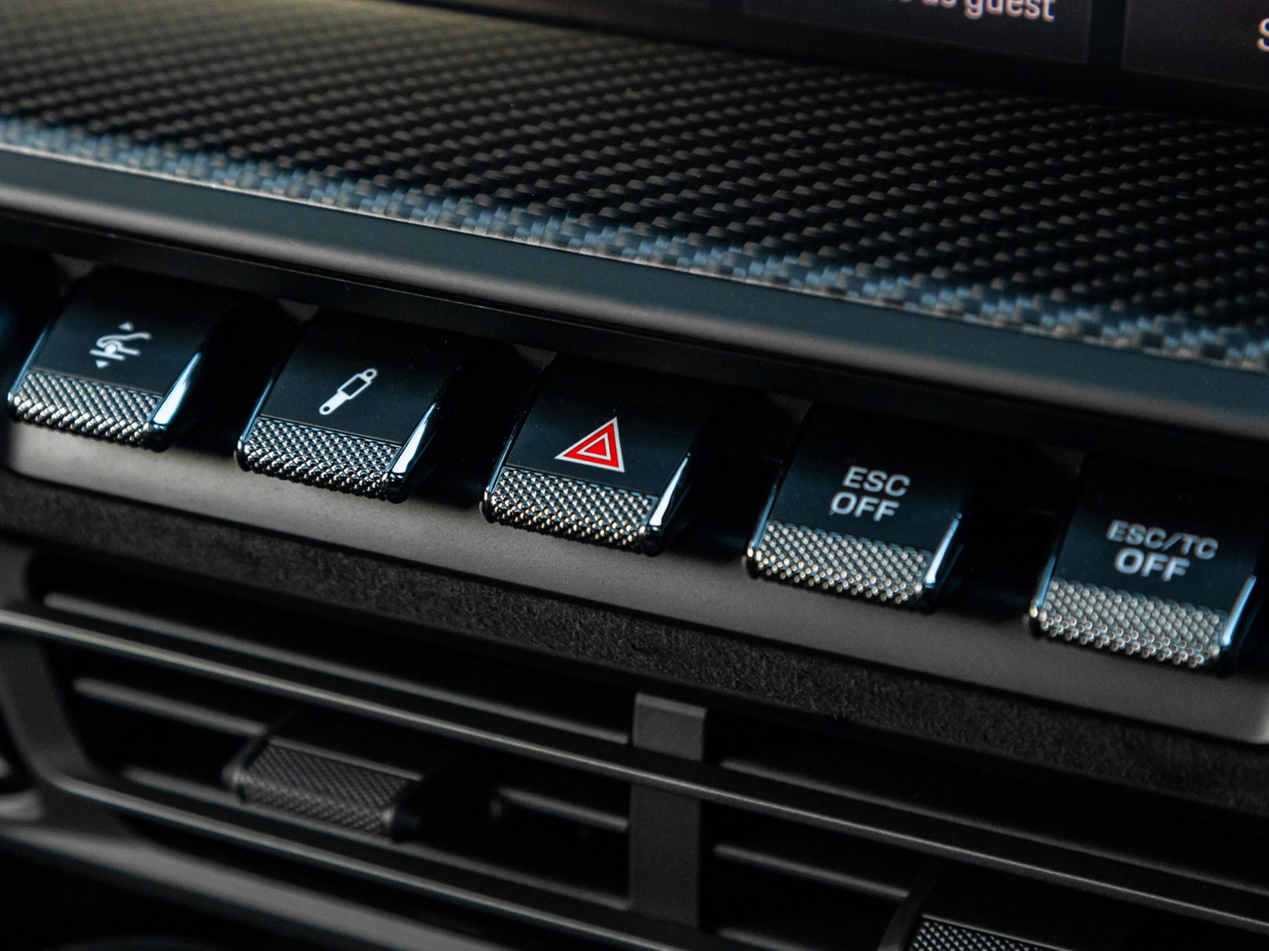 WEISSACH PACKAGE WITH ROLL CAGE (£29,600) Includes – Front lid, roof, window triangle and exterior mirrors upper shell in visible carbon (high-gloss), rear wing (movable part) in visible carbon (high-gloss) and with “PORSCHE” lettering on the underside. Bolted rear roll cage in visible carbon (satin finish), door pull handle in visible carbon (satin finish), PDK gearshift paddles made of magnesium with rear milling and magnetic technology, upper part of gearshift panel covered with Race-Tex black, badge with Weissach package logo on passenger side, headrests with embroidered Weissach package logo and enclosed 6-point seat belt for driver and passenger side in black. CHASSIS – Stabilisers on front and rear axle, coupling rods on rear axle as well as thrust field made of carbon fibre reinforced plastic (CFRP), forged Magnesium lightweight wheels.