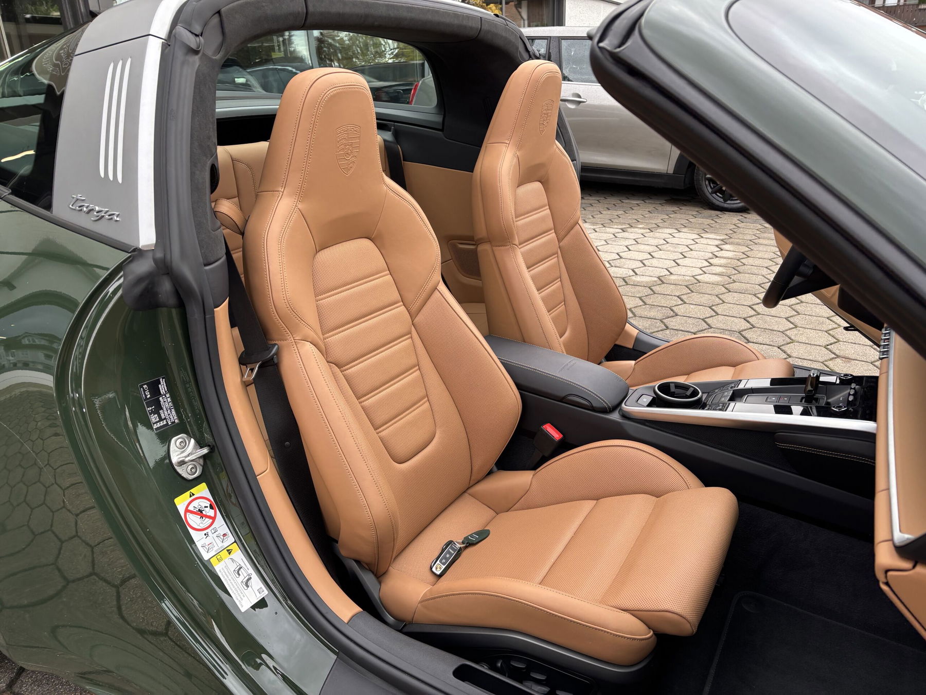 Driver/passenger airbag, Drive type: All-wheel drive, Aspherical exterior mirror, left, Electrically adjustable and heated exterior mirrors, both, LED turn signals, Connect Plus (Bluetooth, Apple CarPlay, Wi-Fi, Vehicle tracking system), fabric headliner, anti-theft alarm system with interior monitoring, tachometer, automatic headlight activation, door sill guards with model designation (aluminum), driver assistance system: Hill start assist (Hill Holder), Driver assistance system: Collision warning system with brake intervention and pedestrian detection, Floor mats, 8-speed transmission '8211; dual-clutch transmission (PDK), Cup holders, LED rear lights, Heated rear window, Rear spoiler, Interior filter: Activated carbon filter (odor filter), Isofix mountings for child seat on front passenger seat, body: 2-door, Keyless Drive, coat hook on leather seat backrest, 2-zone automatic climate control, head airbag system Porsche Side Impact Protection System (POSIP), front head-shoulder airbag (thorax bag), Mobile online services Android Auto, 3.0-liter engine – 331 kW KAT, gasoline particulate filter (OPF), electric parking brake, Porsche Active Suspension Management (PASM), Porsche Communications Management (PCM) incl. Online – Navigation module, Porsche Torque Vectoring Plus (PTV Plus), Porsche Traction Management (PTM), digital radio reception (DAB+), tire pressure monitoring system, low emissions in accordance with Euro 6d emissions standard, model series lettering, painted sill covers/trim, Sport button, start/stop system, Targa, Uni paint finish, Vehicle Tracking System (PVTS), electric soft top, tinted glazing