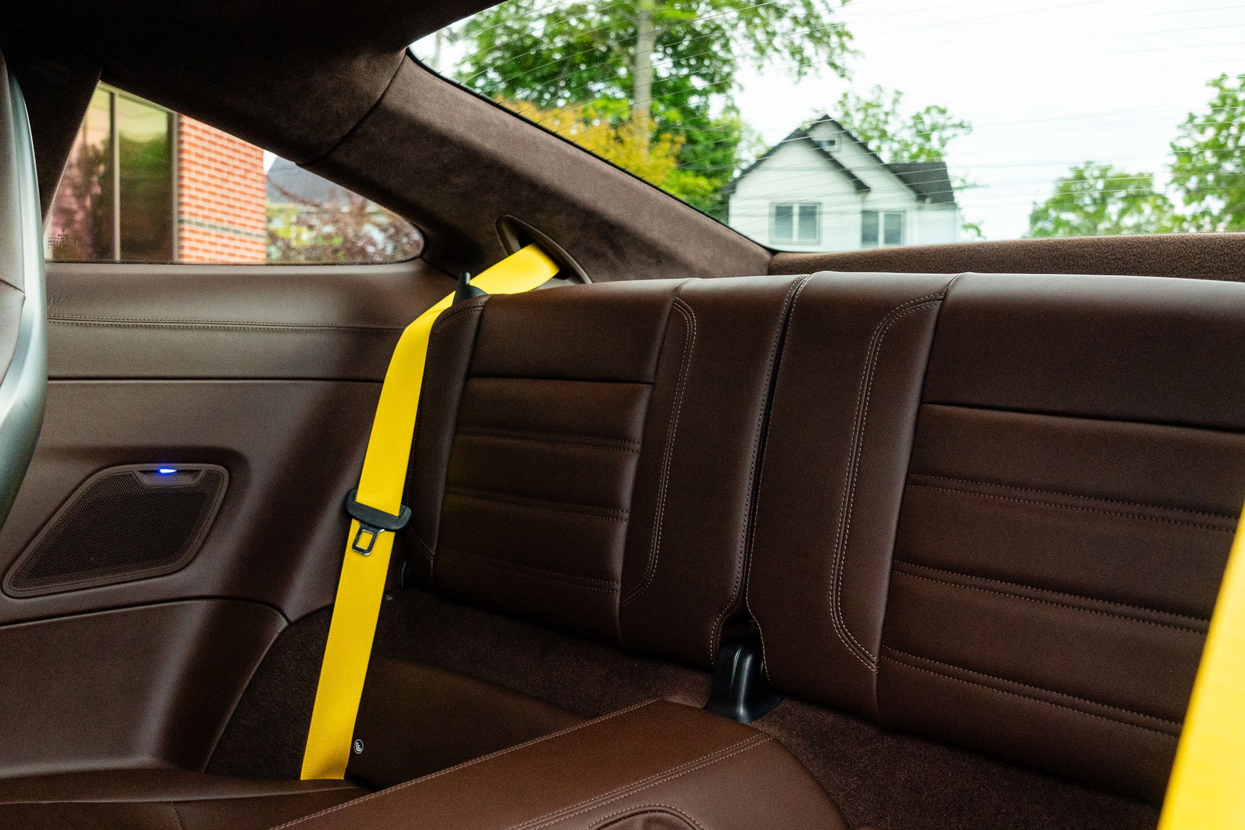 Moving inside the car, the luxurious Truffle Brown leather that was ordered from the factory, encases the seats, steering wheel, dash topper and steering column, now extends onto the center arm rest and rear passenger tunnel which both used to be black. The original seat belts were swapped for a set of yellow belts both front and rear, which now match the tachometer and SportChono dial which have also been professionally finished in yellow. Behind the steering wheel, a set of wonderful feeling magnetic shift paddles have been installed from a GT3, and the full PDLS Dynamic Light System has been purchased from Porsche, and installed for superior lighting.