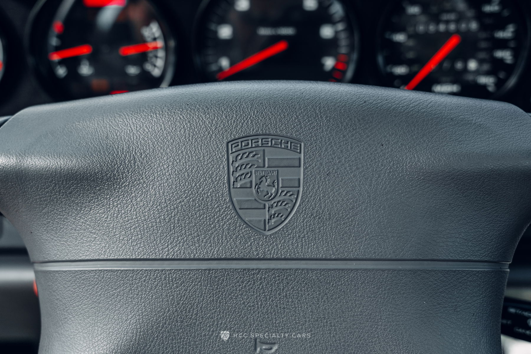 HCC is proud to present this two-owner 1995 Porsche 911 Carrera 2 coupe. Showing just over 34k miles, it was purchased new in Arizona and shortly thereafter moved to the San Antonio area along with it’s original owner, where it has resided ever since. Finished in Guards Red over a Classic Grey interior, factory equipped options included 17″ Cup Design Wheels, Power Seats, AM/FM Radio with Cassette Player, and an Electric Sliding Sunroof. The factory power comfort seats have been replaced with power hardback sport seats in matching Classic Grey, the 17″ Cup II wheels have been removed in favor of 18″ Turbo Twist wheels, and a Carrera RS style front splitter has been added to the front bumper (The RS Splitter is removable). Otherwise highly original, it presents incredibly well as would be expected given the low mileage.
