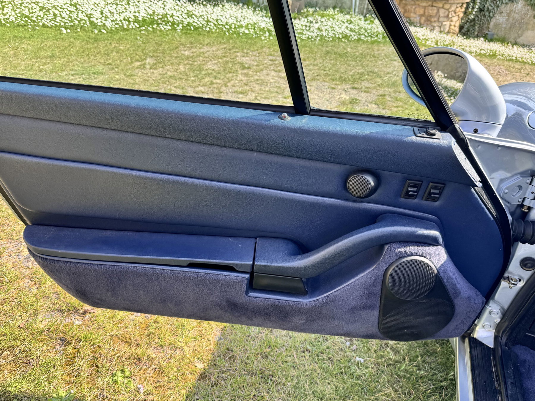 - A rare color combination featuring silver metallic paint, dark blue Raff leather upholstery, and a dark blue soft top.