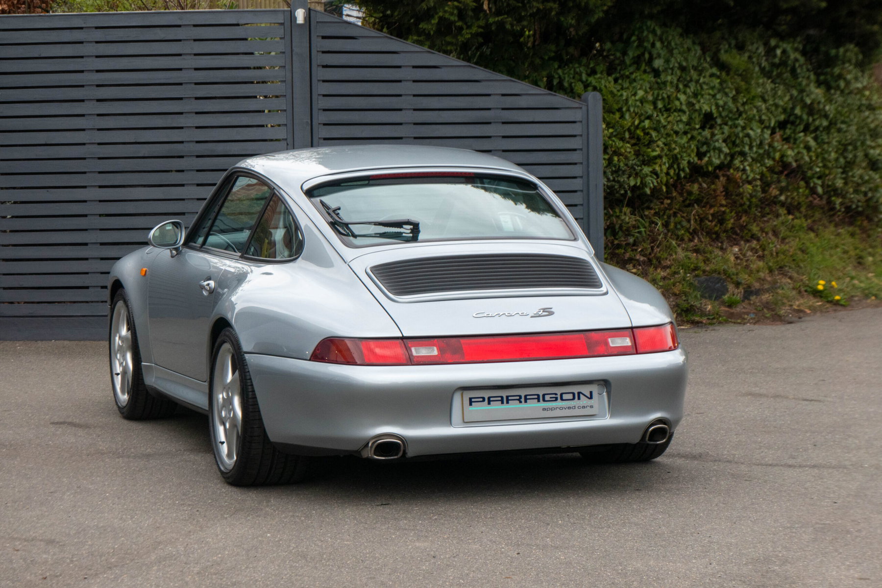 Porsche 911 Carrera 4 S Coupe (993) 6-speed manual, Polar Silver, Dark blue leather hard backed sports seats, electric windows & mirrors, 18″ Turbo wheels, four wheel drive, power steering & anti-lock brakes, twin airbags, headlamp wash system, rear wiper, on board computer.