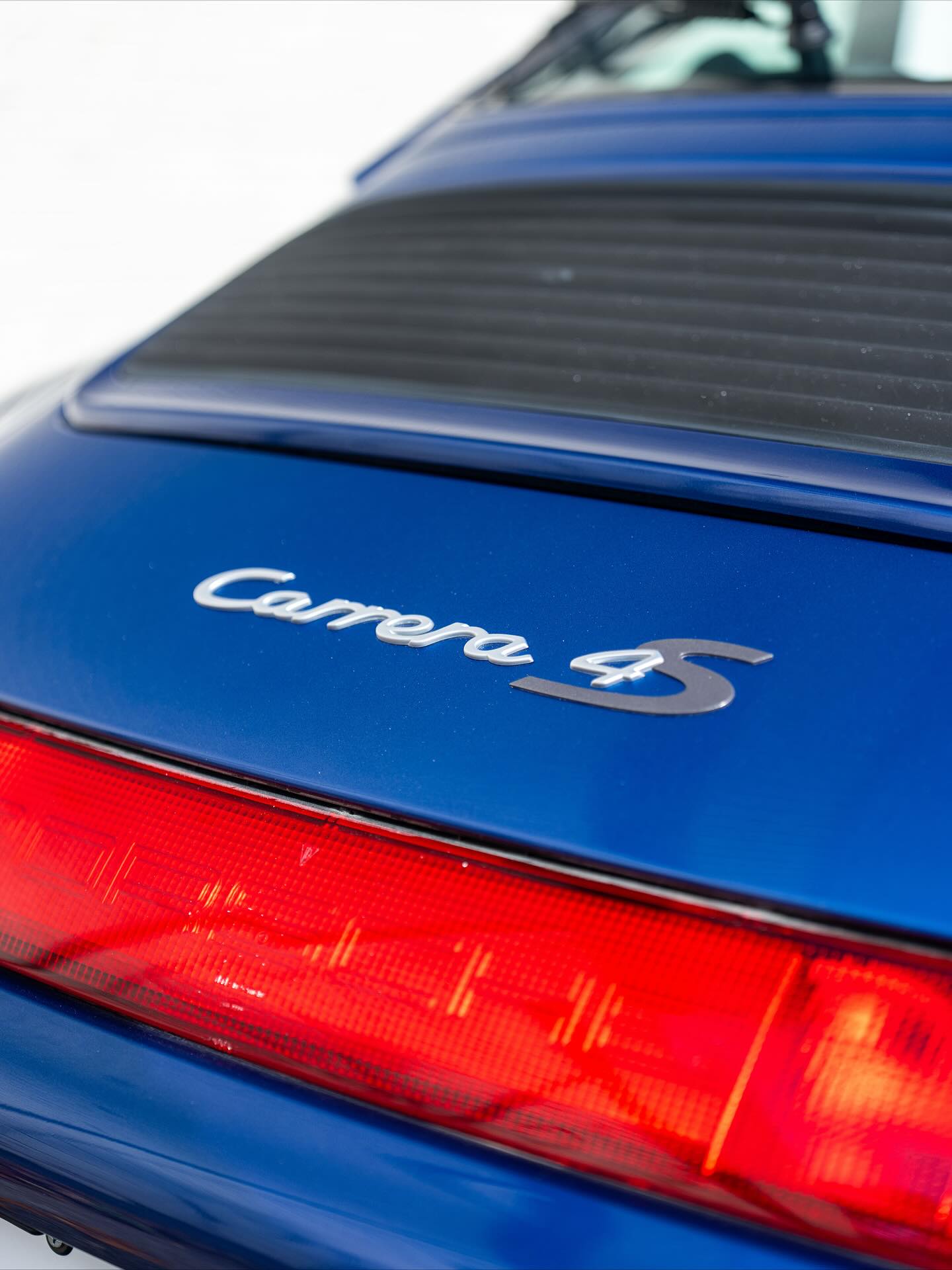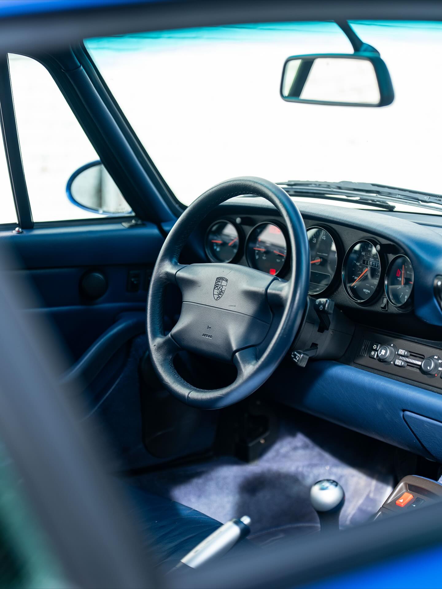 inside, fully power-adjustable sport seats finished in midnight blue leather embrace front occupants, while its jubilant exterior finish is complemented by the signature 18-inch turbo twist wheels finished in silver. the c4s delivers the perfect balance of poise and presence, combining the turbo’s widebody stance, all-wheel-drive system, and upgraded brakes with the visceral character of a naturally aspirated flat-six, making it one of the most coveted iterations of the 993 era.