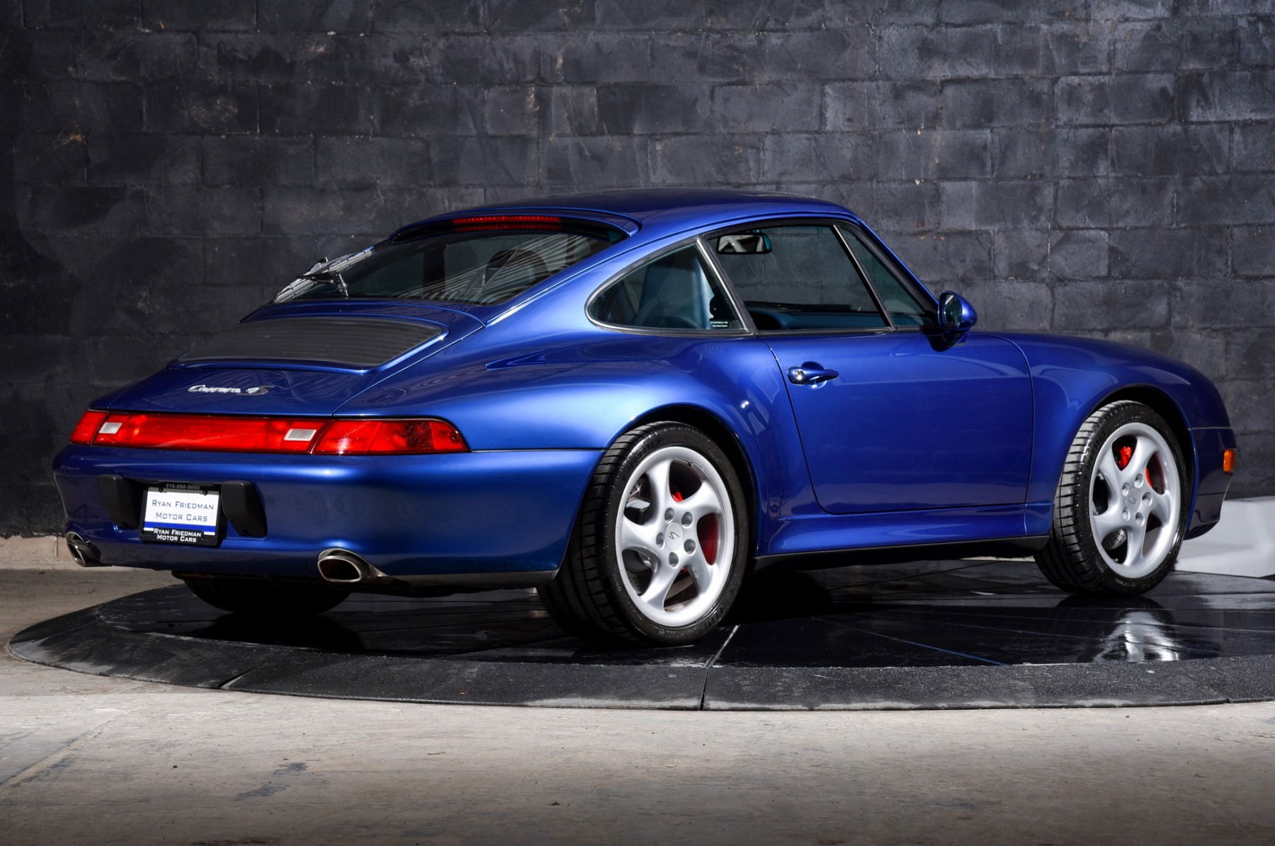 inside, fully power-adjustable sport seats finished in midnight blue leather embrace front occupants, while its jubilant exterior finish is complemented by the signature 18-inch turbo twist wheels finished in silver. the c4s delivers the perfect balance of poise and presence, combining the turbo’s widebody stance, all-wheel-drive system, and upgraded brakes with the visceral character of a naturally aspirated flat-six, making it one of the most coveted iterations of the 993 era.