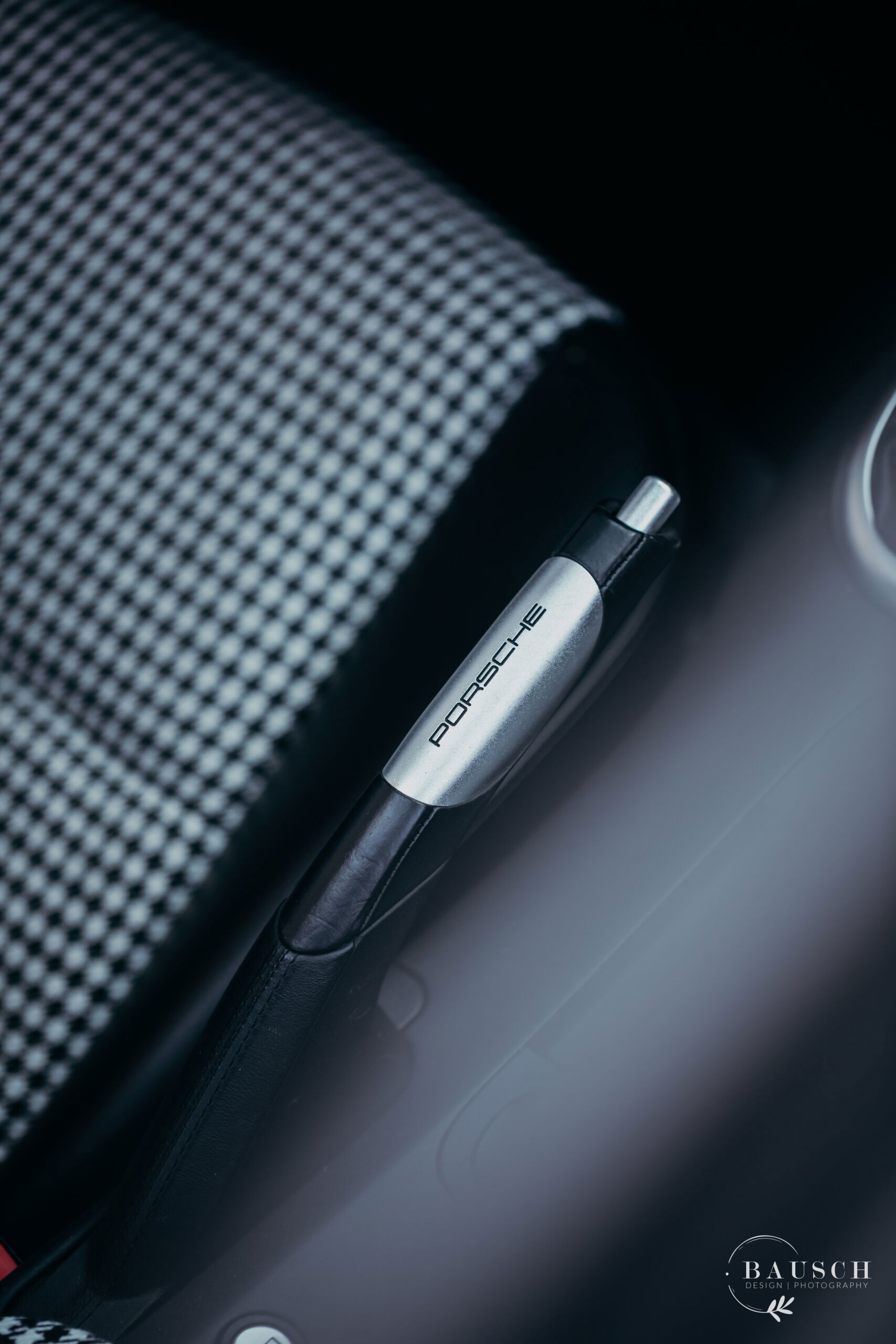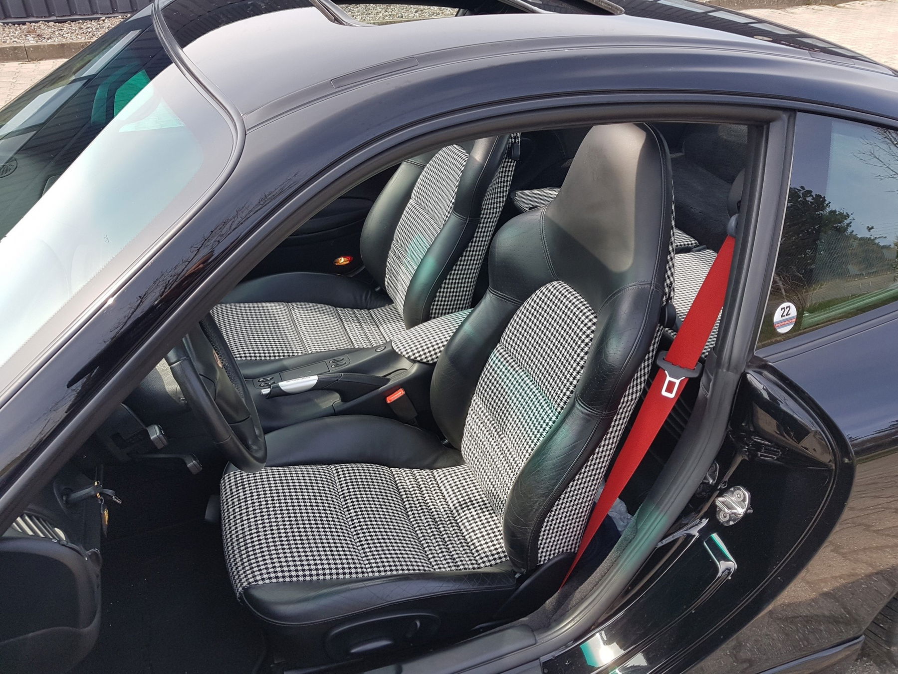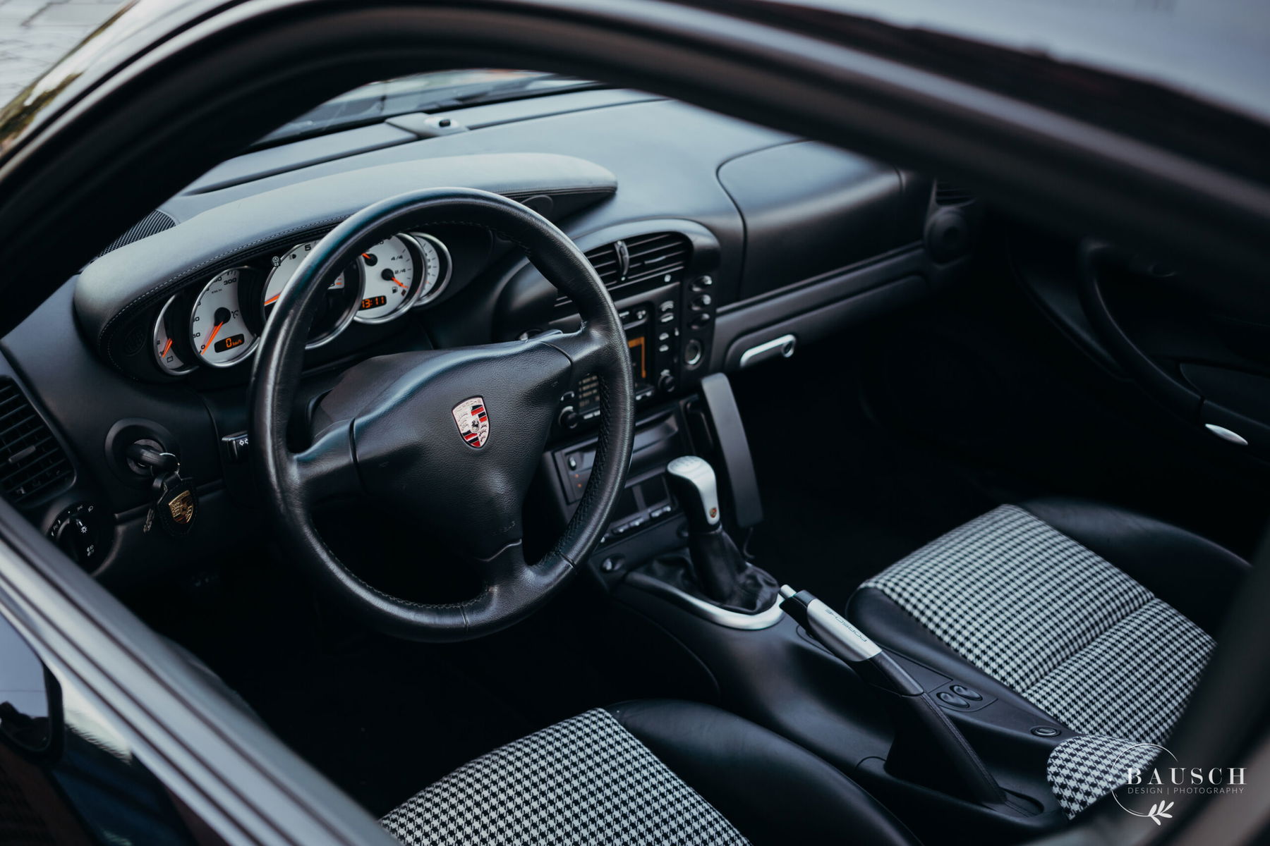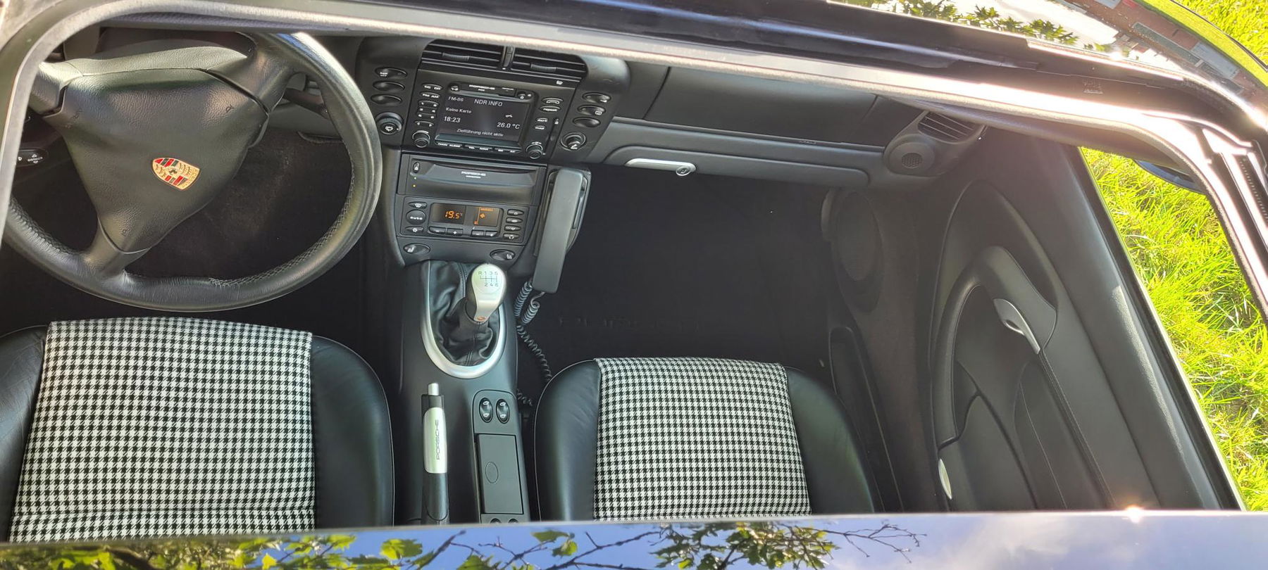 In reminiscence of the old 911s, 4 brand new 18-inch Fuchs rims with colored hub caps were added in 2021, as well as 4 new Michelin tires. I also had the seat center panels and backs of the sports seats covered with typical 911 "houndstooth pepita fabric", a rare feature for this model generation, and incredibly stylish, in my opinion. The Guards Red seat belts are a nice color contrast to the car's original aluminum stainless steel package, and the Porsche umbrella in the passenger side storage compartment is a very rare extra. In the interior, too, there is no longer any sign of the former frugality of the first 996 generation.
