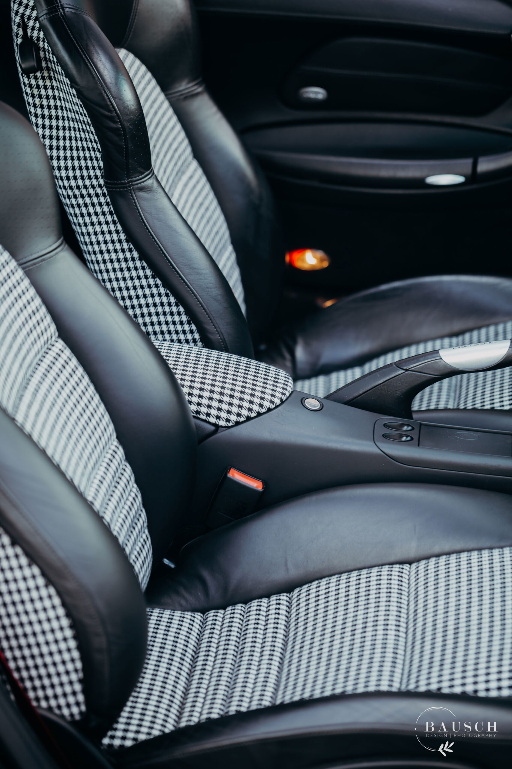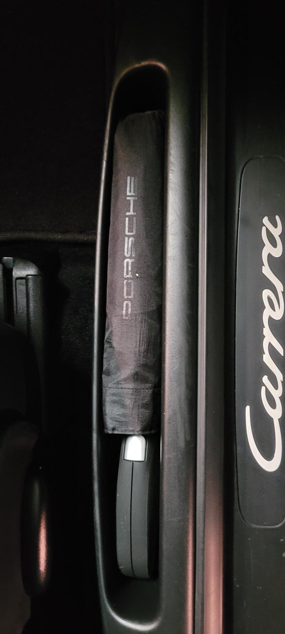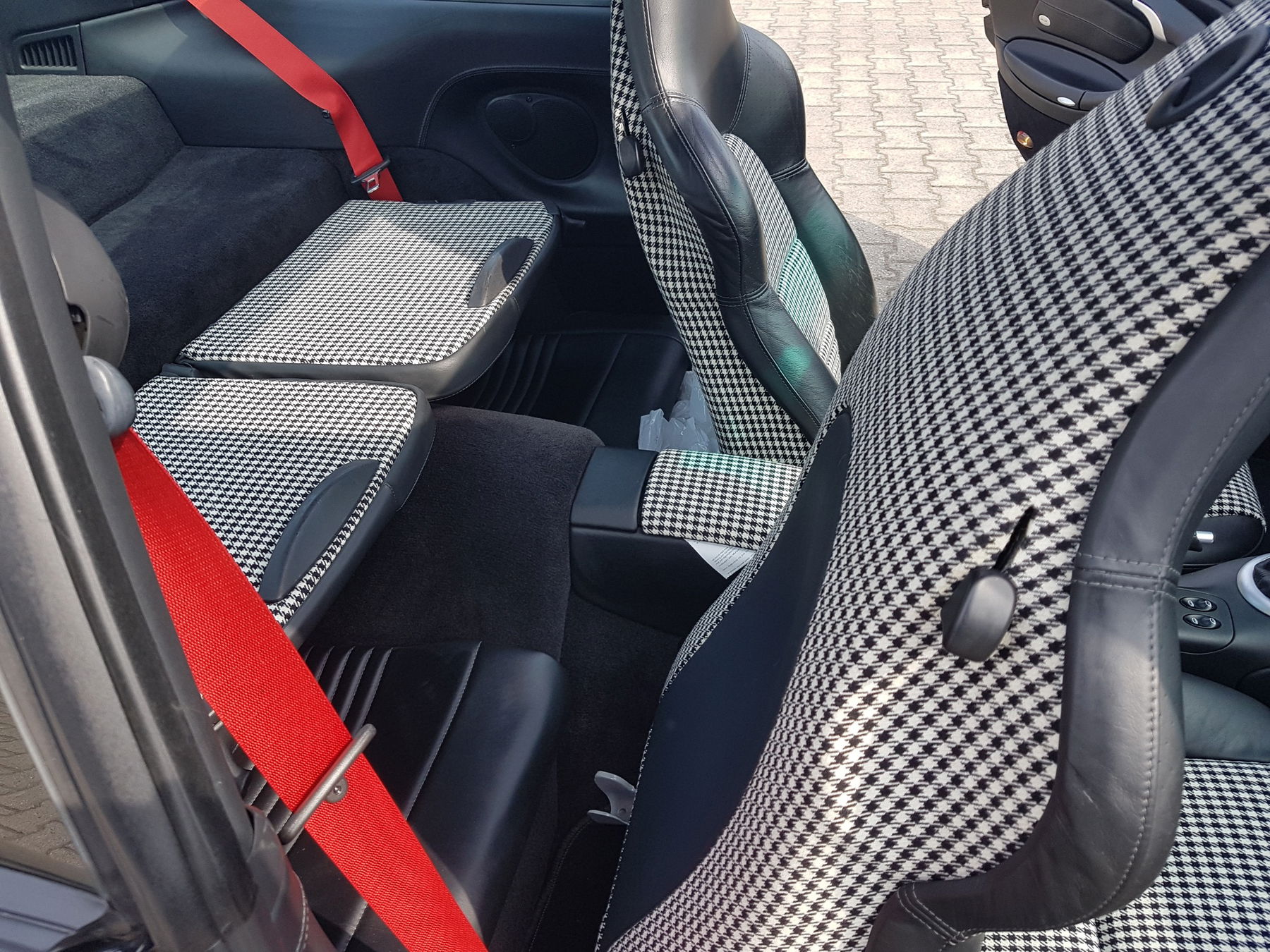 In reminiscence of the old 911s, 4 brand new 18-inch Fuchs rims with colored hub caps were added in 2021, as well as 4 new Michelin tires. I also had the seat center panels and backs of the sports seats covered with typical 911 "houndstooth pepita fabric", a rare feature for this model generation, and incredibly stylish, in my opinion. The Guards Red seat belts are a nice color contrast to the car's original aluminum stainless steel package, and the Porsche umbrella in the passenger side storage compartment is a very rare extra. In the interior, too, there is no longer any sign of the former frugality of the first 996 generation.