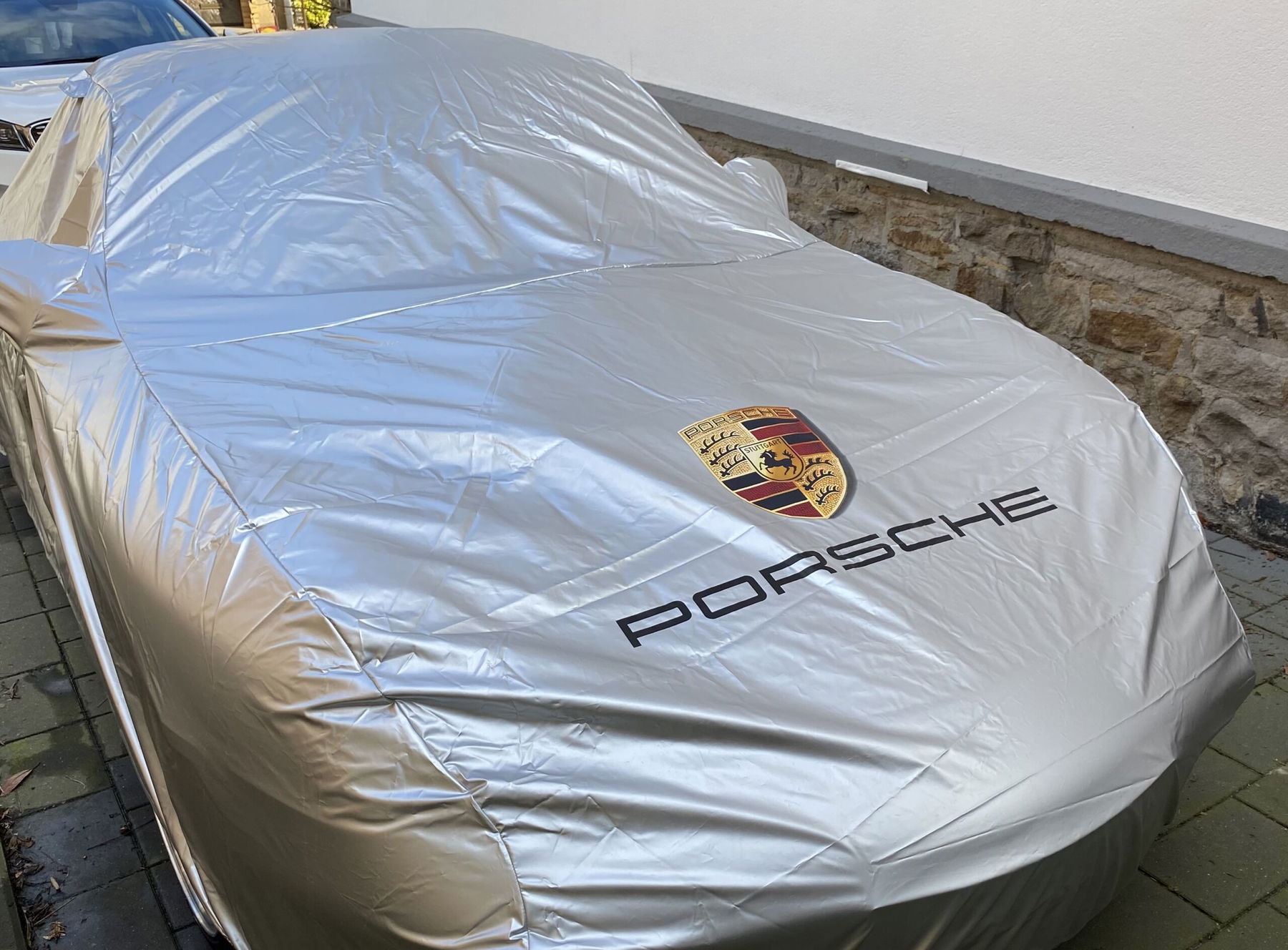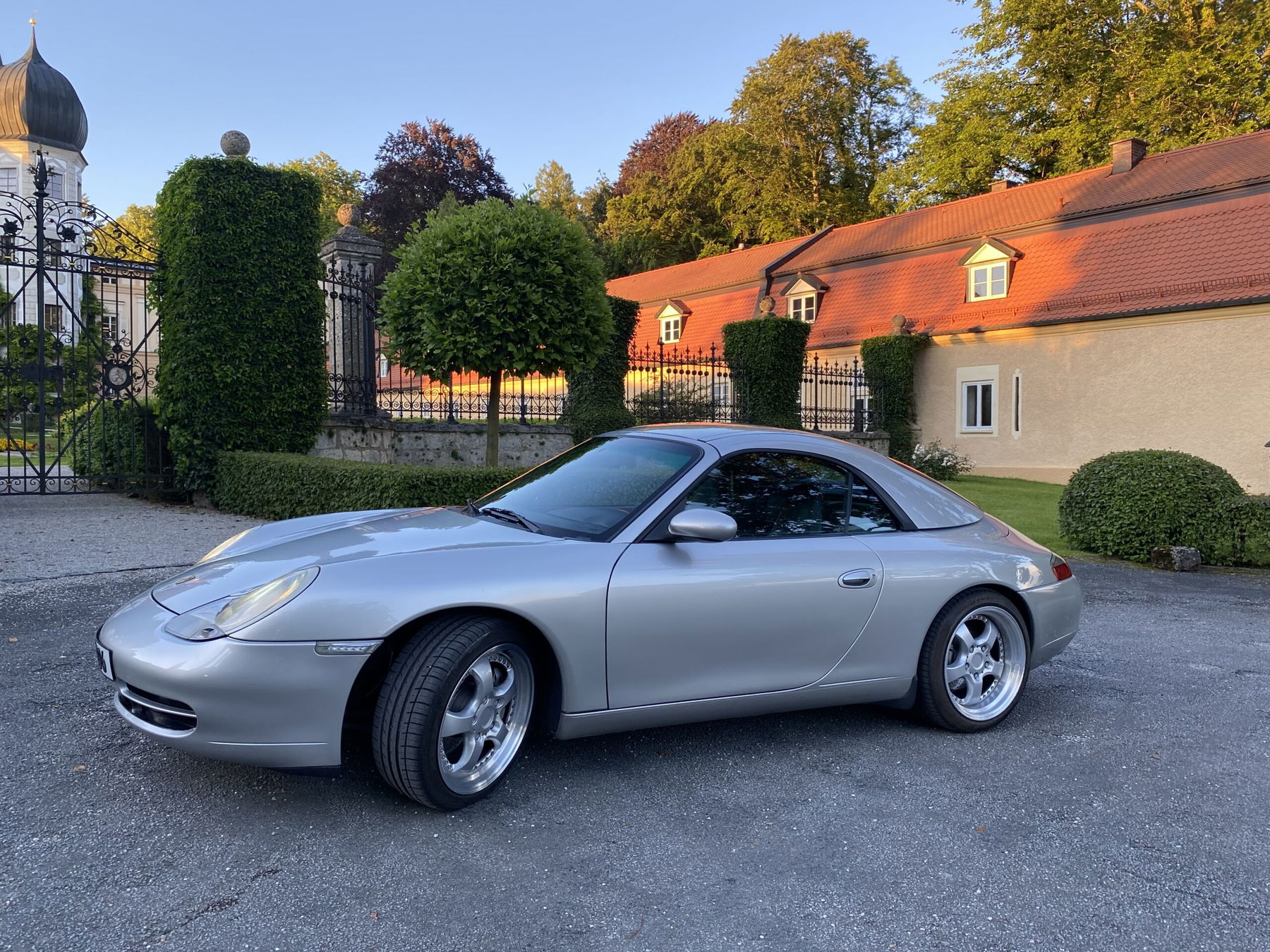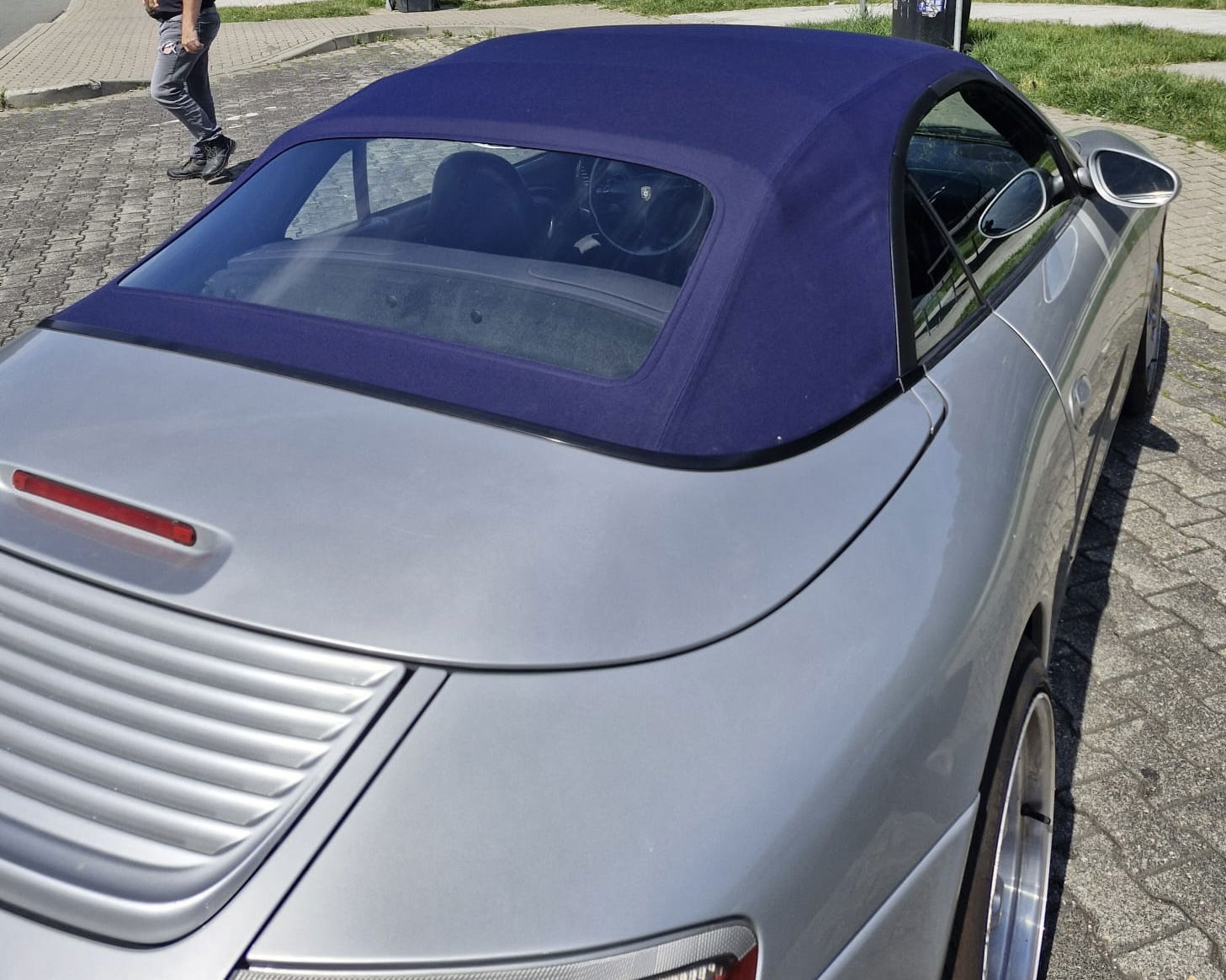 Beautiful silver-colored Cabriolet 911/996 with new blue convertible top cover,