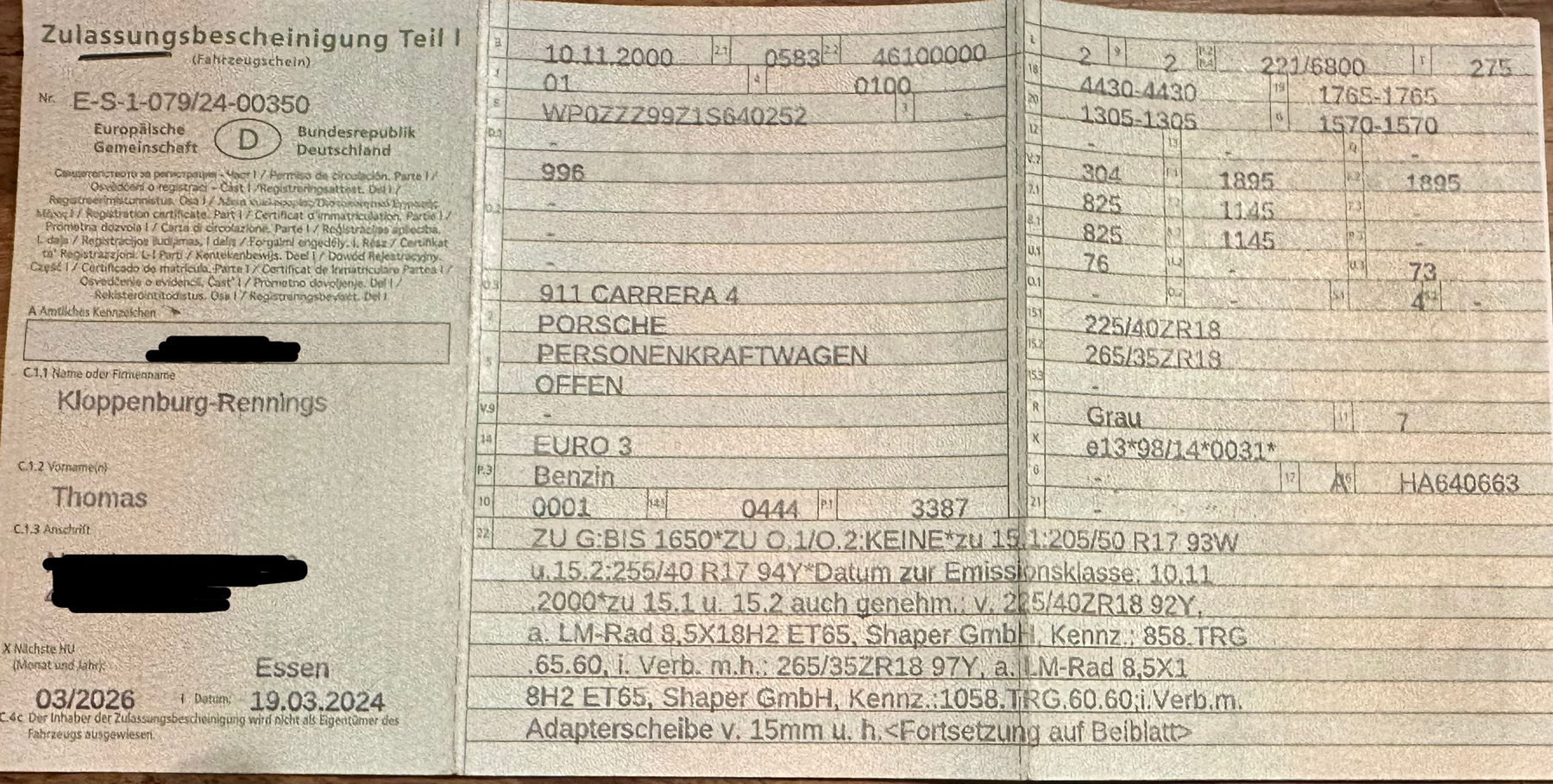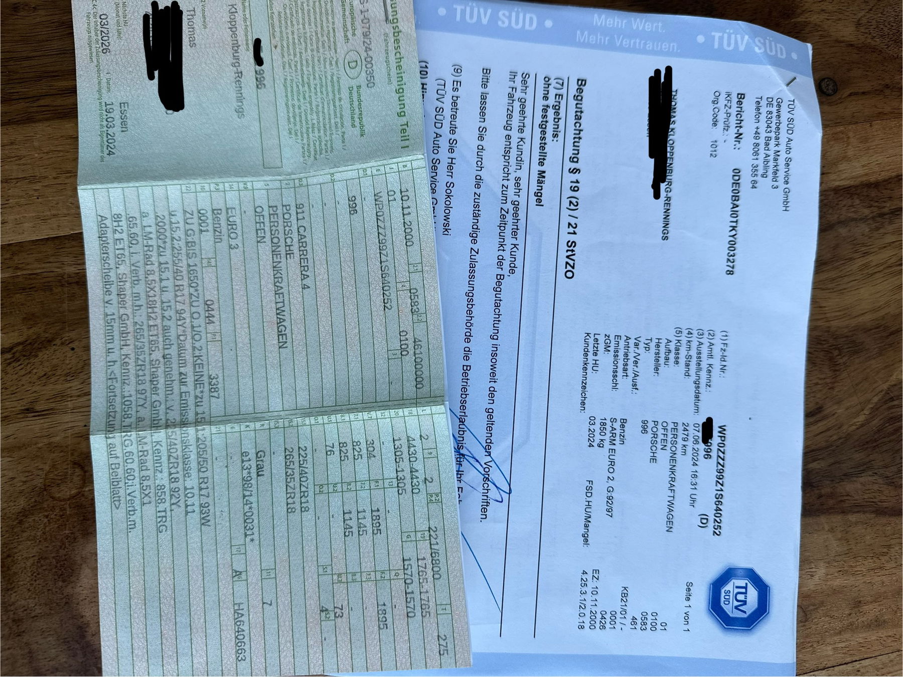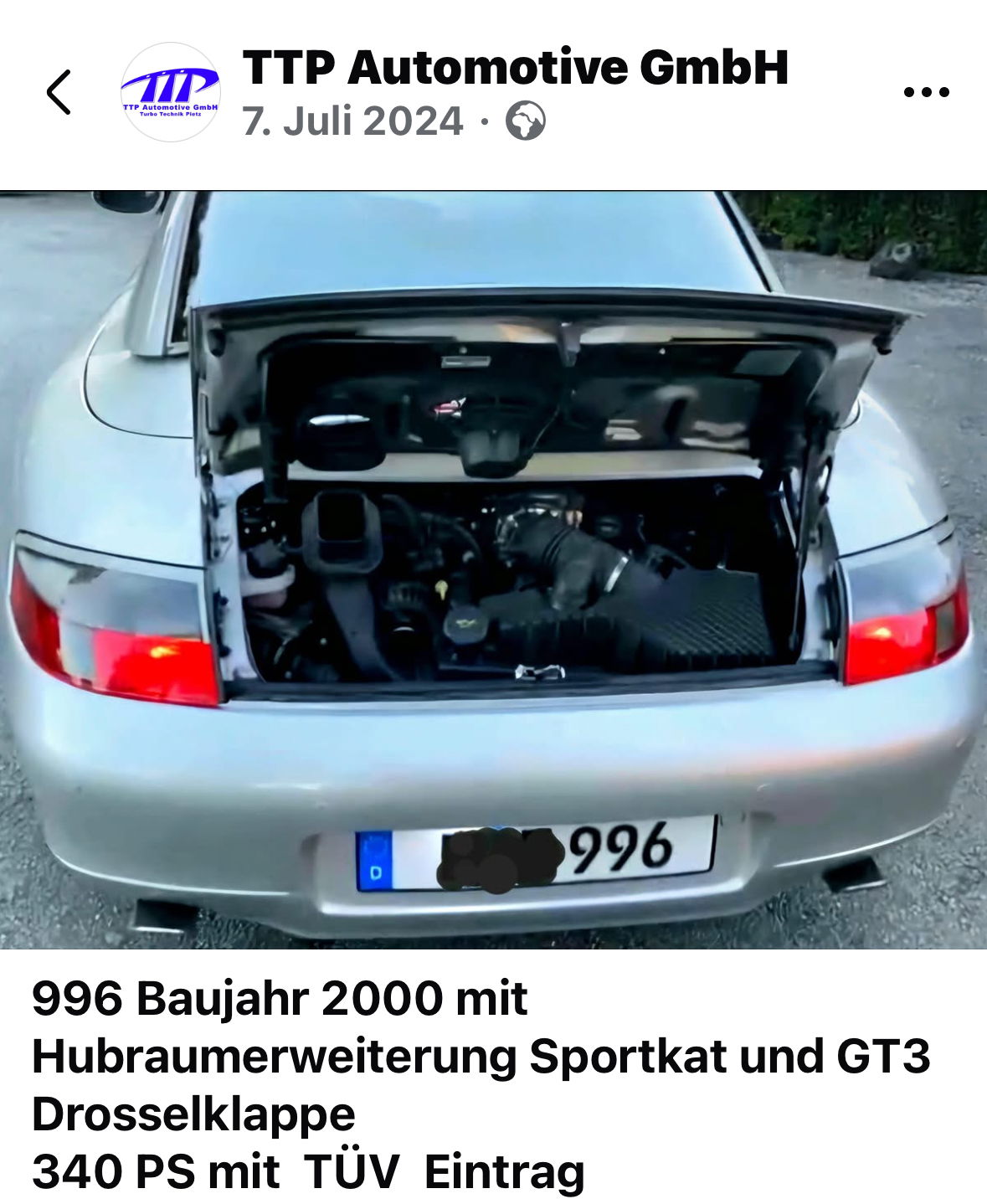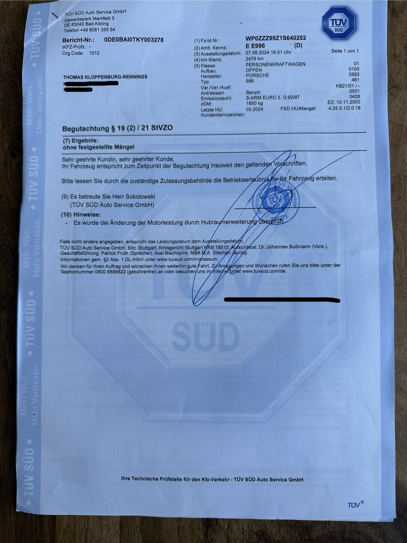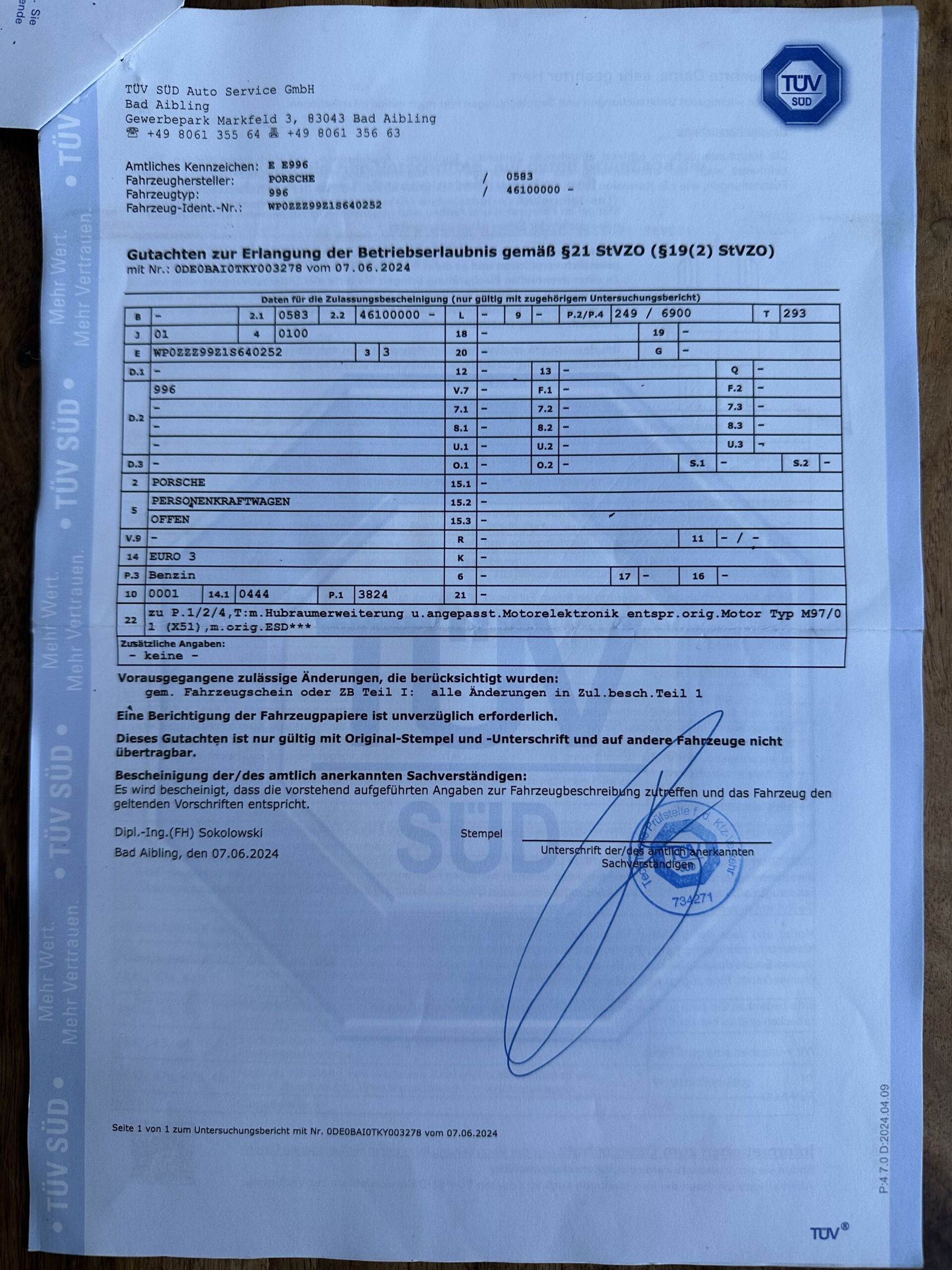 Engine: special displacement expansion TTP to 249kw/6900 / 340hp with measured top speed 293 kph SEE TÜV report, sports catalytic converter, GT3 throttle valve, copper catalytic converter: TÜV approval with lowest emissions, special TTP oil pan recess, 03/2024 complete engine overhaul, new radiators, new hoses, proven maintenance, new suspension adjustment, 26,000€ investment, currently all-weather/winter tires, 2 hardtops.